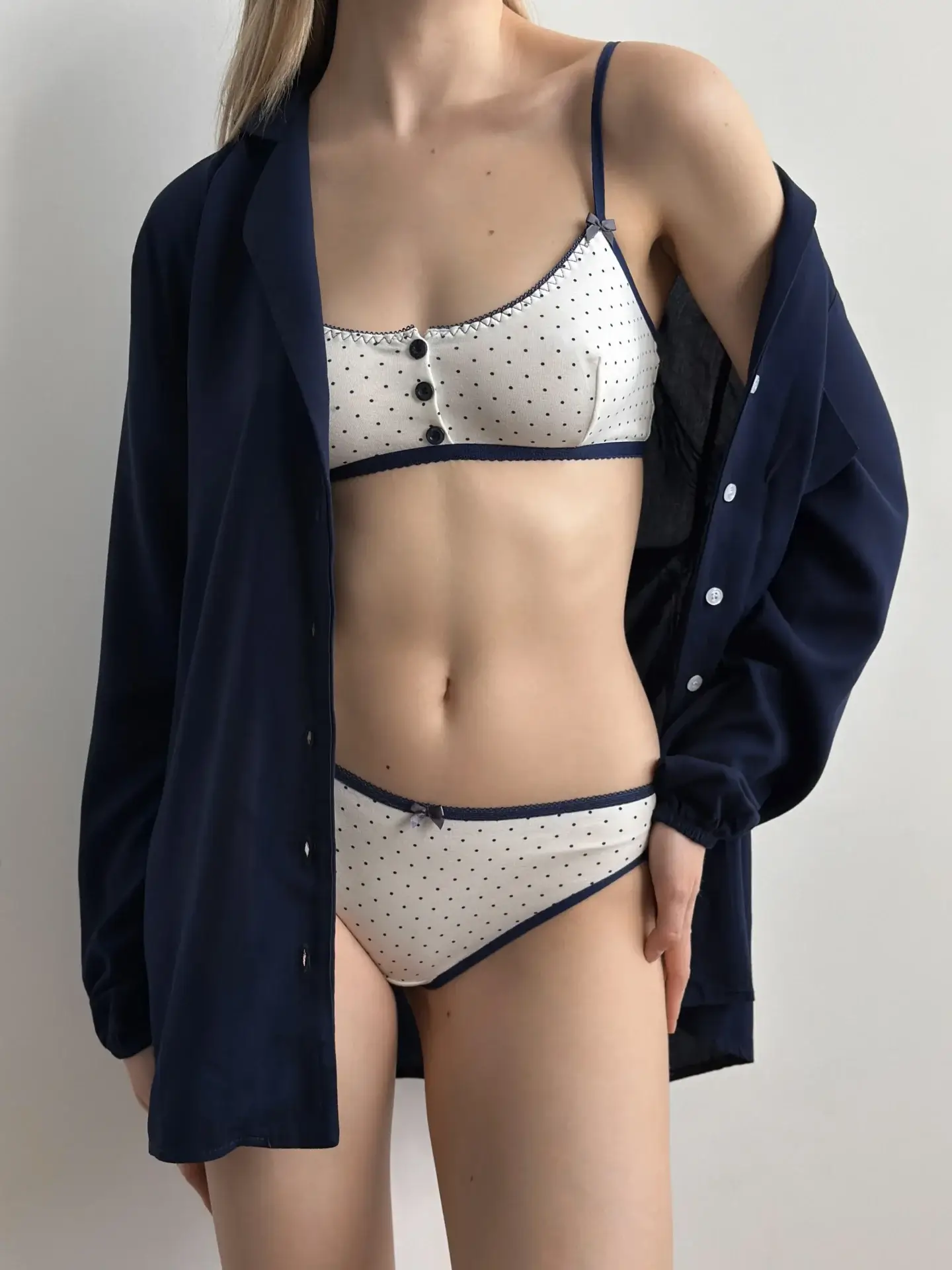 Top braletka z dzianiny, biały w granatowe groszki