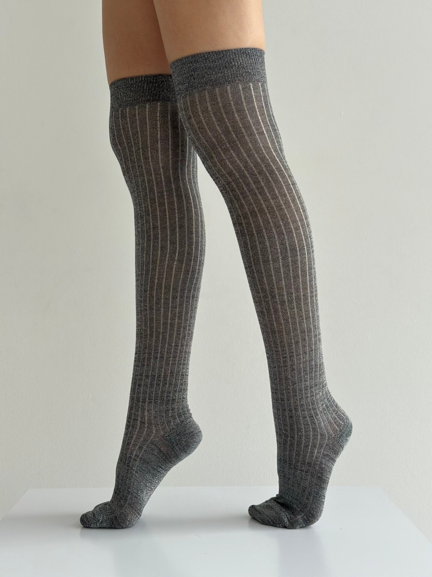 Wysokie getry z lureksem łączą styl i komfort. Miękki, połyskujący materiał tworzy efektowny wygląd i dodaje stylizacji odświętnego charakteru.