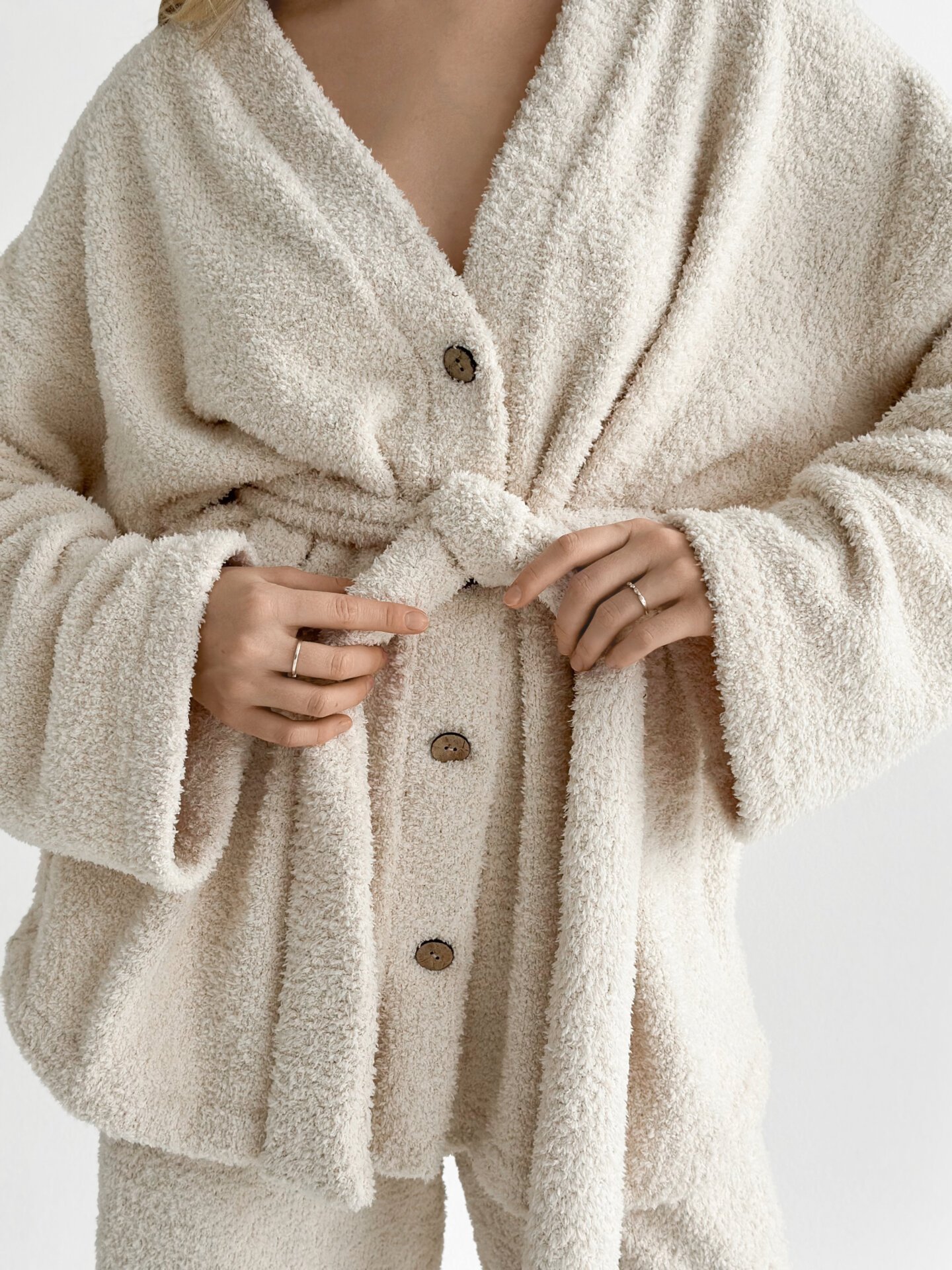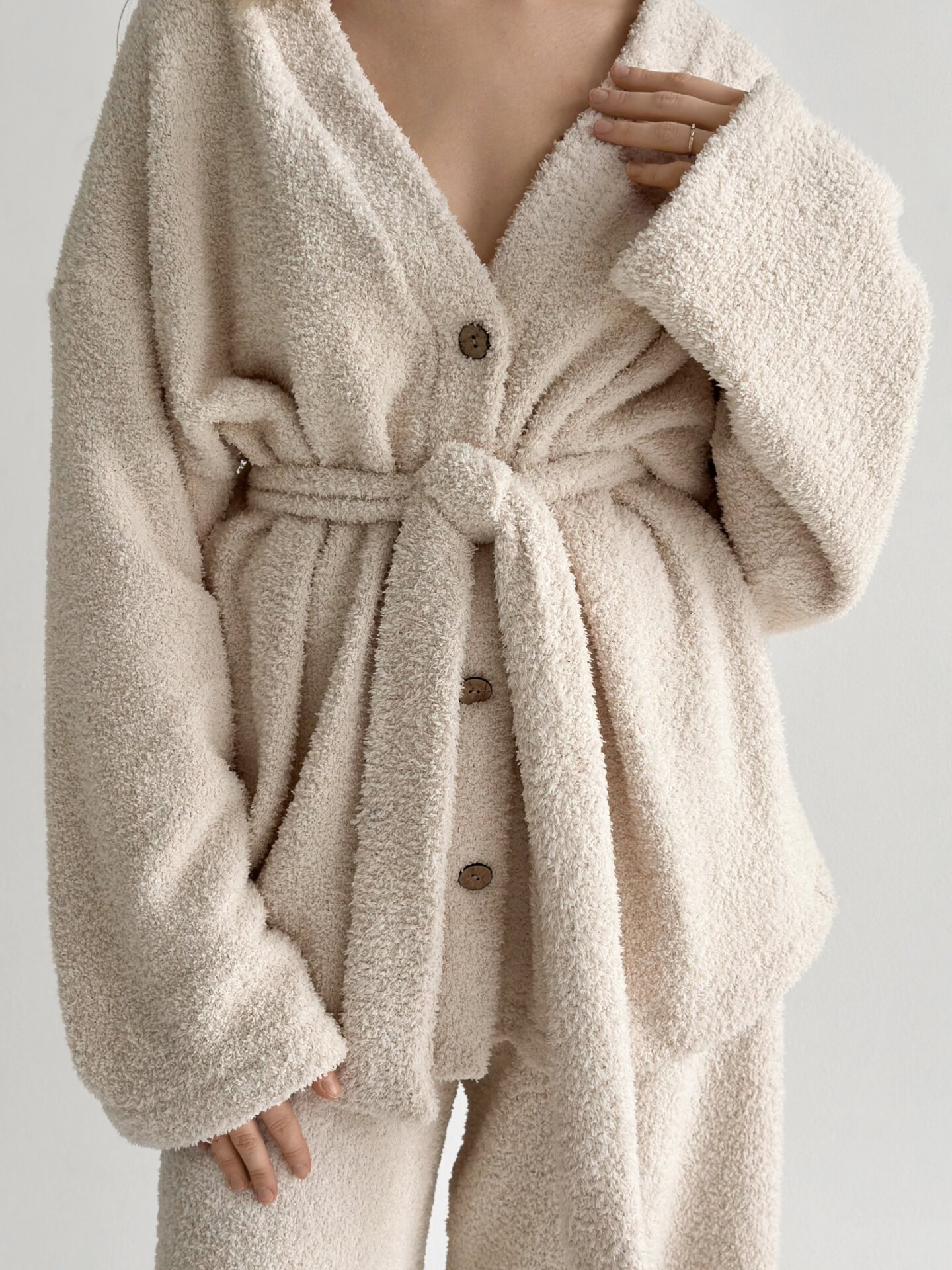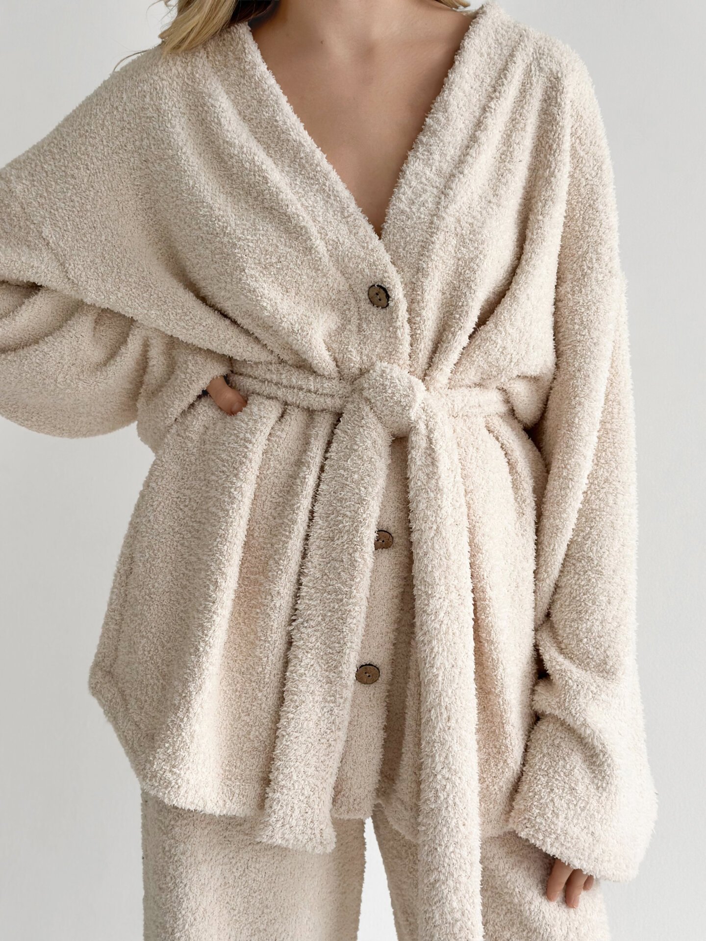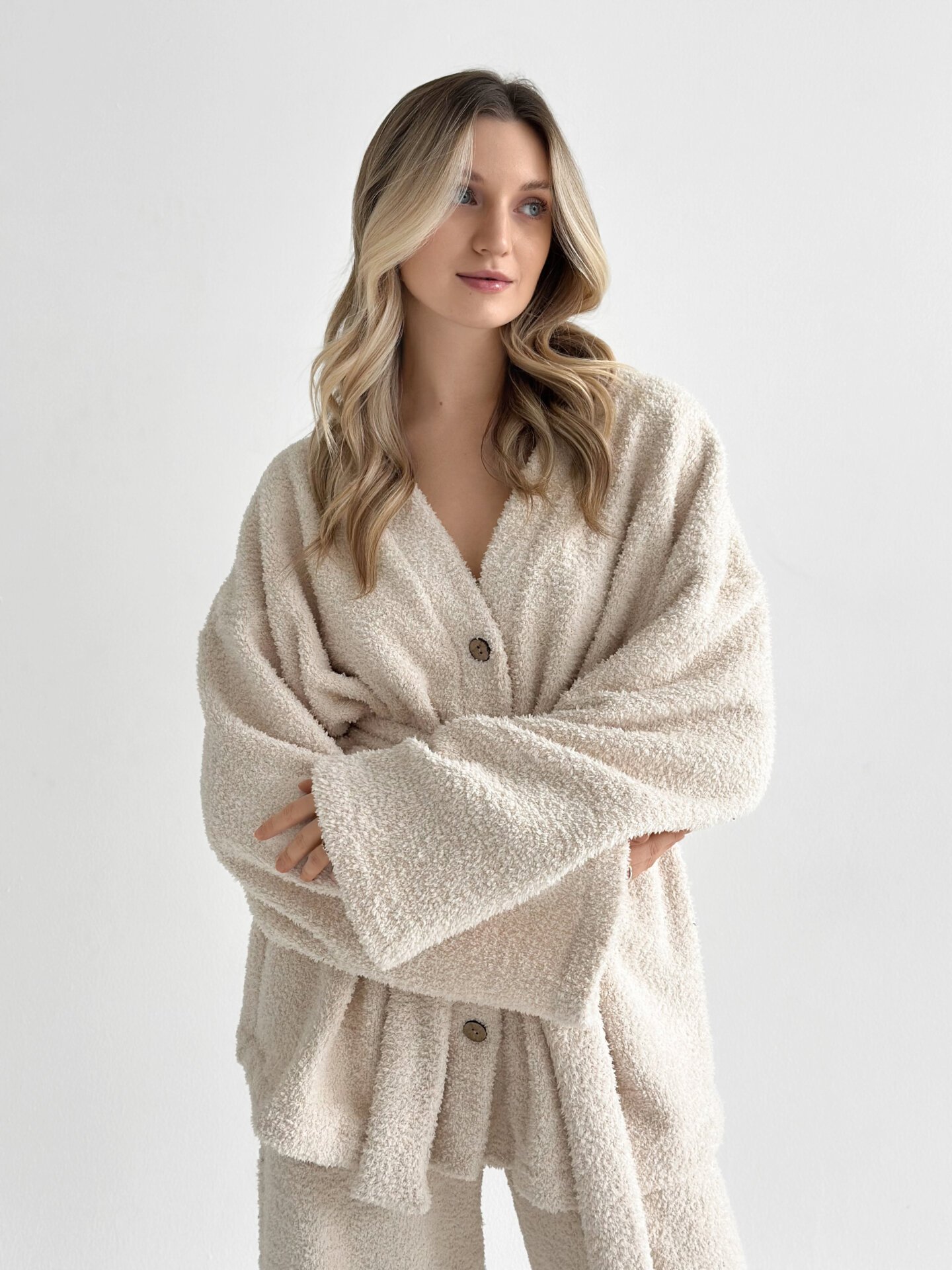 Miękka i przyjemna w dotyku bluza z frotty zapewnia komfort w każdy dzień. Wygodny krój i guziki z przodu sprawiają, że jest praktyczna i jednocześnie stylowa. Idealny wybór na domowy relaks i codzienne stylizacje.
