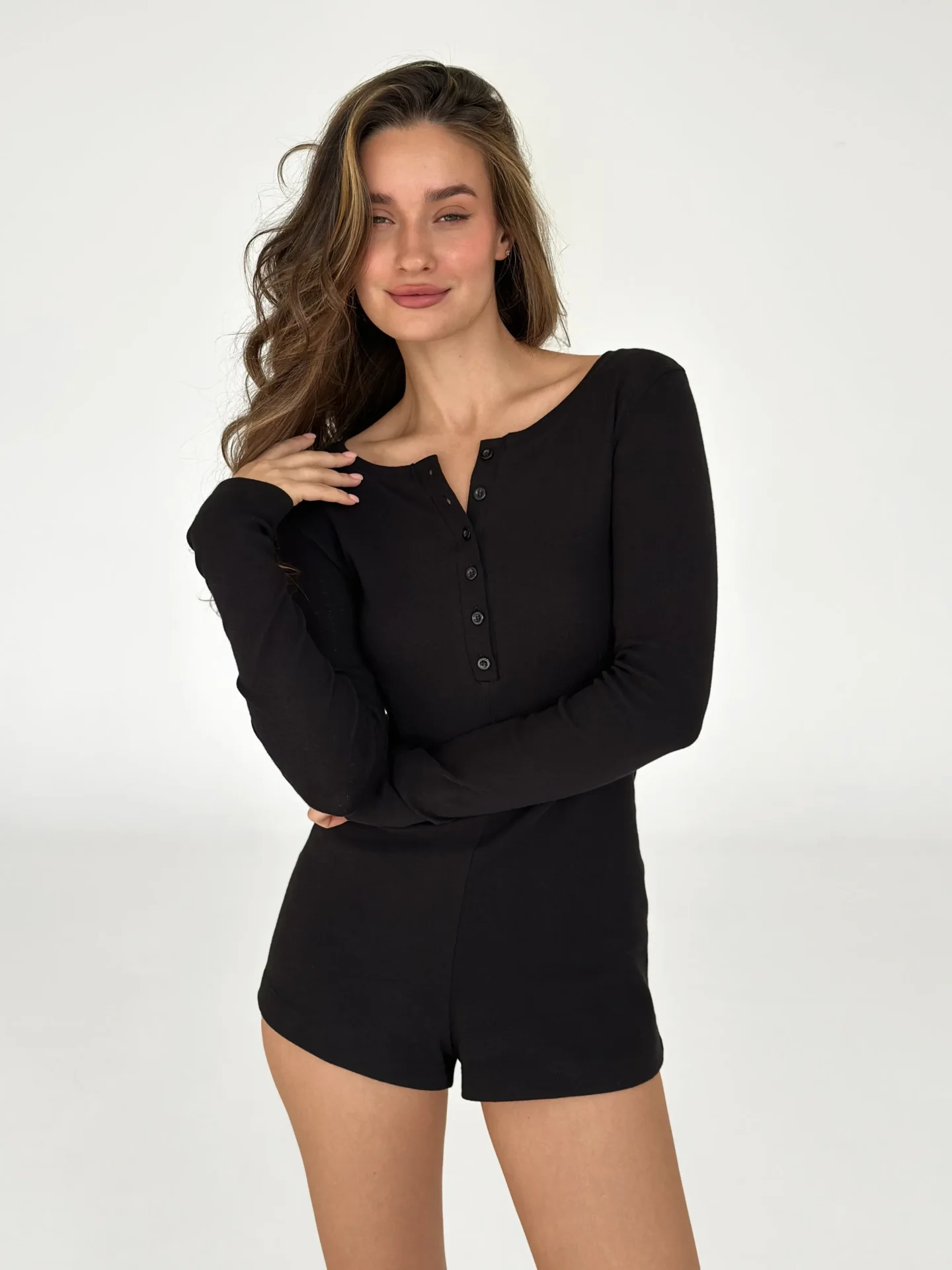 Kombinezon z dzianiny prążkowanej z długim rękawem łączy komfort z elegancką prostotą. Elastyczny, miękki materiał przyjemnie przylega do ciała, zapewniając swobodę ruchów. Prosty krój podkreśla sylwetkę, a długie rękawy dodają przytulności. Idealny wybór na domowy relaks lub stylowe codzienne stylizacje.