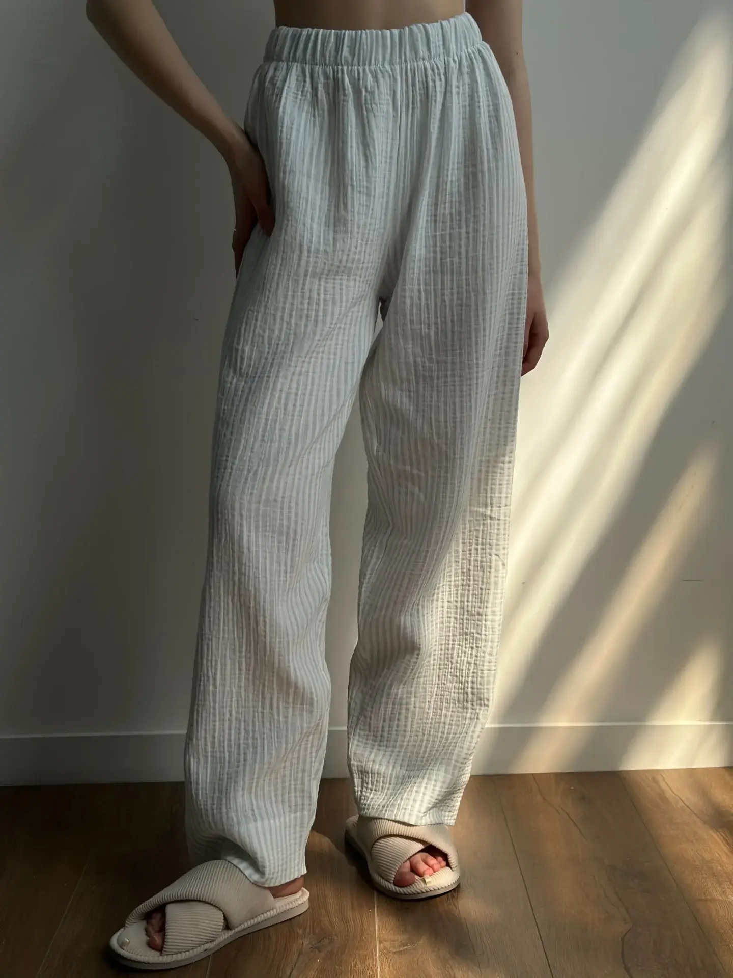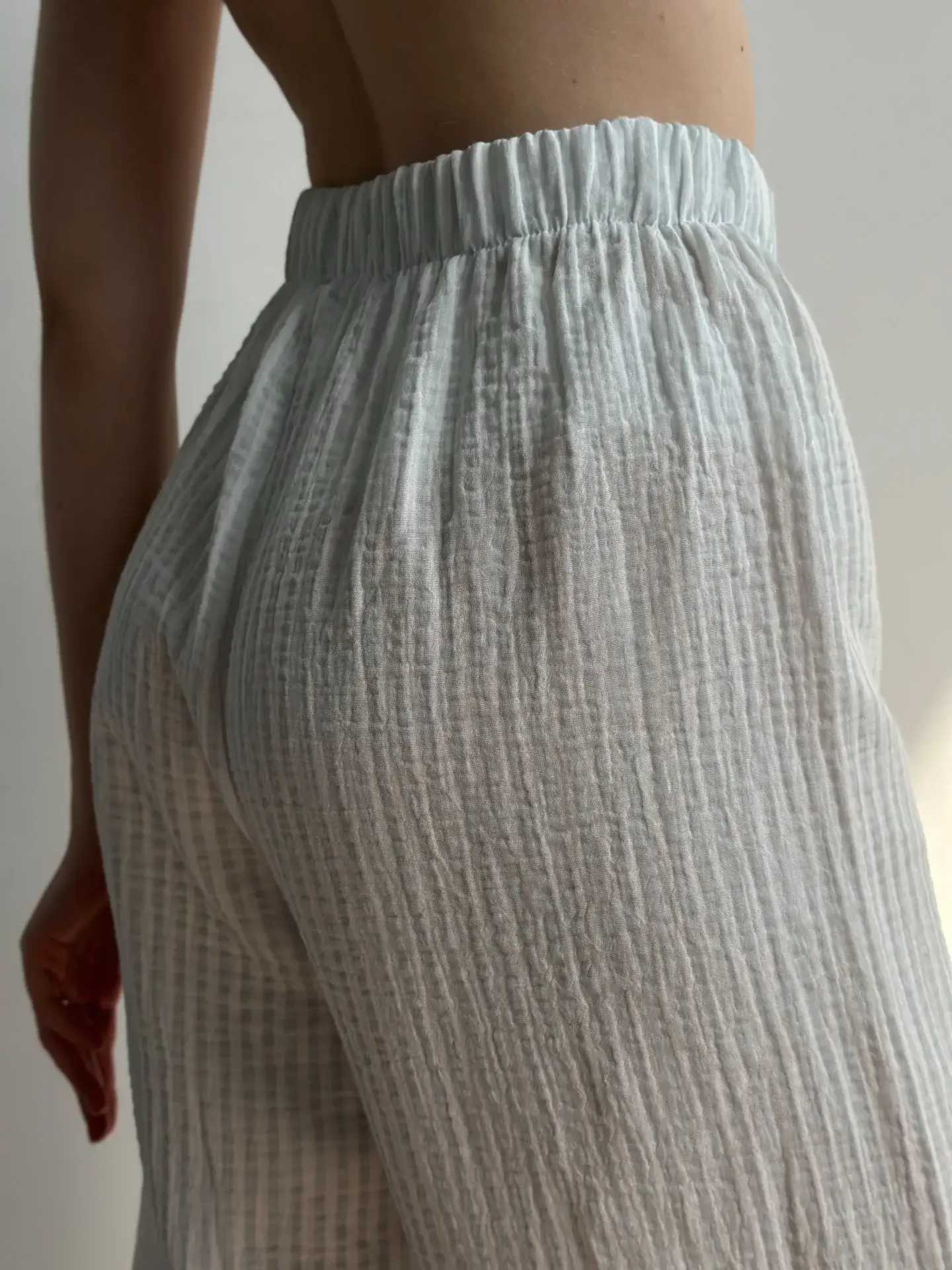 Komplet koszula i spodnie z muślinu to lekka wersja domowa, zapewniająca komfort noszenia na co dzień. Naturalny, miękki materiał jest przyjemny w dotyku i dobrze przepuszcza powietrze.