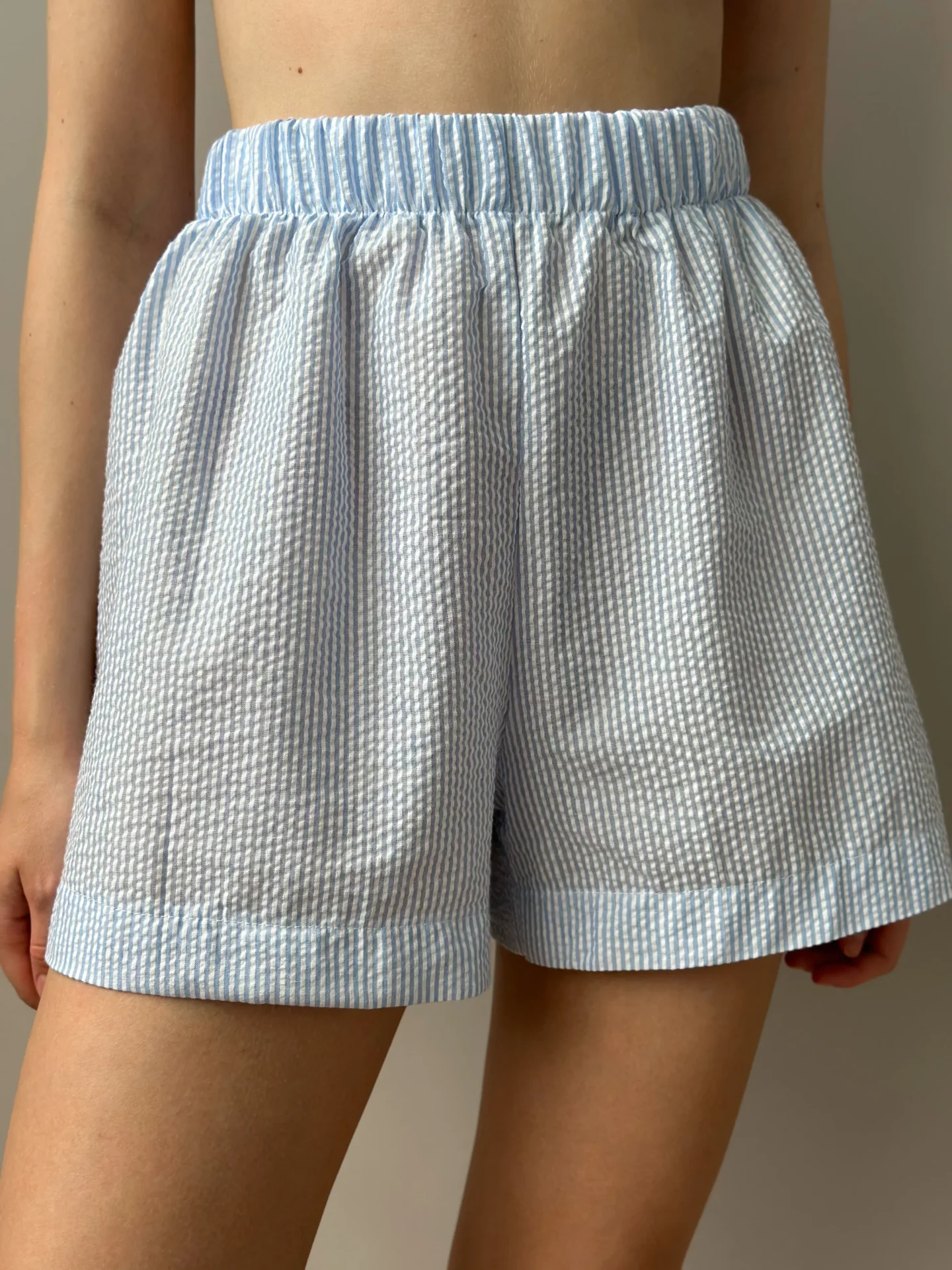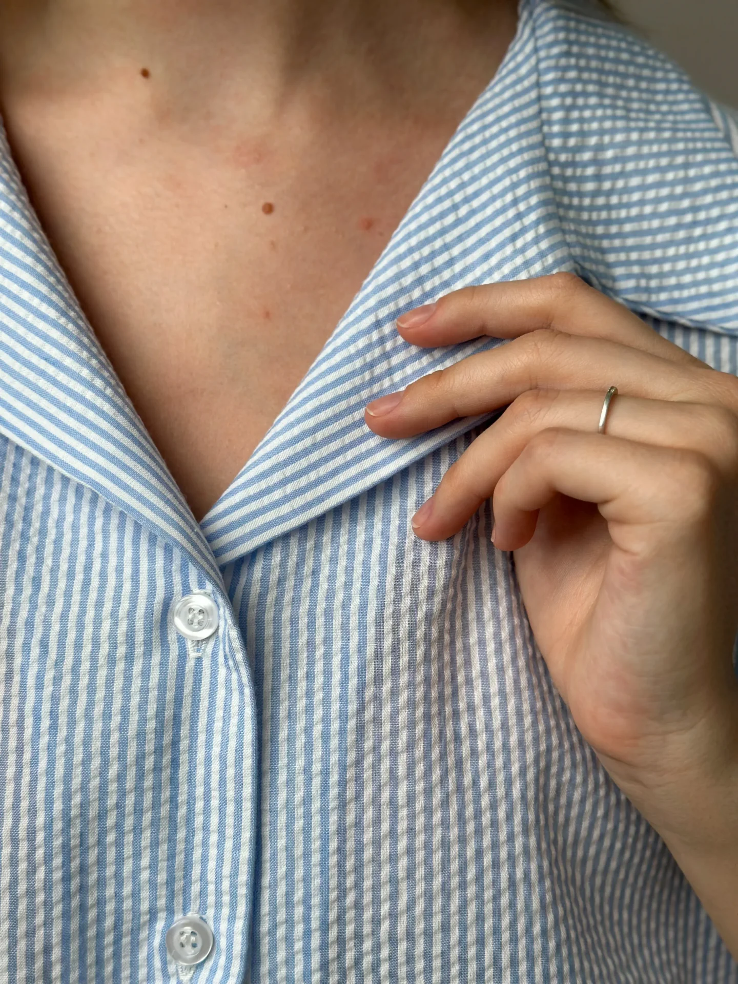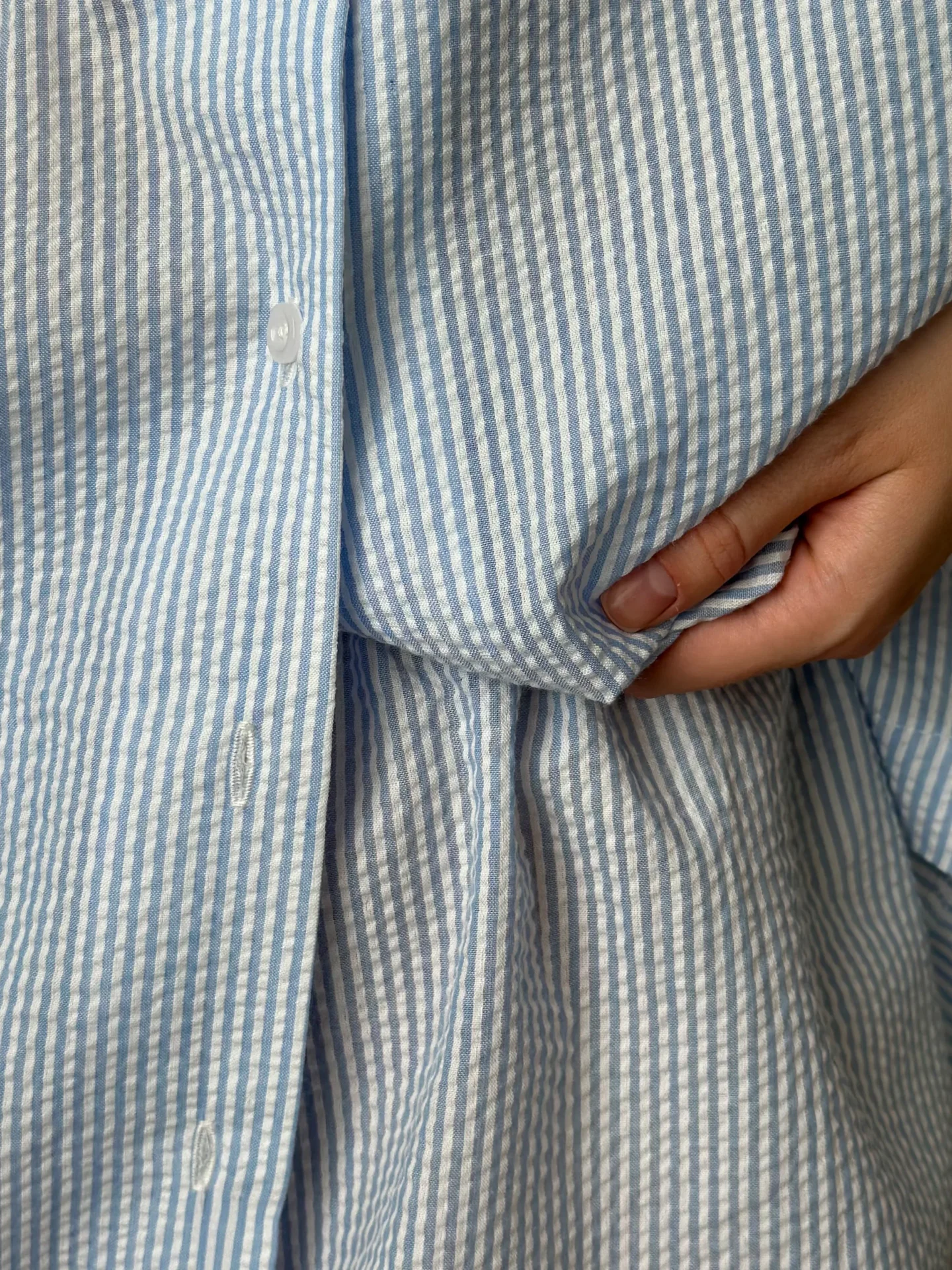 Komplet z bawełnianej tkaniny żakardowej składa się z koszuli i szortów w paski. Lekka, przewiewna tkanina jest przyjemna w dotyku i odpowiednia na ciepłe dni. Luźny krój tworzy swobodną sylwetkę, a paski dodają stylizacji świeżości i lekkości. Komplet idealnie nadaje się na spacery, odpoczynek i codzienne letnie stylizacje.