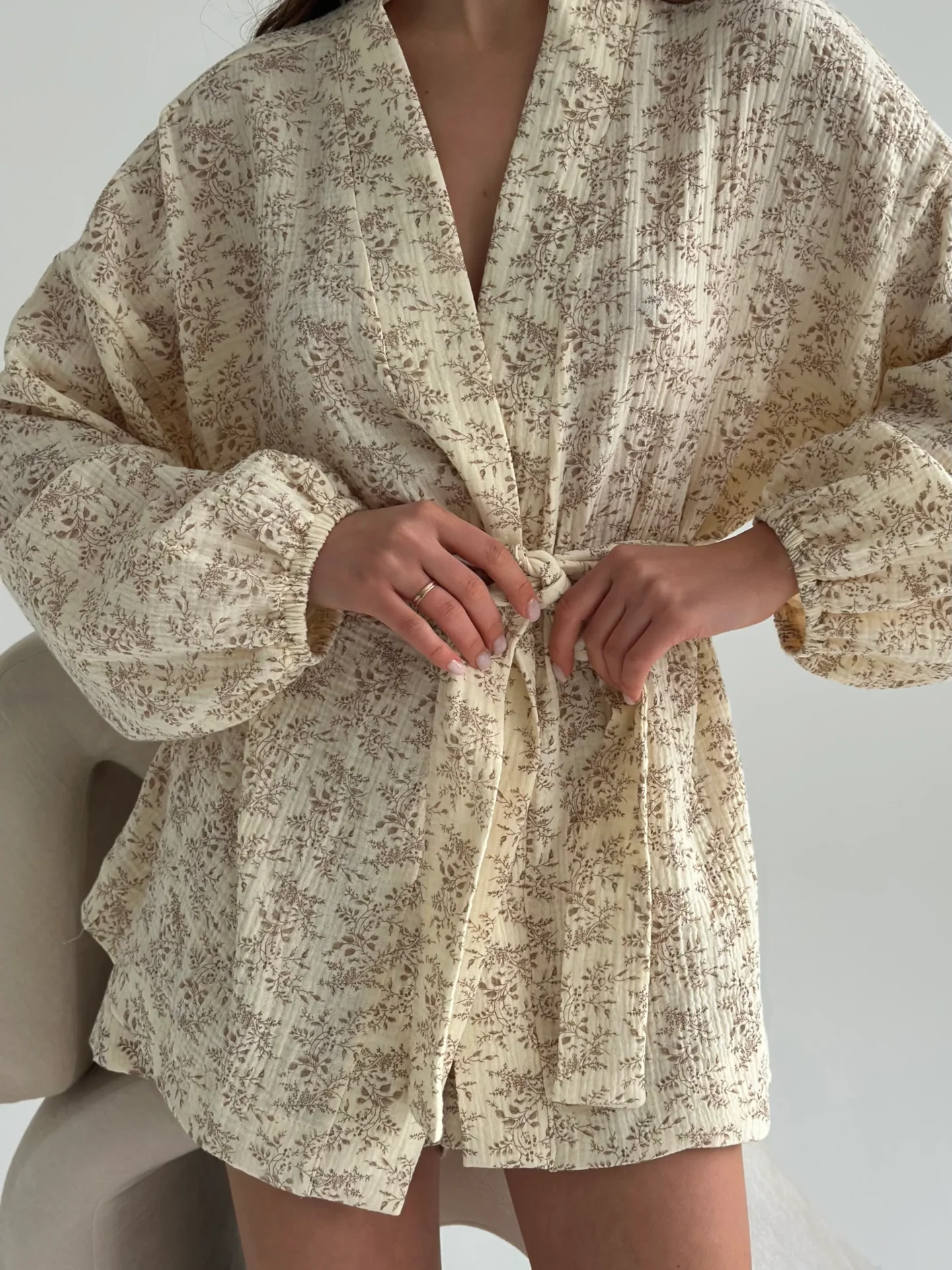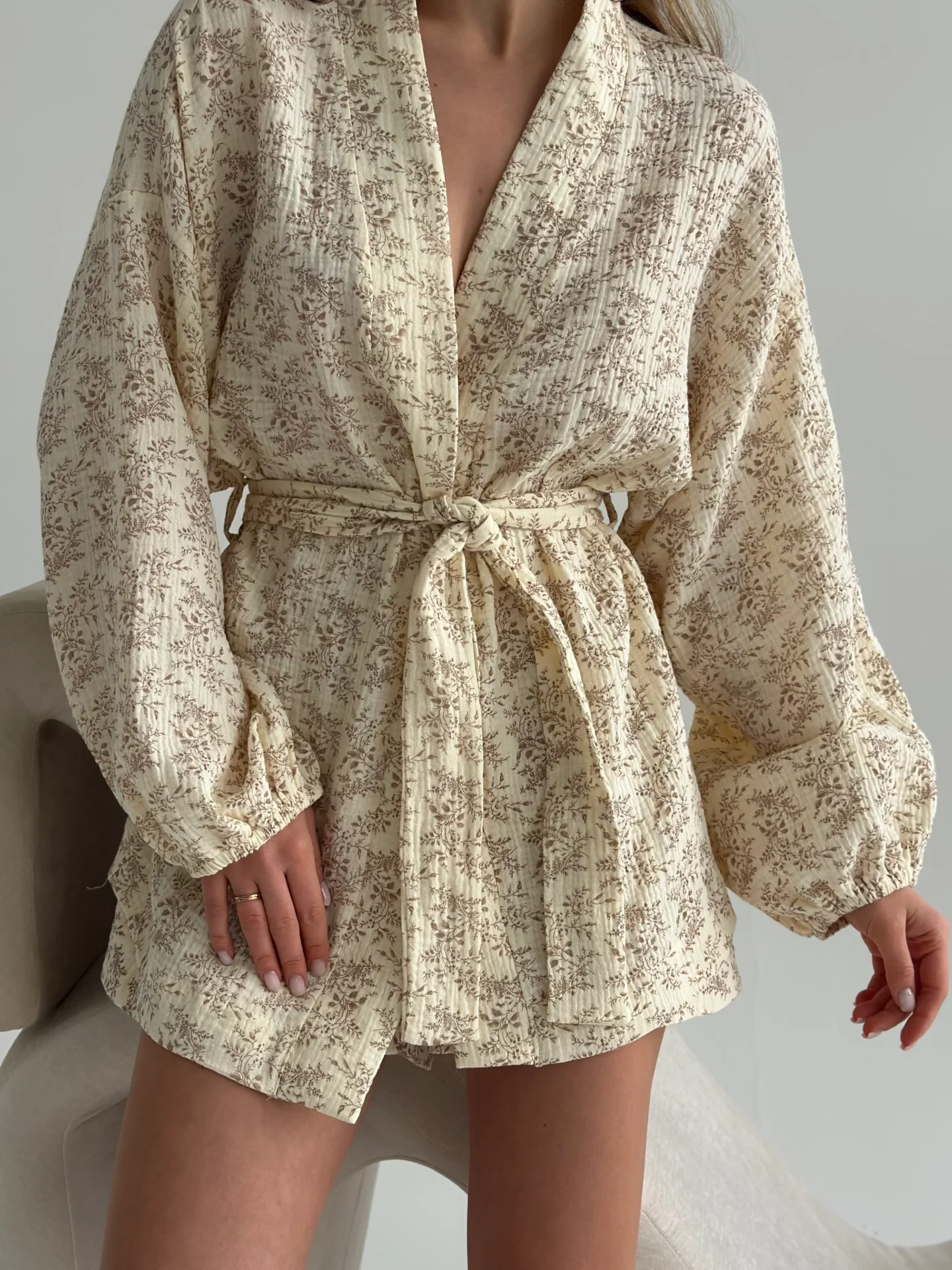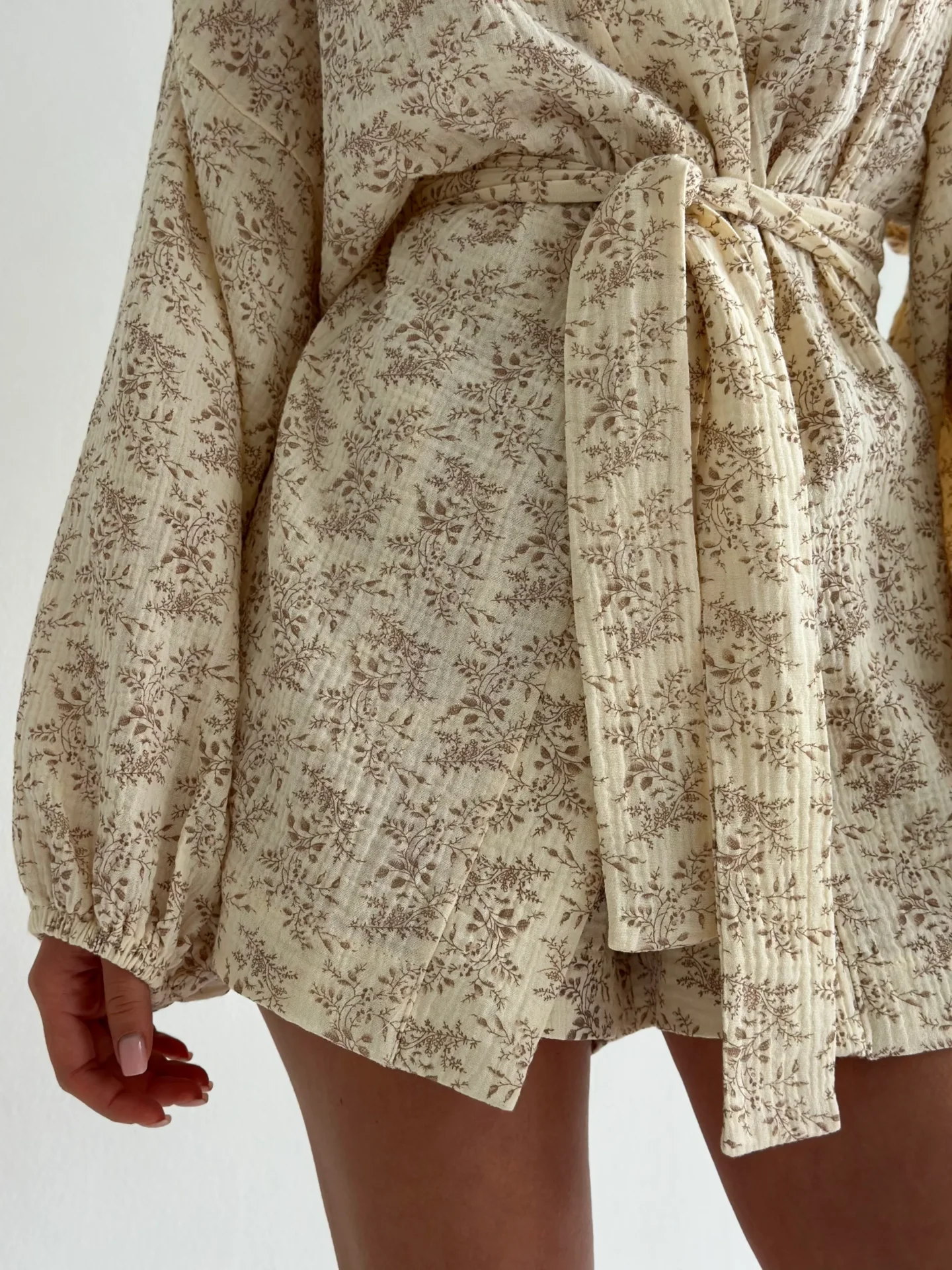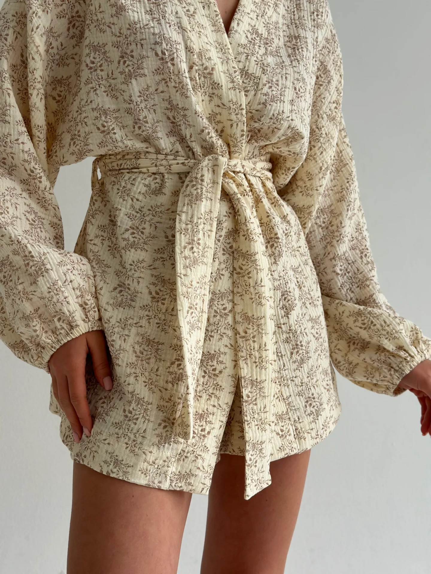 Komplet z muślinu składający się z koszuli i szortów. Lekki, przewiewny i przyjemny w dotyku, zapewnia komfort w codziennym noszeniu. Minimalistyczny krój nadaje stylizacji delikatności i elegancji.
