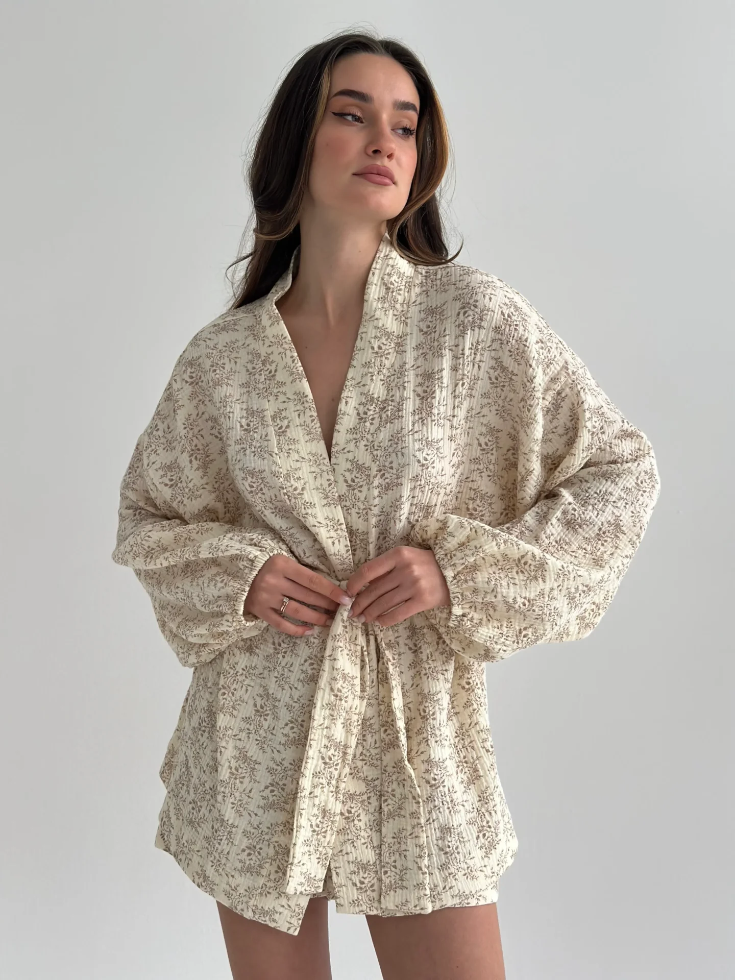 Komplet koszula i szorty z muślinu dwuwarstwowego, ecru w brązowe polne kwiaty