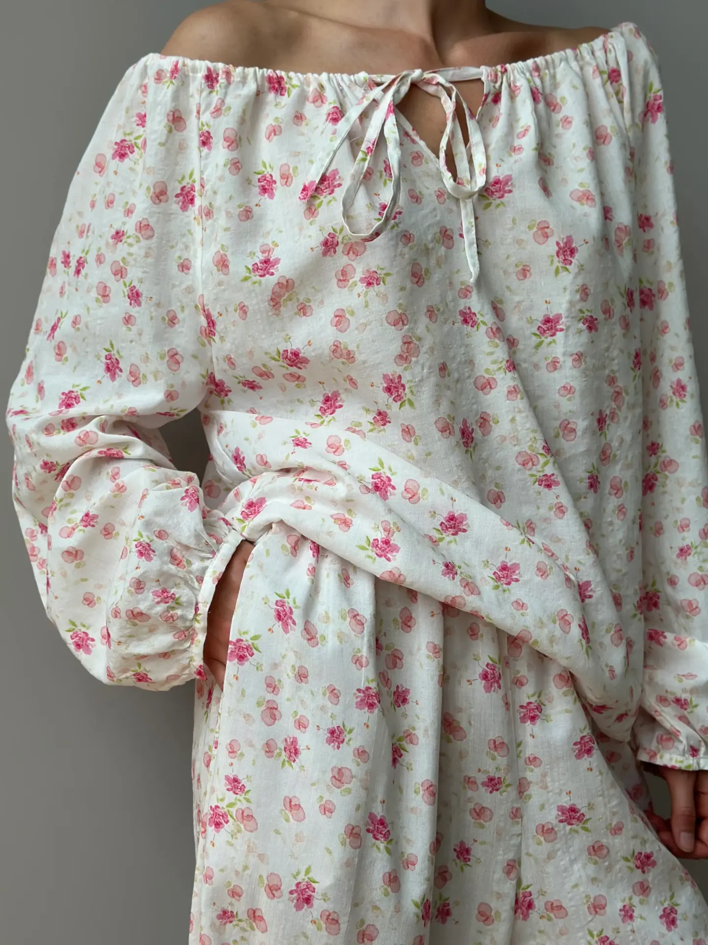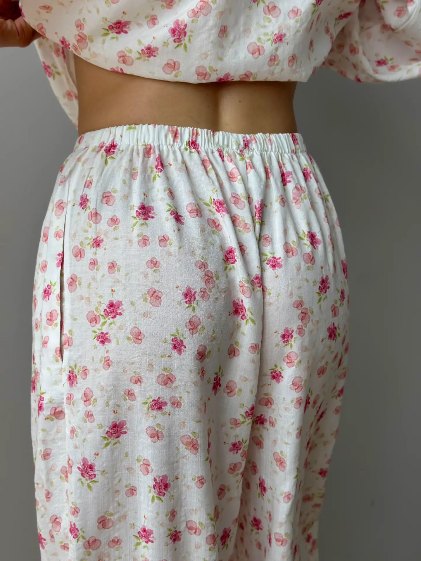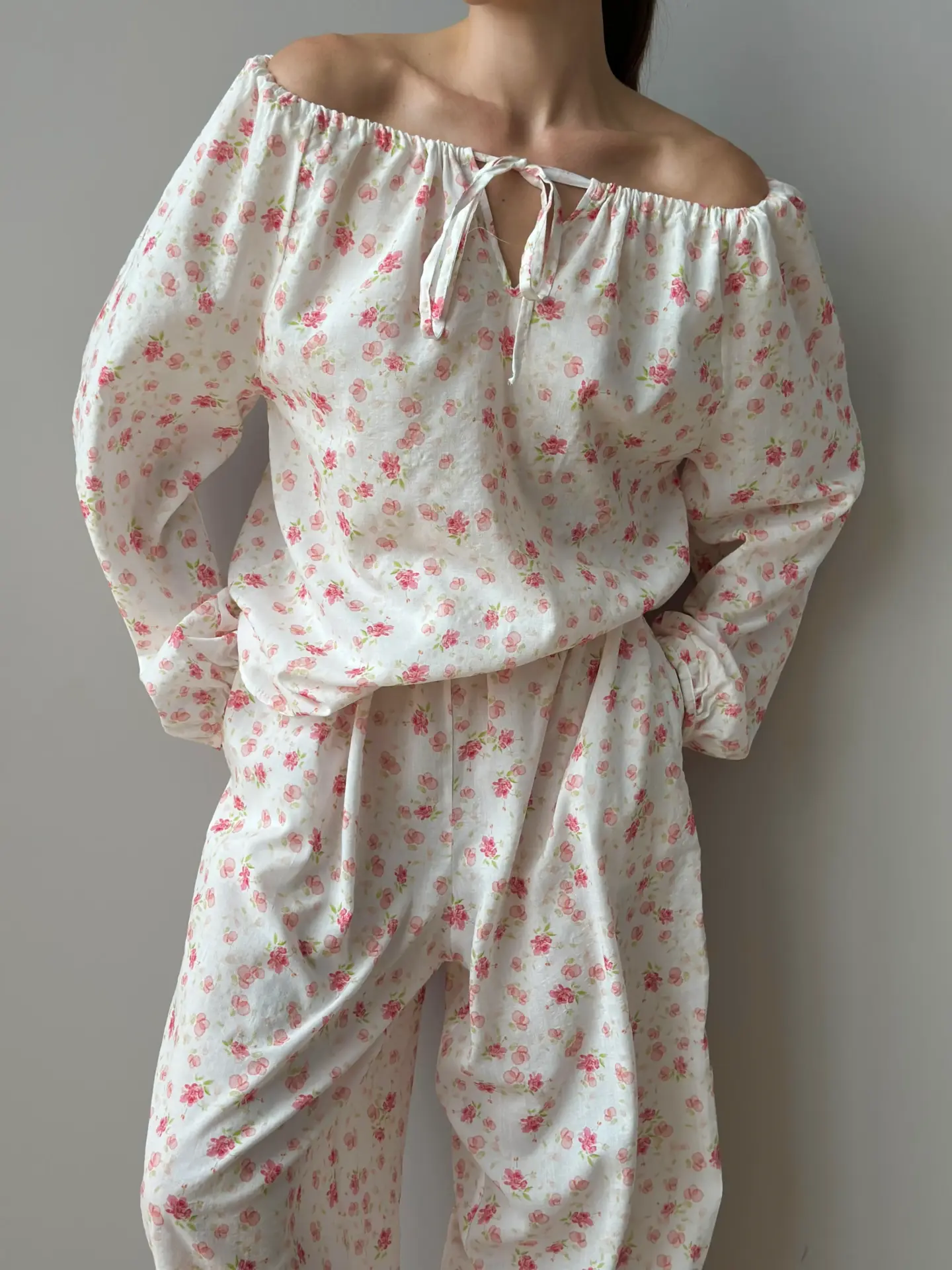 Komplet: koszula z tunelem i spodnie szarawary z batystu — lekki i komfortowy zestaw na letnie dni. Koszula z tunelem pozwala regulować objętość i tworzyć różne sylwetki, a luźne szarawary zapewniają swobodę ruchów i maksymalny komfort. Batystowa tkanina jest delikatna, oddychająca i przyjemna dla ciała. Idealny wybór na wypoczynek, spacery lub swobodne miejskie stylizacje.