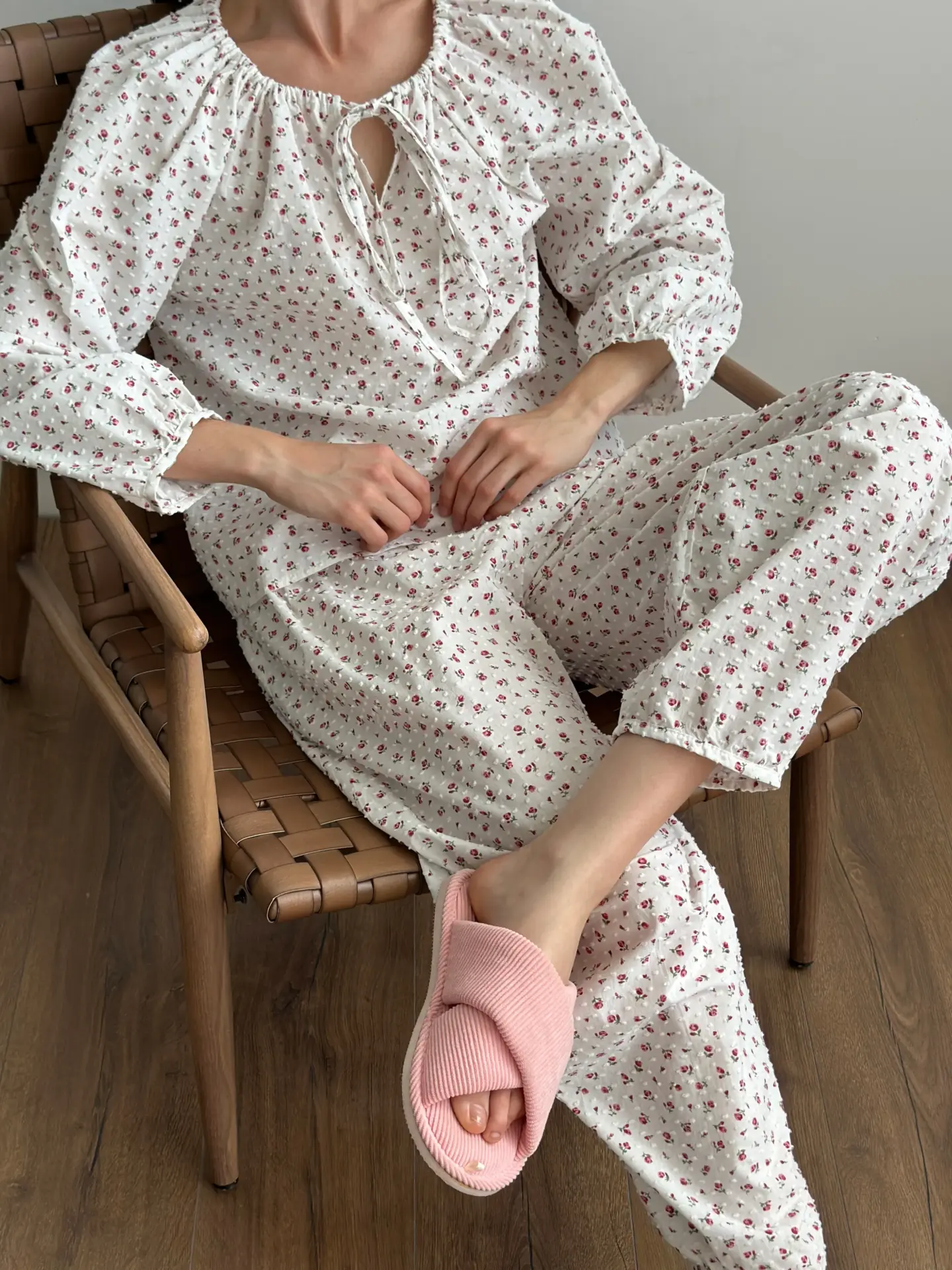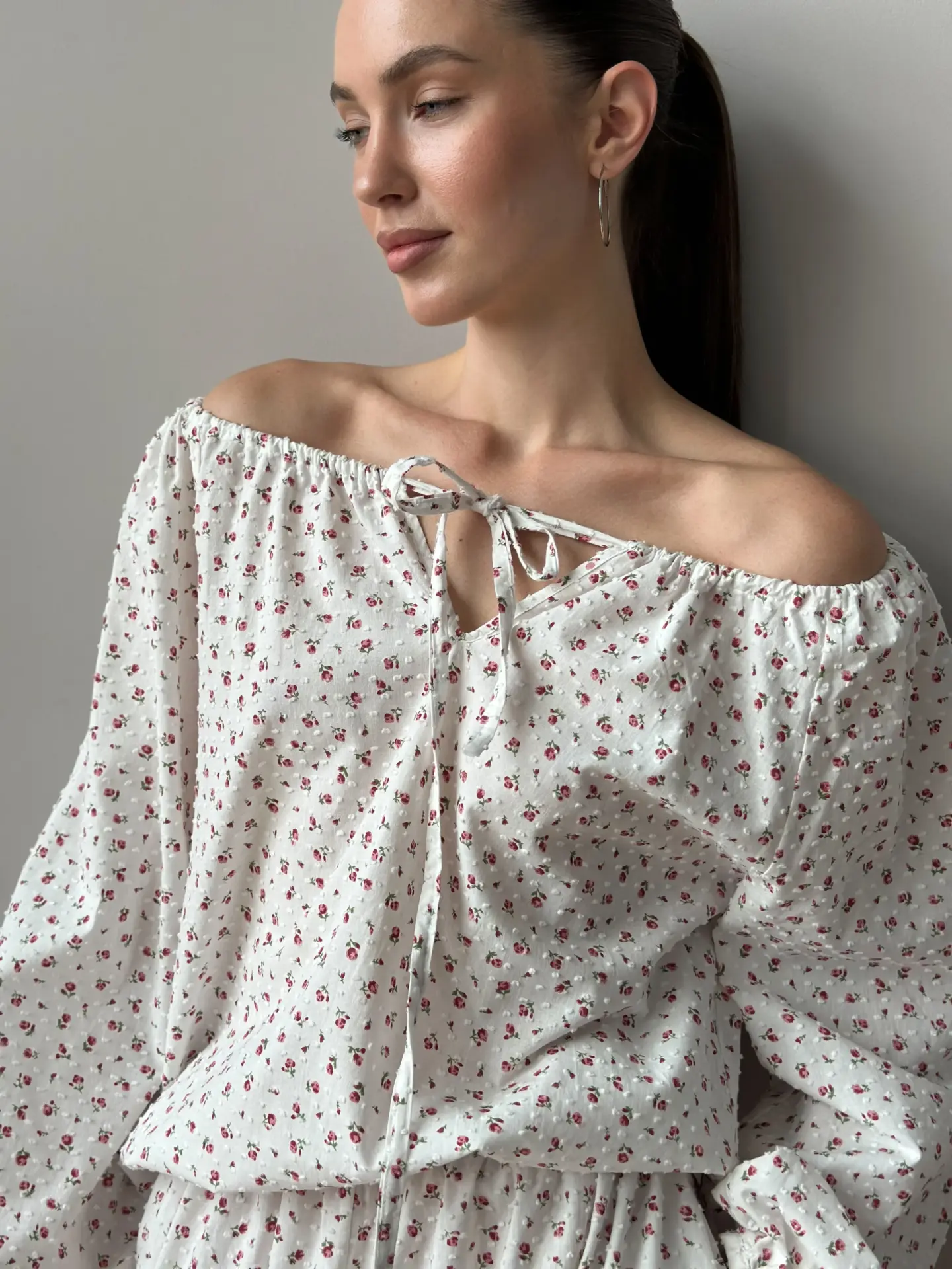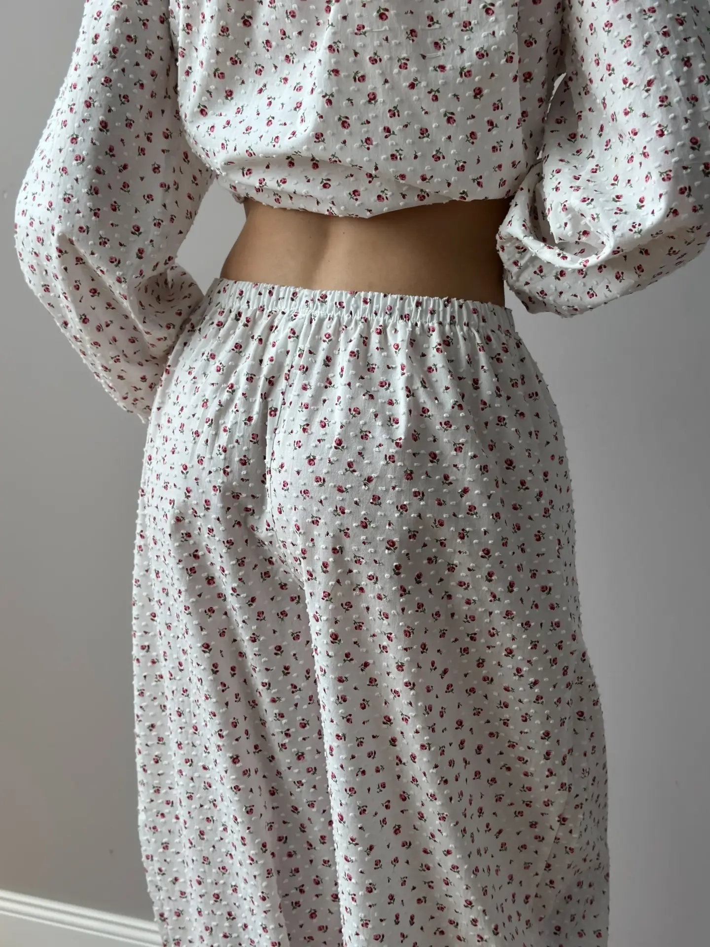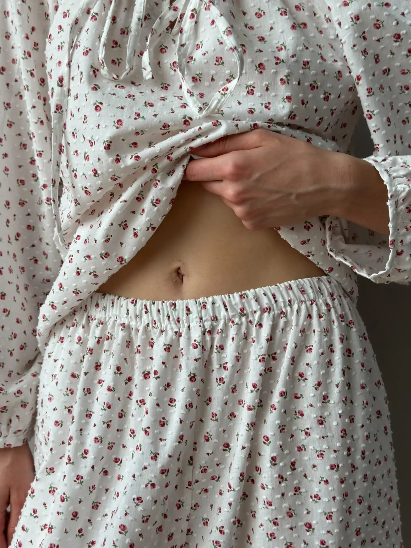 Komplet koszula na troczek i spodnie szarawary, z batystu, biały w kropki i czerwone róże