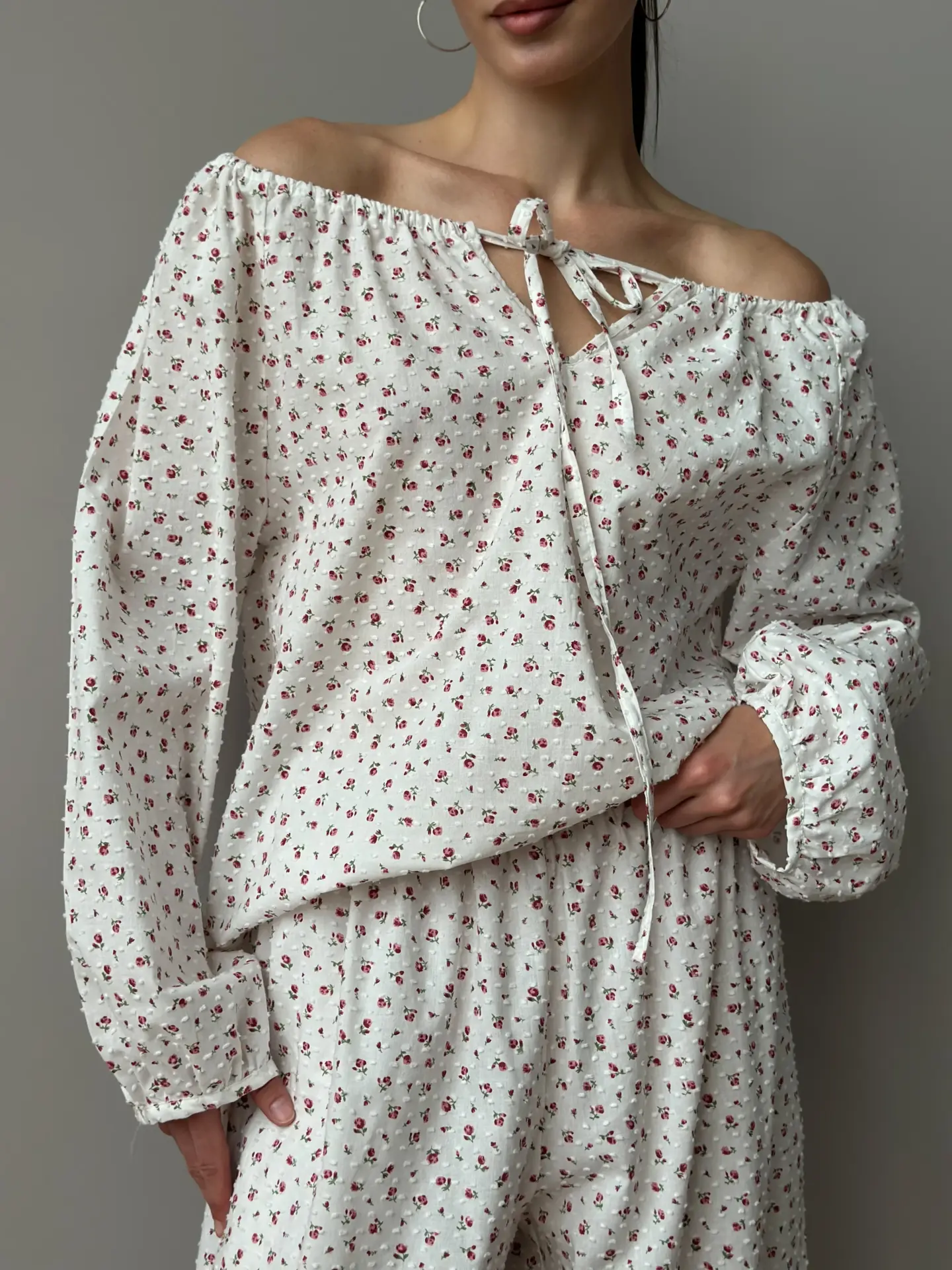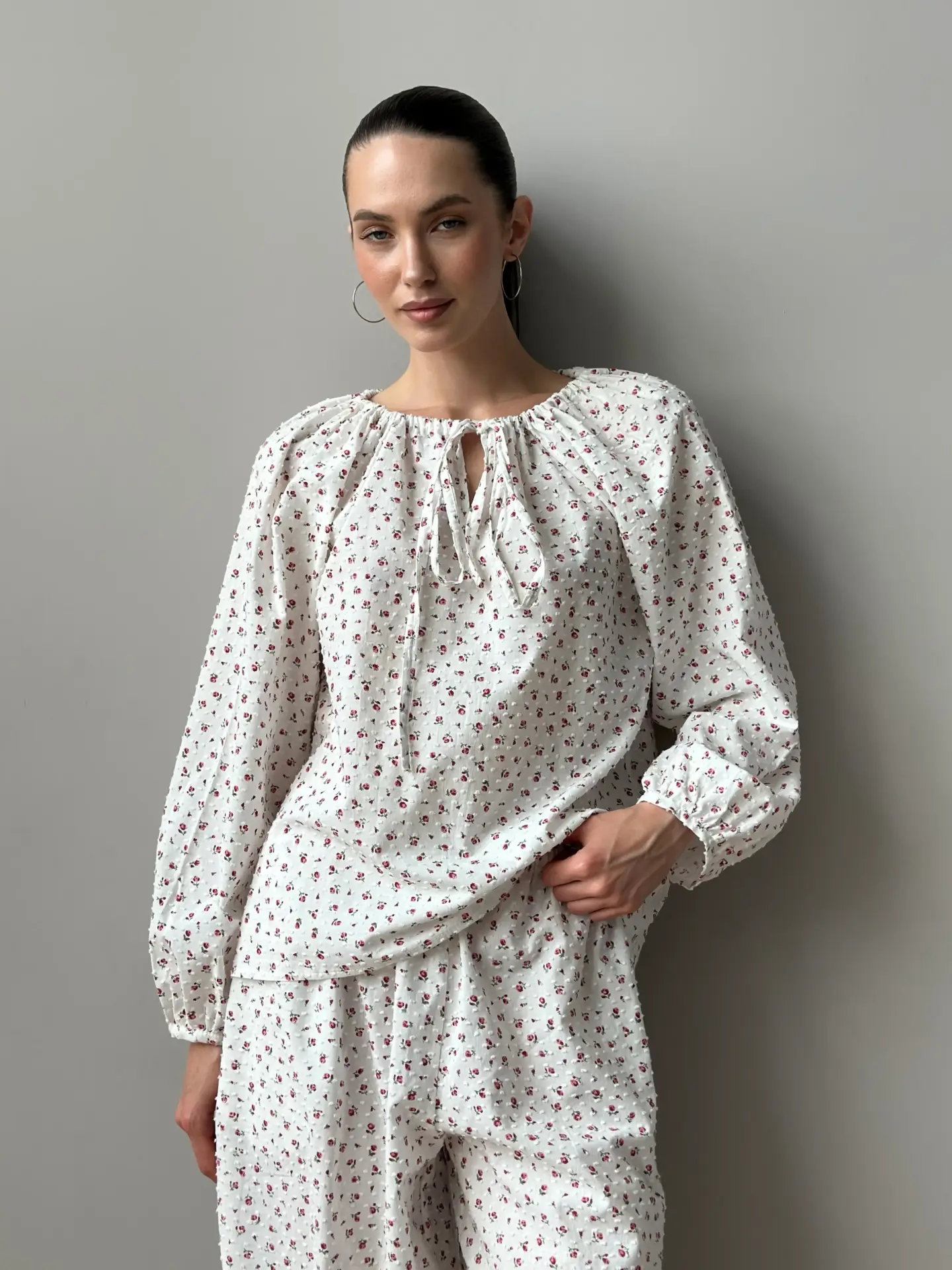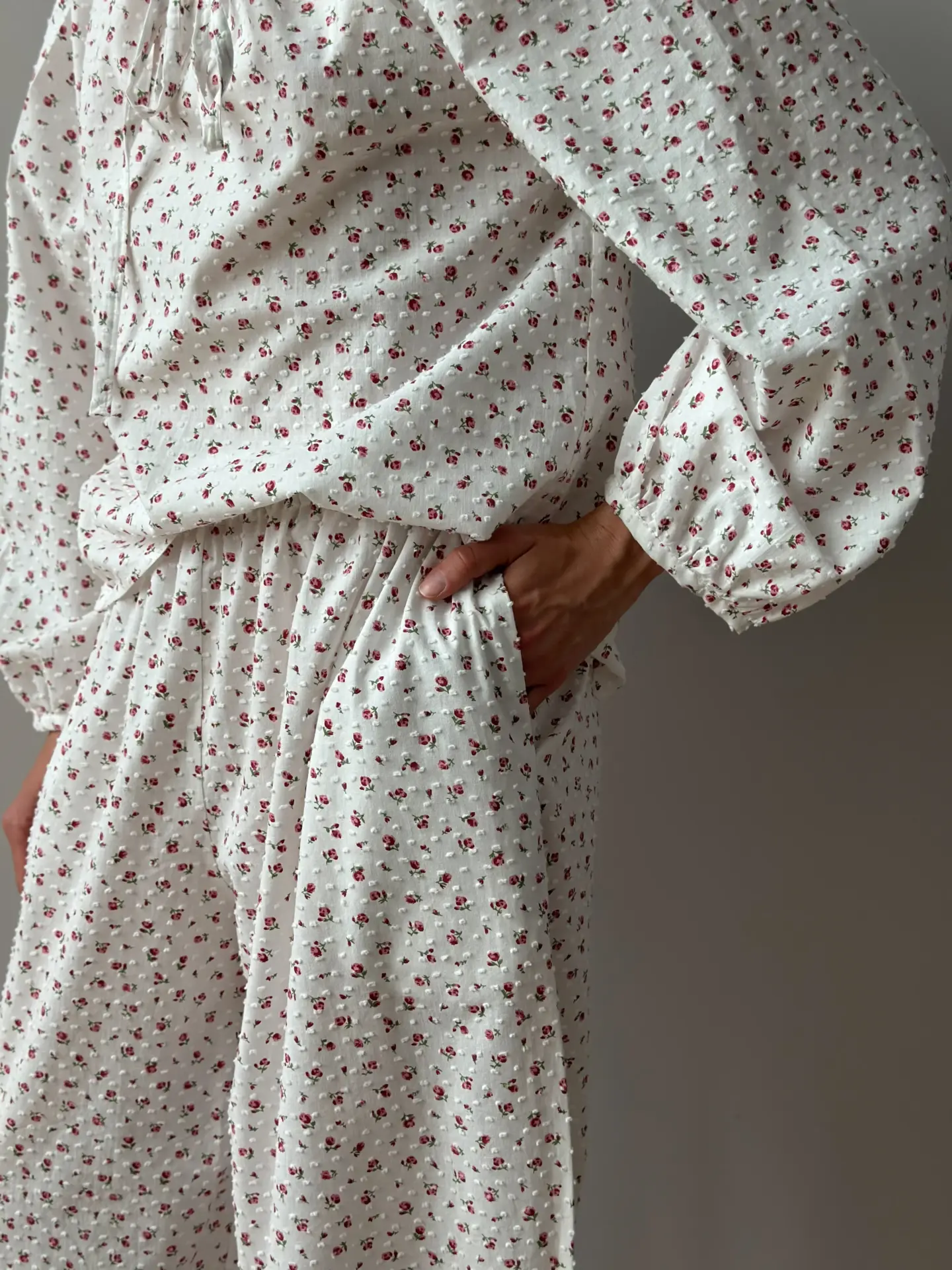 Komplet: koszula z tunelem i spodnie szarawary z batystu — lekki i komfortowy zestaw na letnie dni. Koszula z tunelem pozwala regulować objętość i tworzyć różne sylwetki, a luźne szarawary zapewniają swobodę ruchów i maksymalny komfort. Batystowa tkanina jest delikatna, oddychająca i przyjemna dla ciała. Idealny wybór na wypoczynek, spacery lub swobodne miejskie stylizacje.