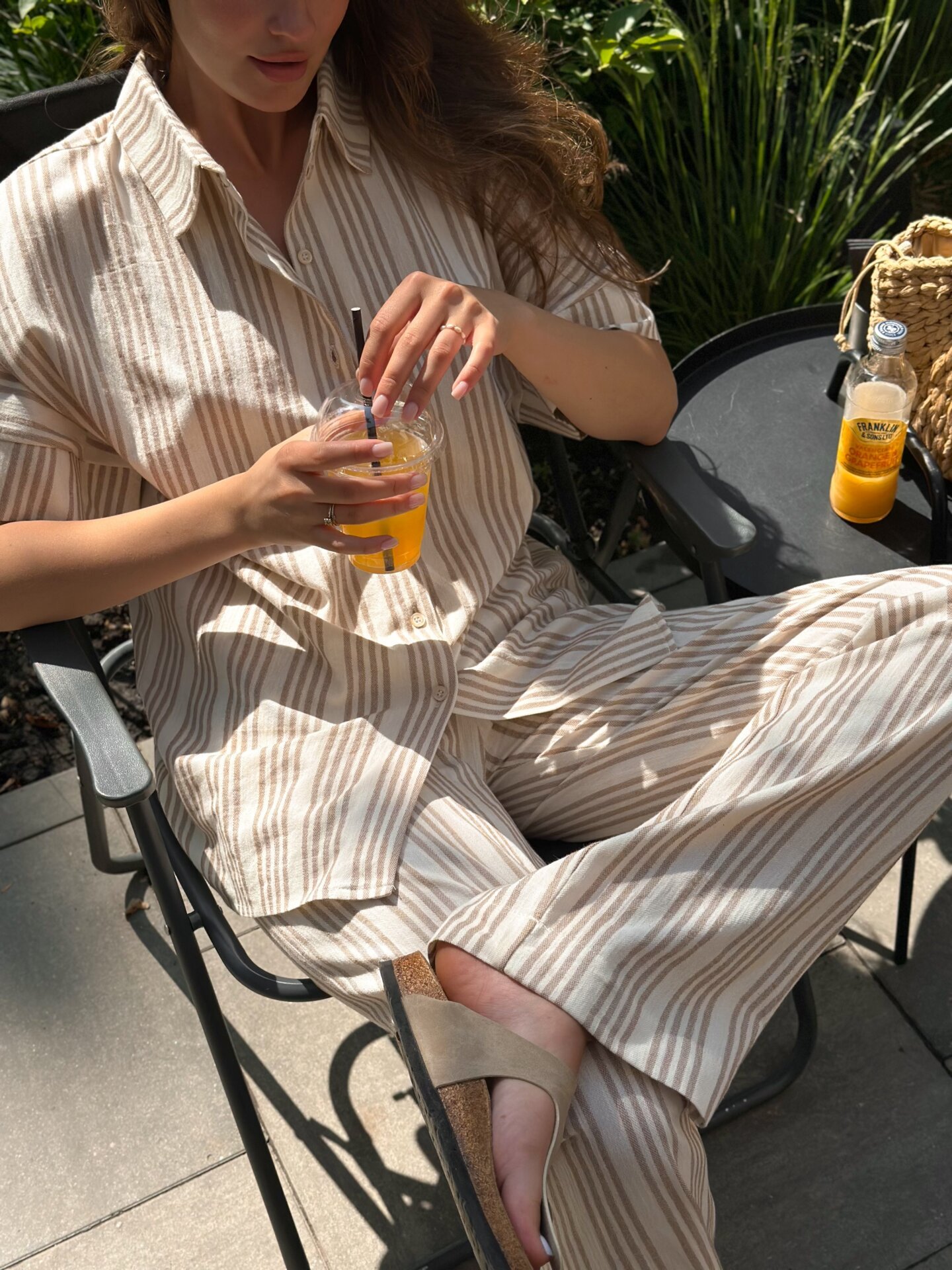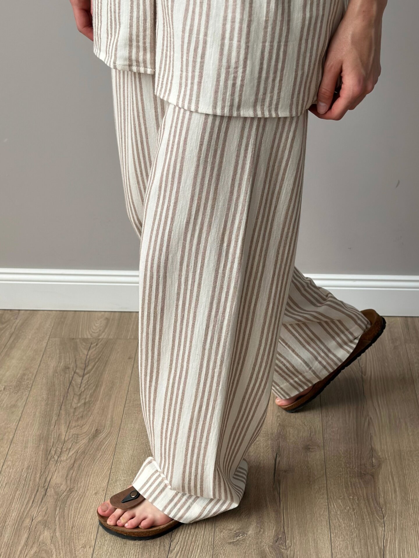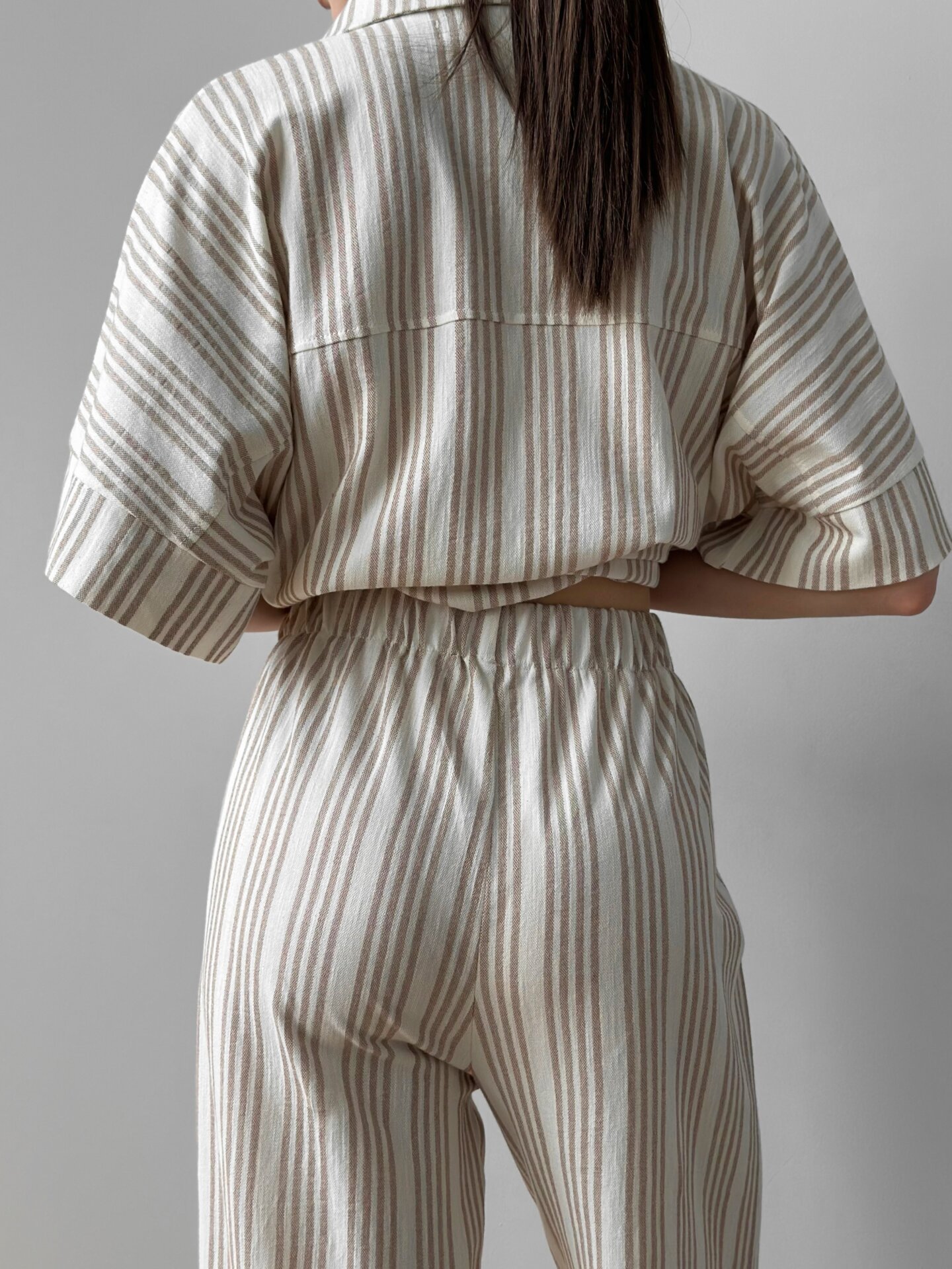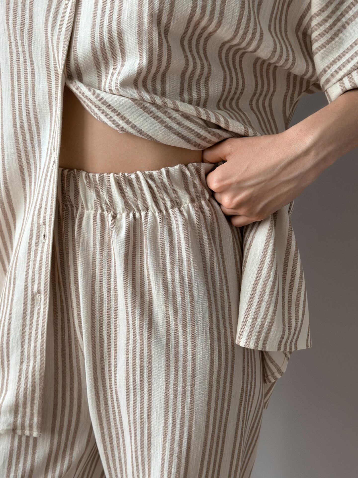 Komplet: koszula z krótkim rękawem i spodnie z bawełny w beżowe paski łączy komfort ze stonowaną elegancją. Naturalna bawełniana tkanina jest przyjemna w dotyku i przewiewna. Luźna koszula z krótkimi rękawami tworzy lekki fason, a proste spodnie dodają stylizacji minimalistycznego charakteru. Idealny wybór na codzienny strój, wypoczynek lub letnie spacery.