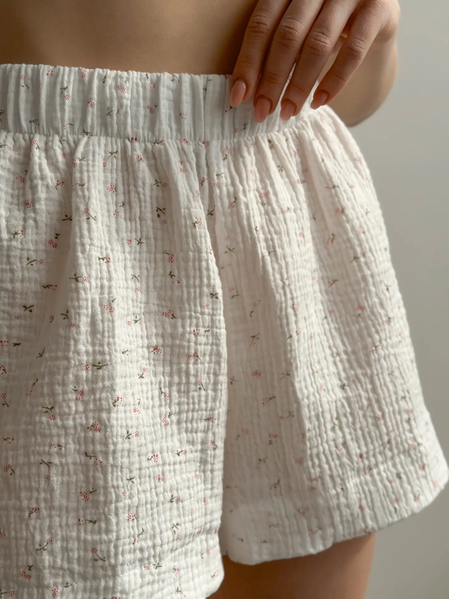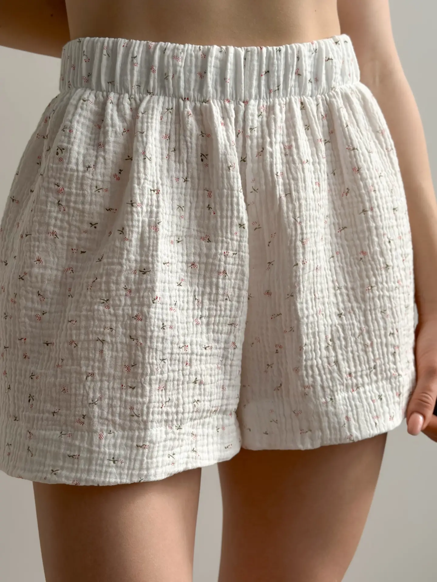 Muslinowy kostium z koszulką i szortami w kolorze białym z nadrukiem „stokrotka” łączy w sobie lekkość i delikatność. Naturalny materiał oddycha i zapewnia komfort w upalne dni.