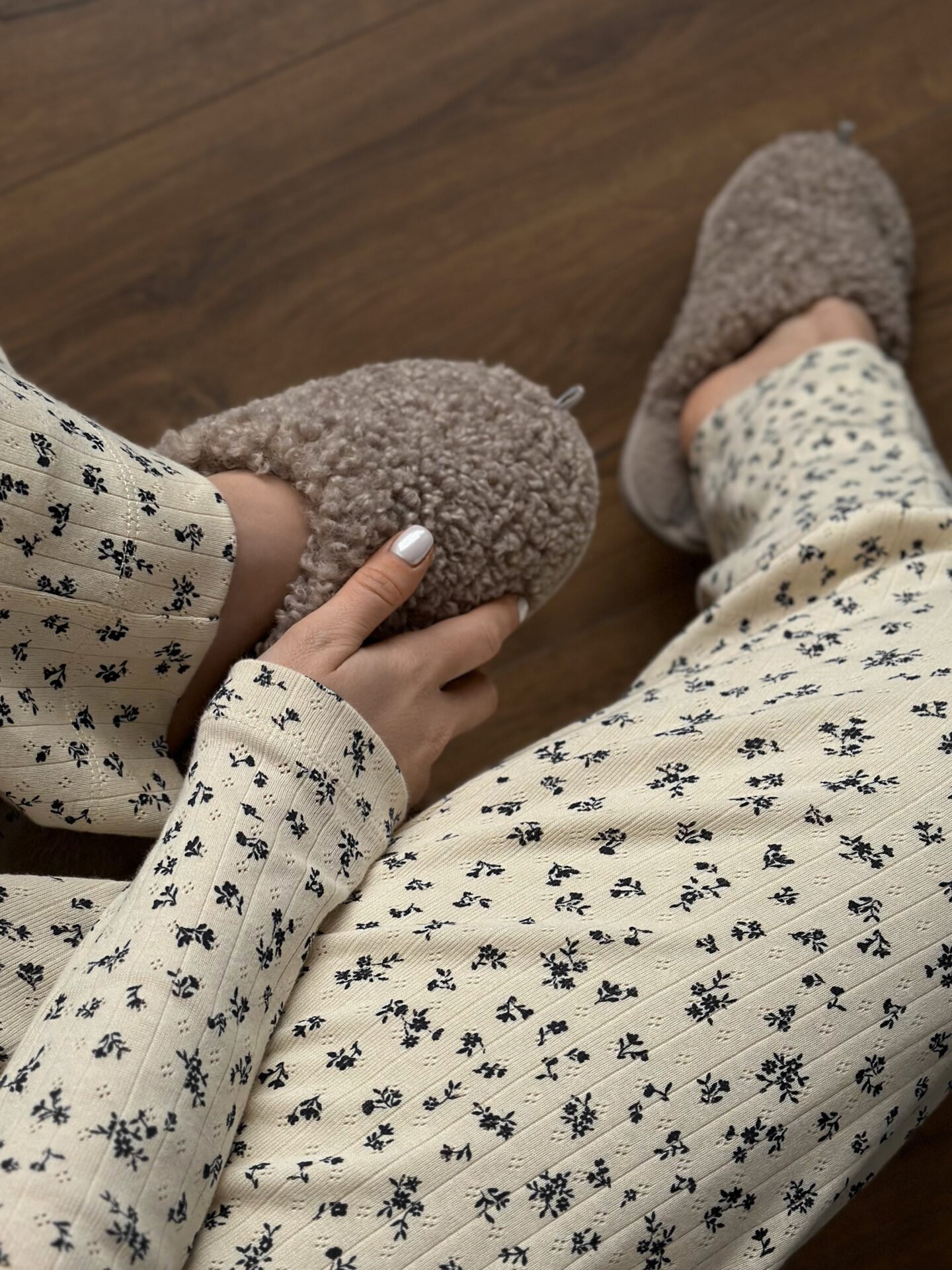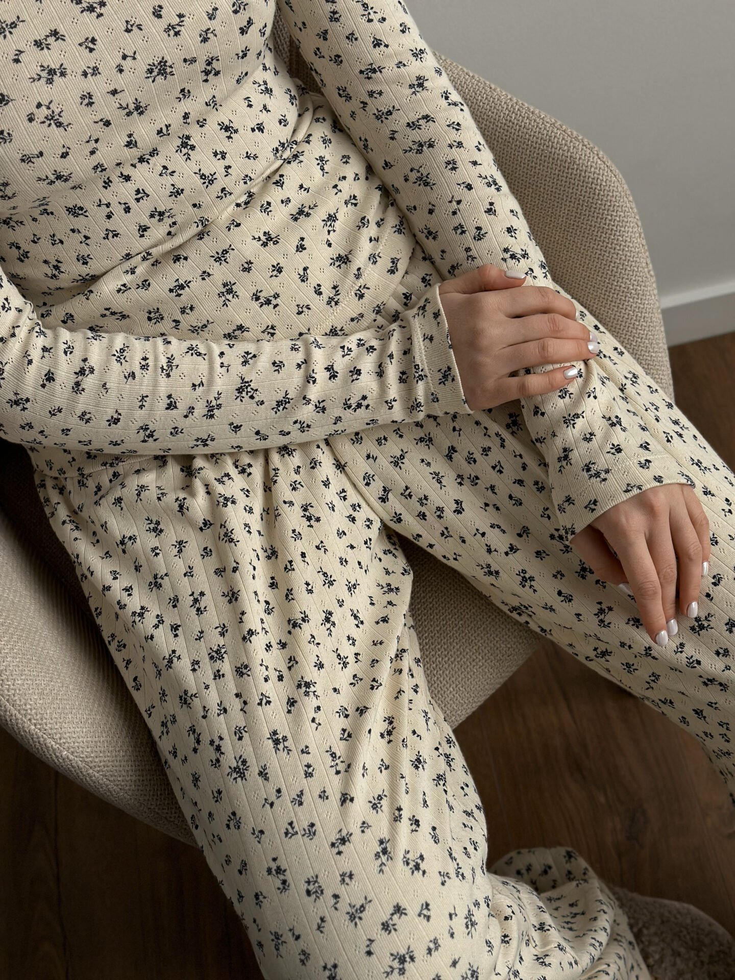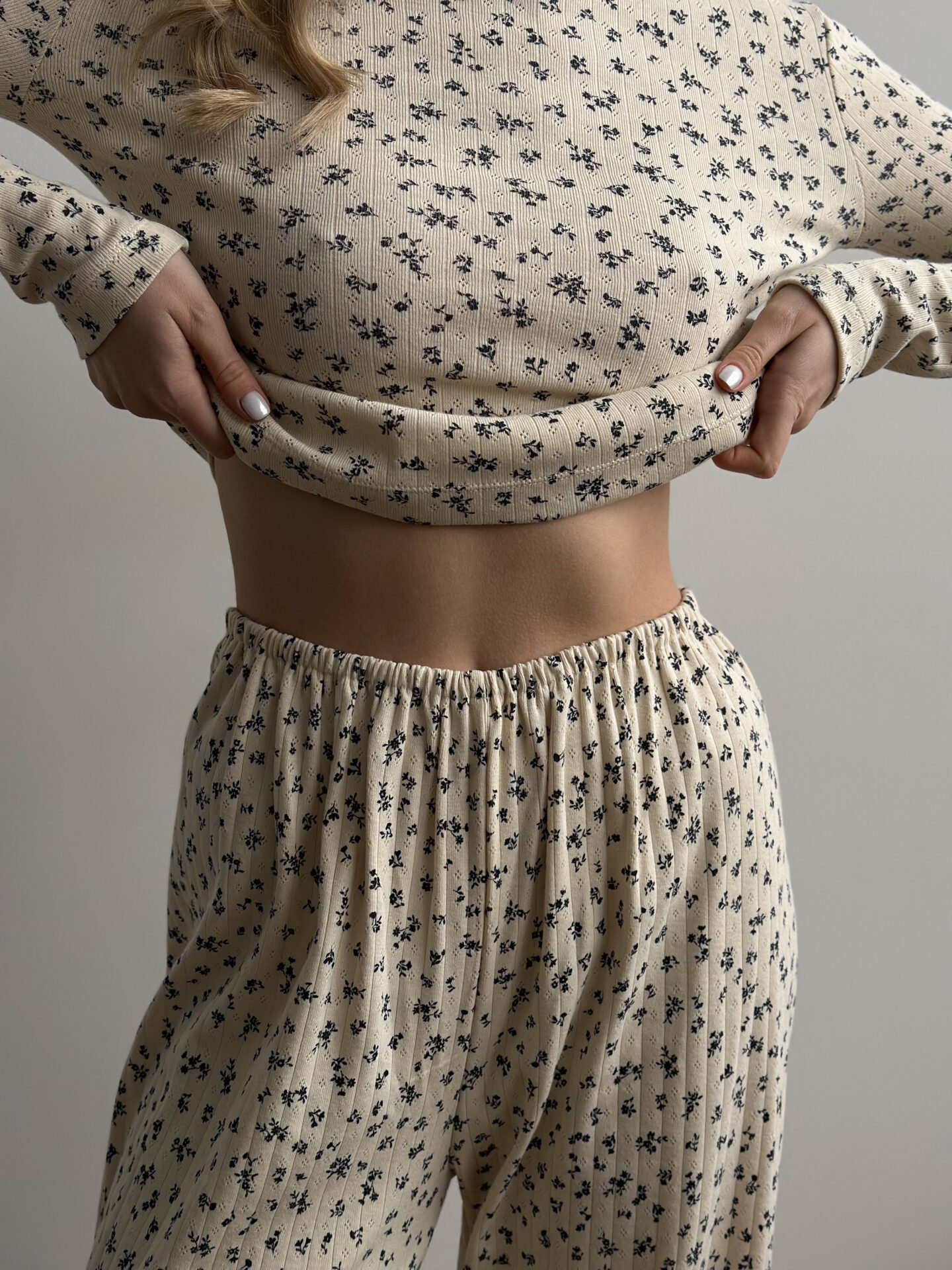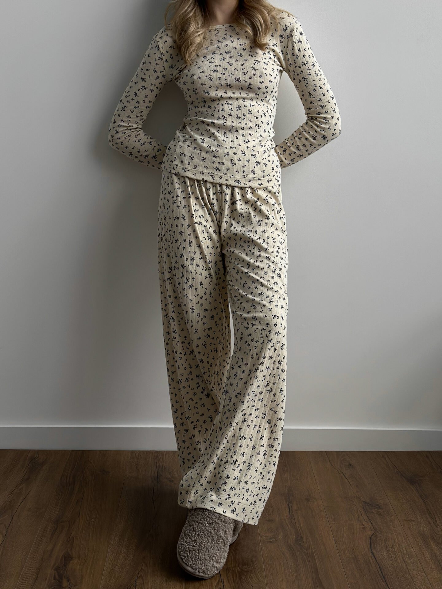 Komplet koszulka z długim rękawem i szerokie spodnie, z ribany prążkowanej, kremowy w granatowe kwiatki