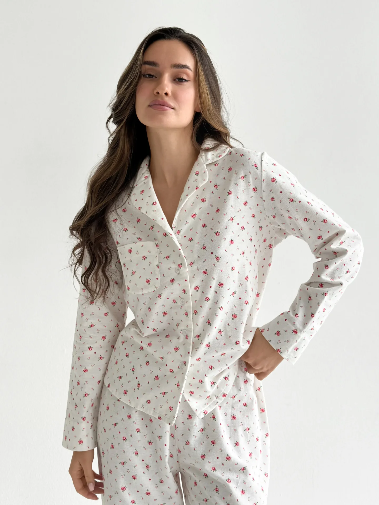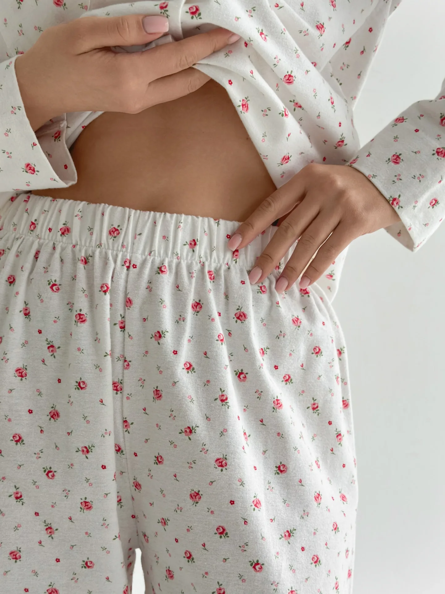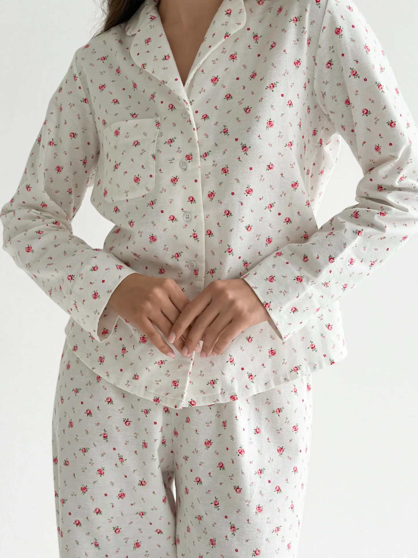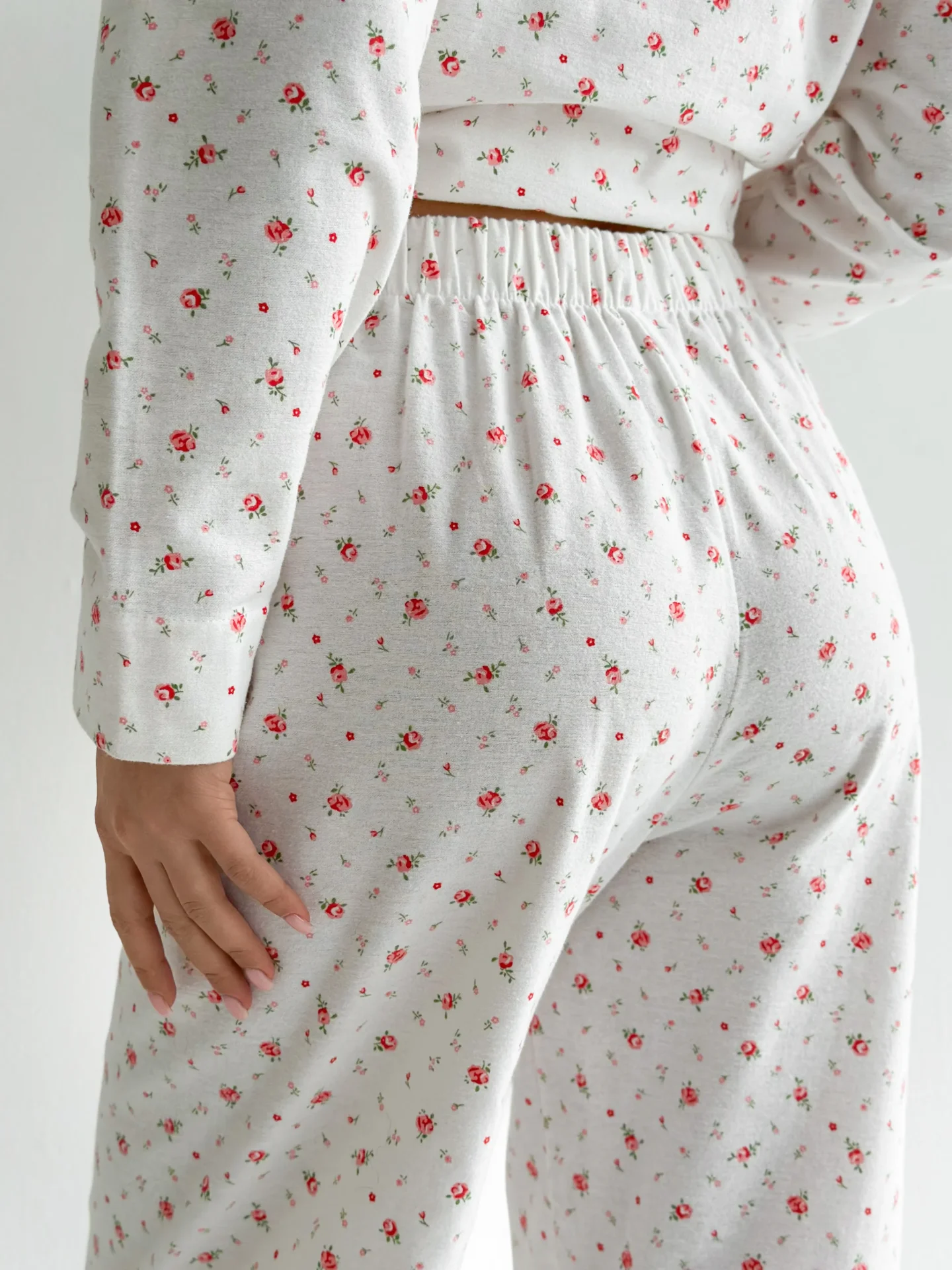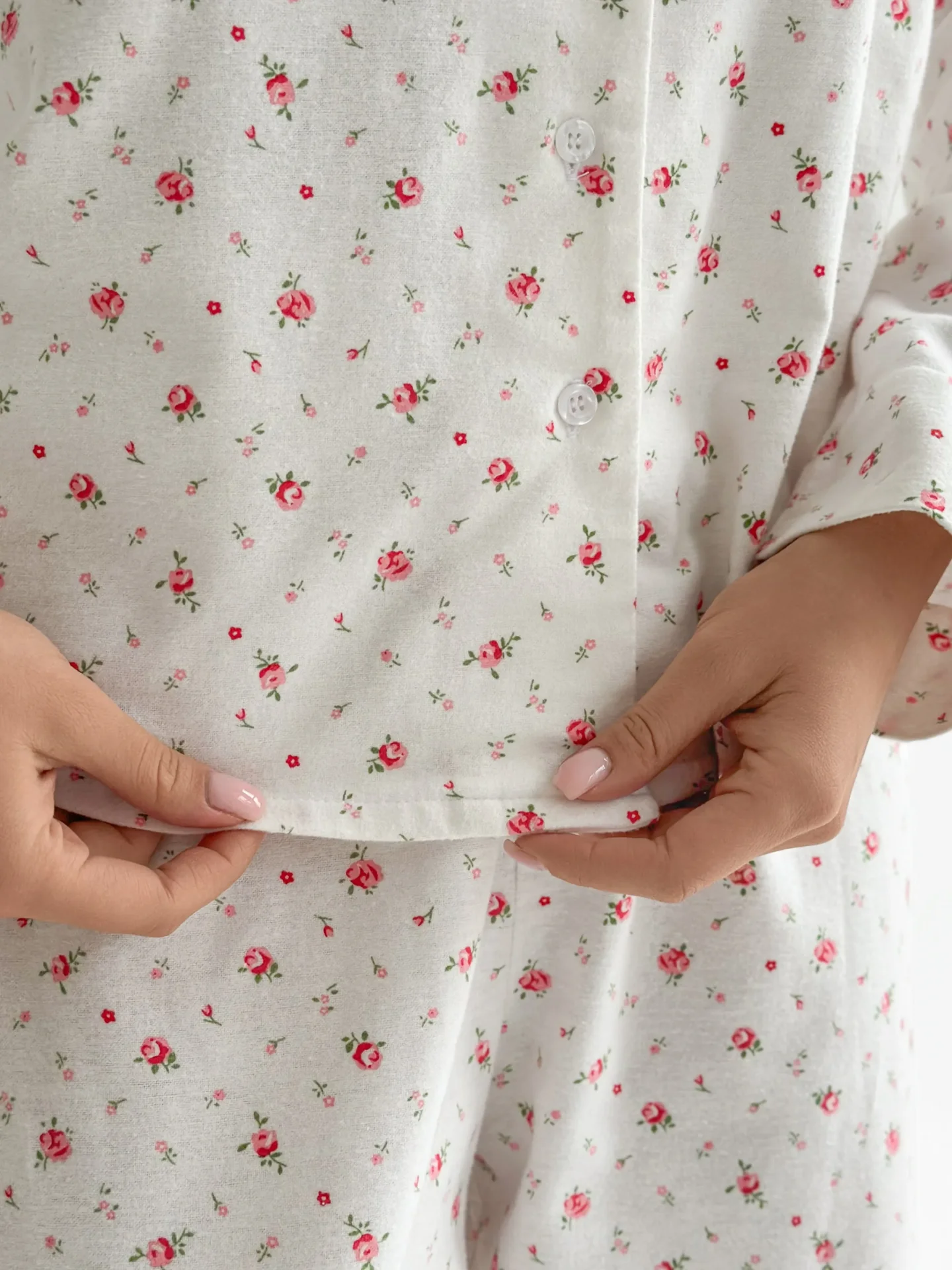 Komplet piżamowy koszula i spodnie, z flaneli, biały w róże
