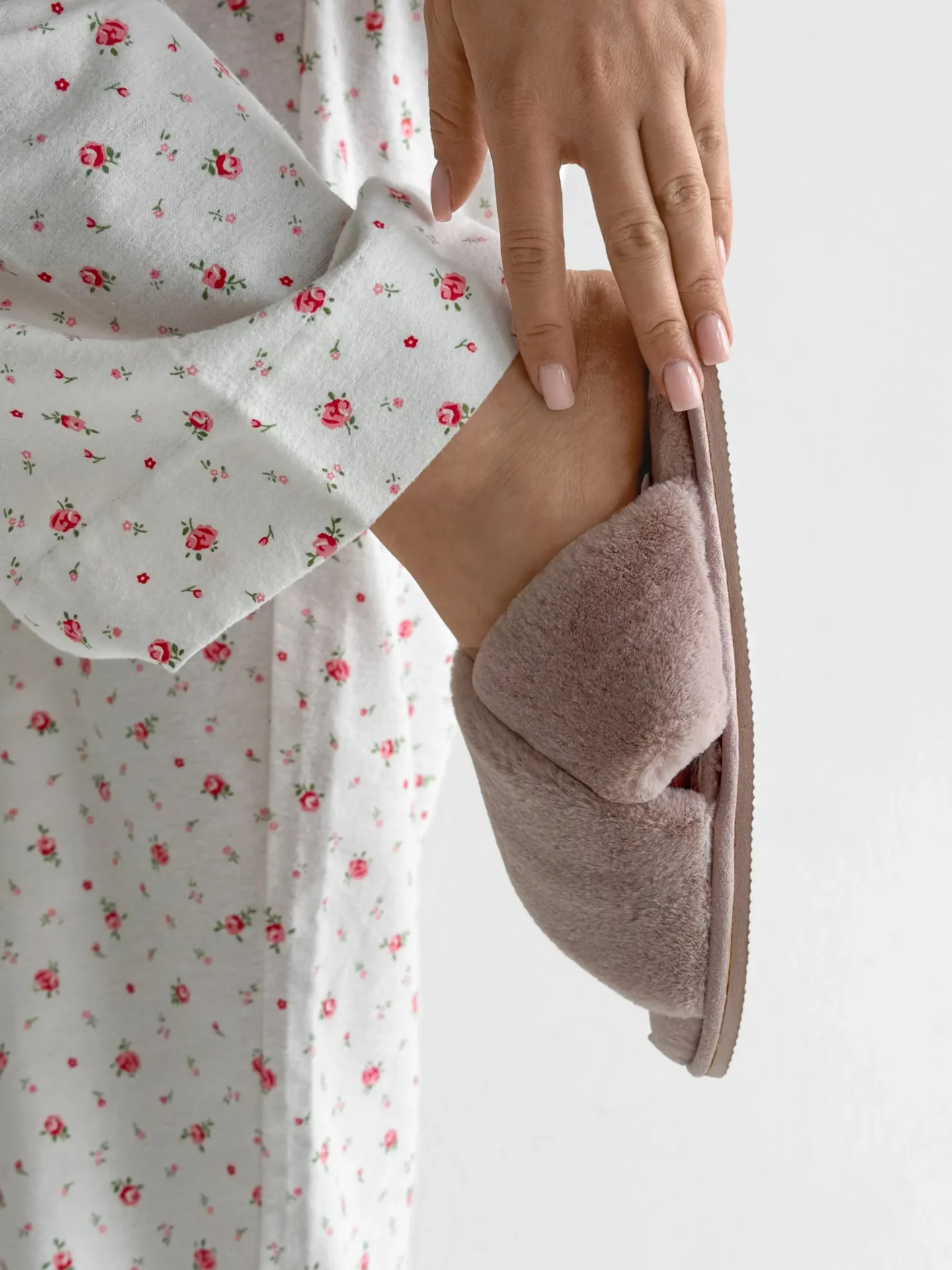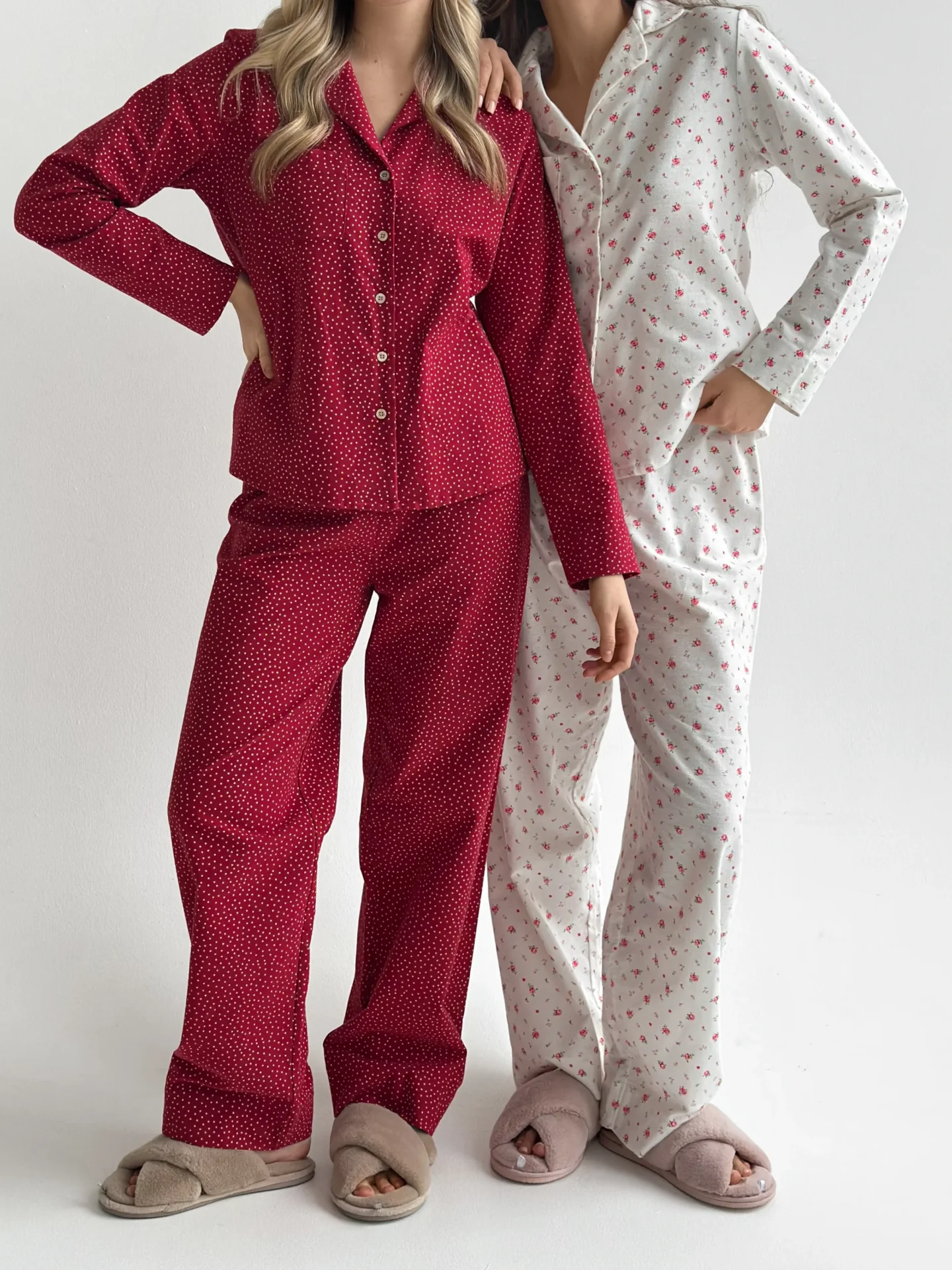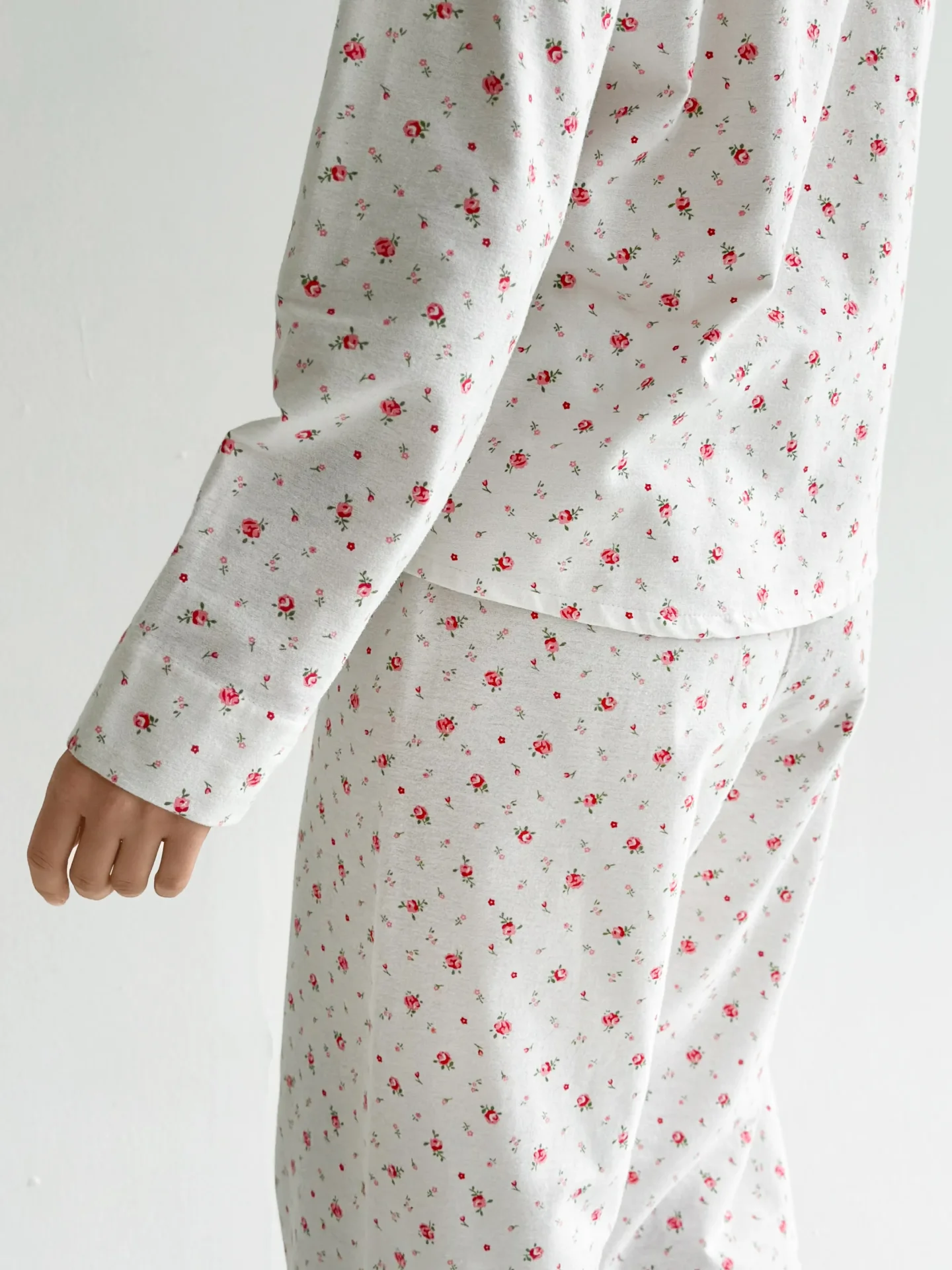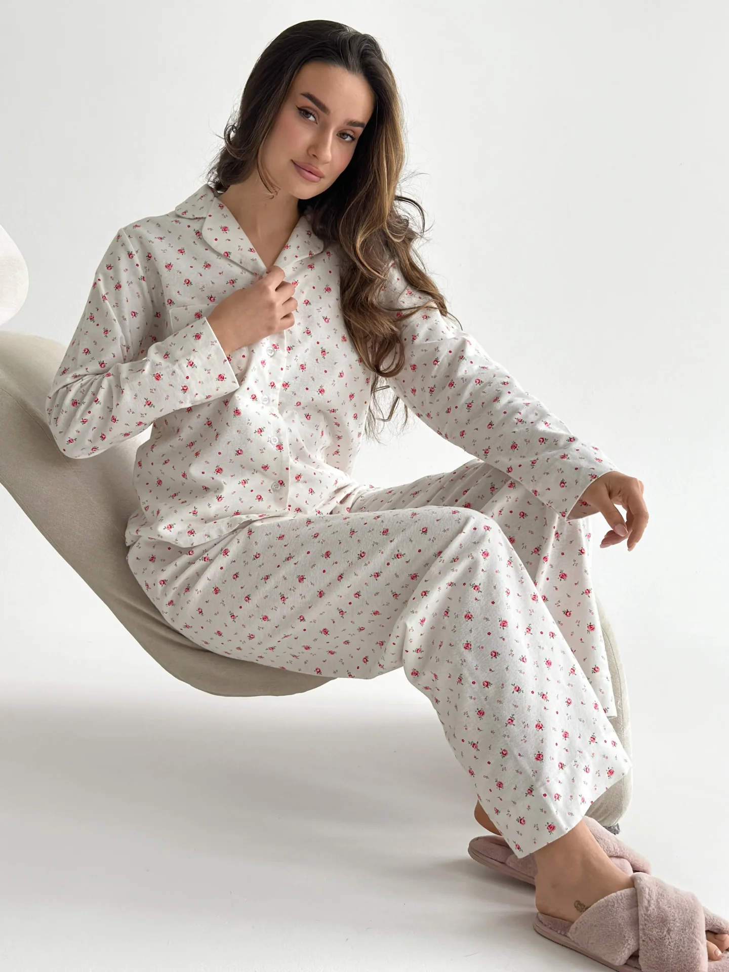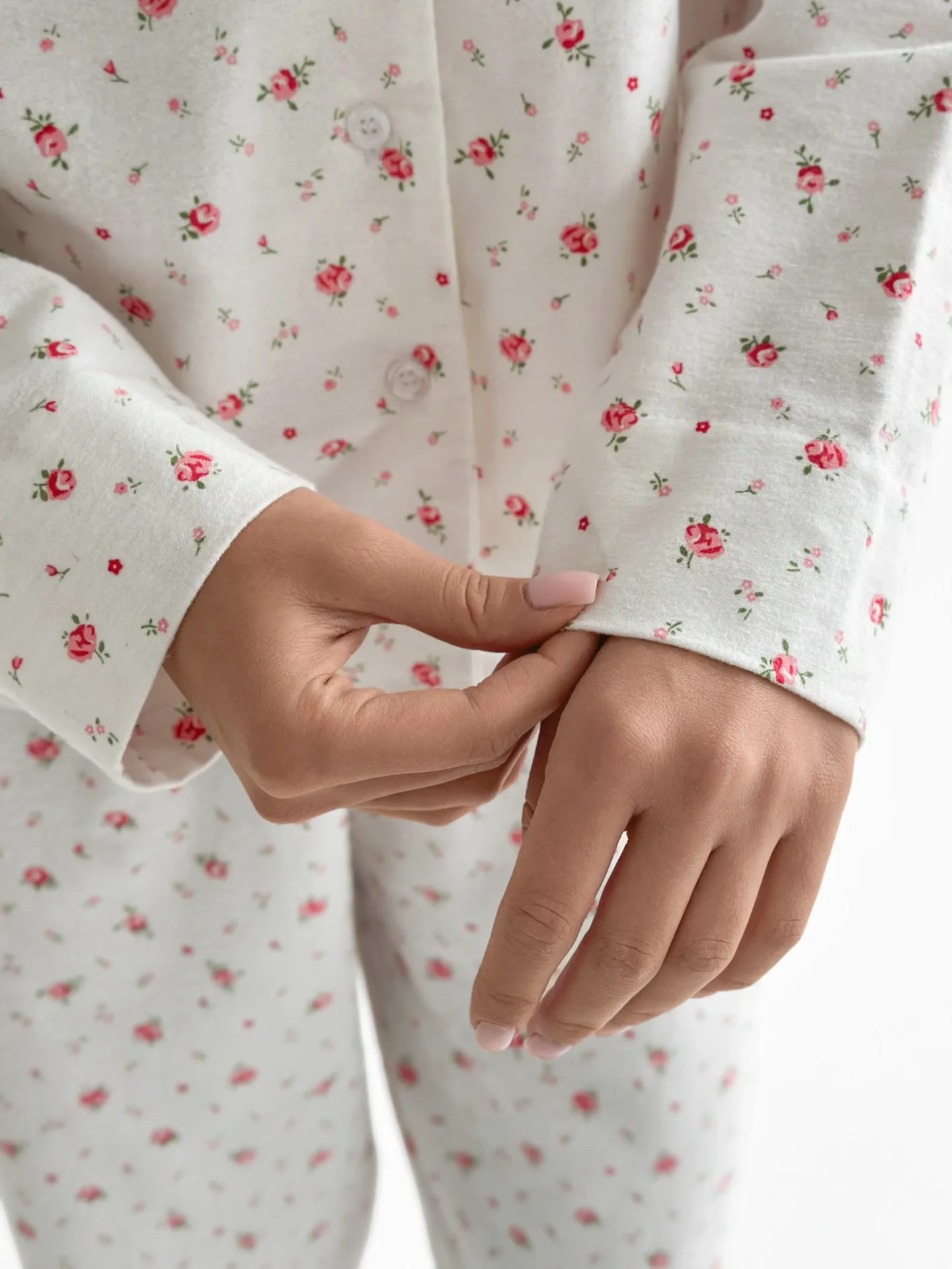 Komplet piżamowy koszula i spodnie, z flaneli, biały w róże