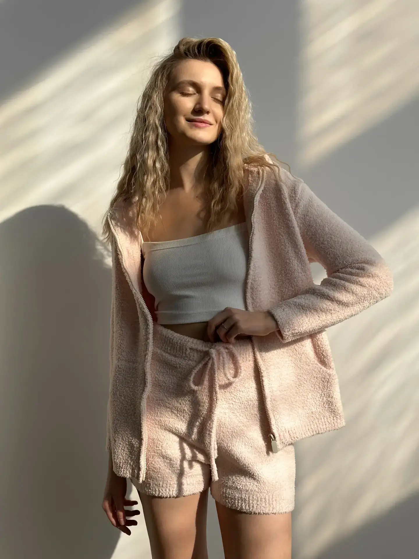 Miękki zestaw dzianinowy: szorty z wysokim stanem i bluza na zamek błyskawiczny. Przyjemny w dotyku materiał zapewnia komfort i wygodę. Idealny do domowego wypoczynku lub stylowych stylizacji.