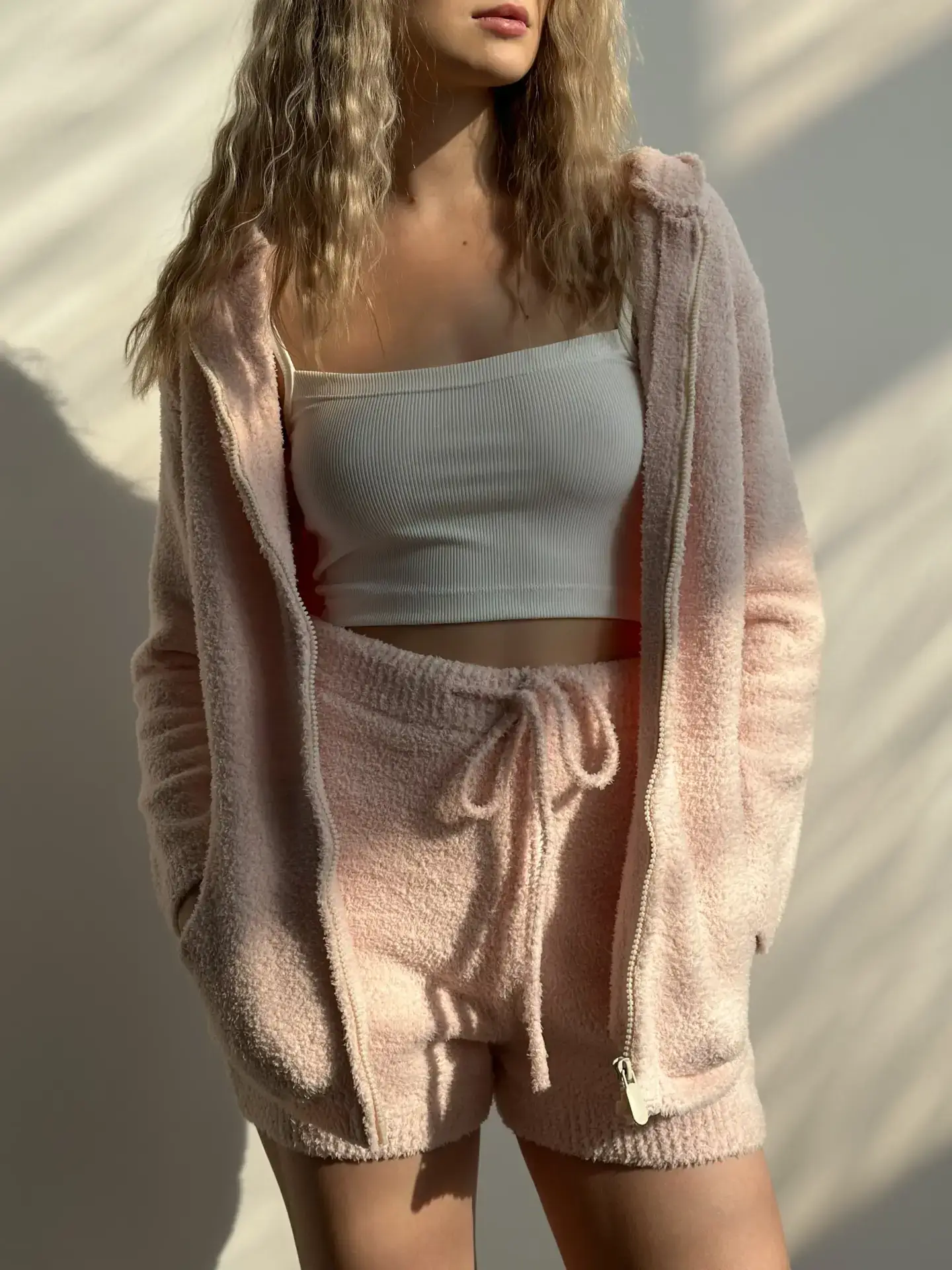 Komplet Soft bluza na zamek i szorty, z dzianiny puszystej, pudrowy
