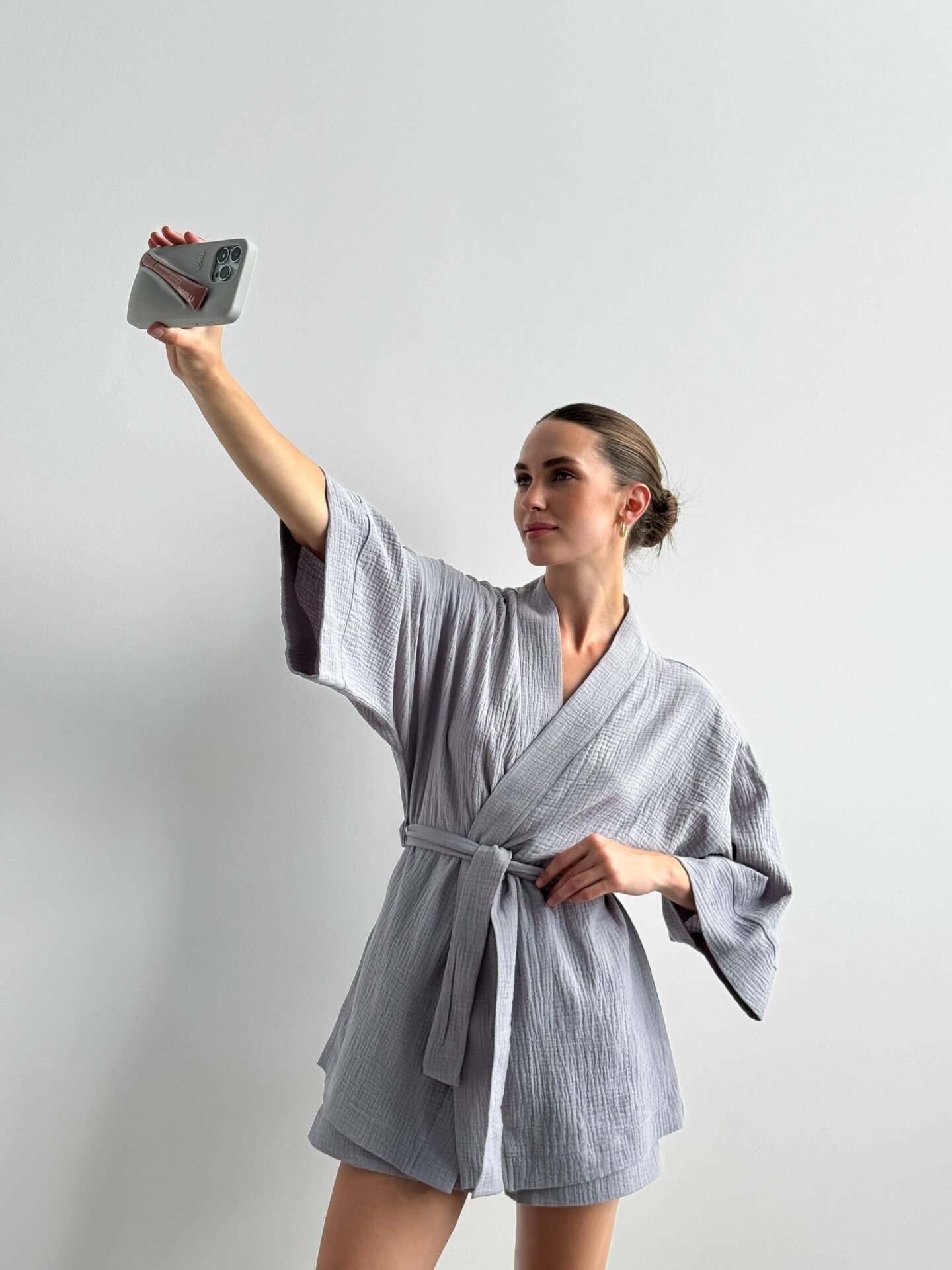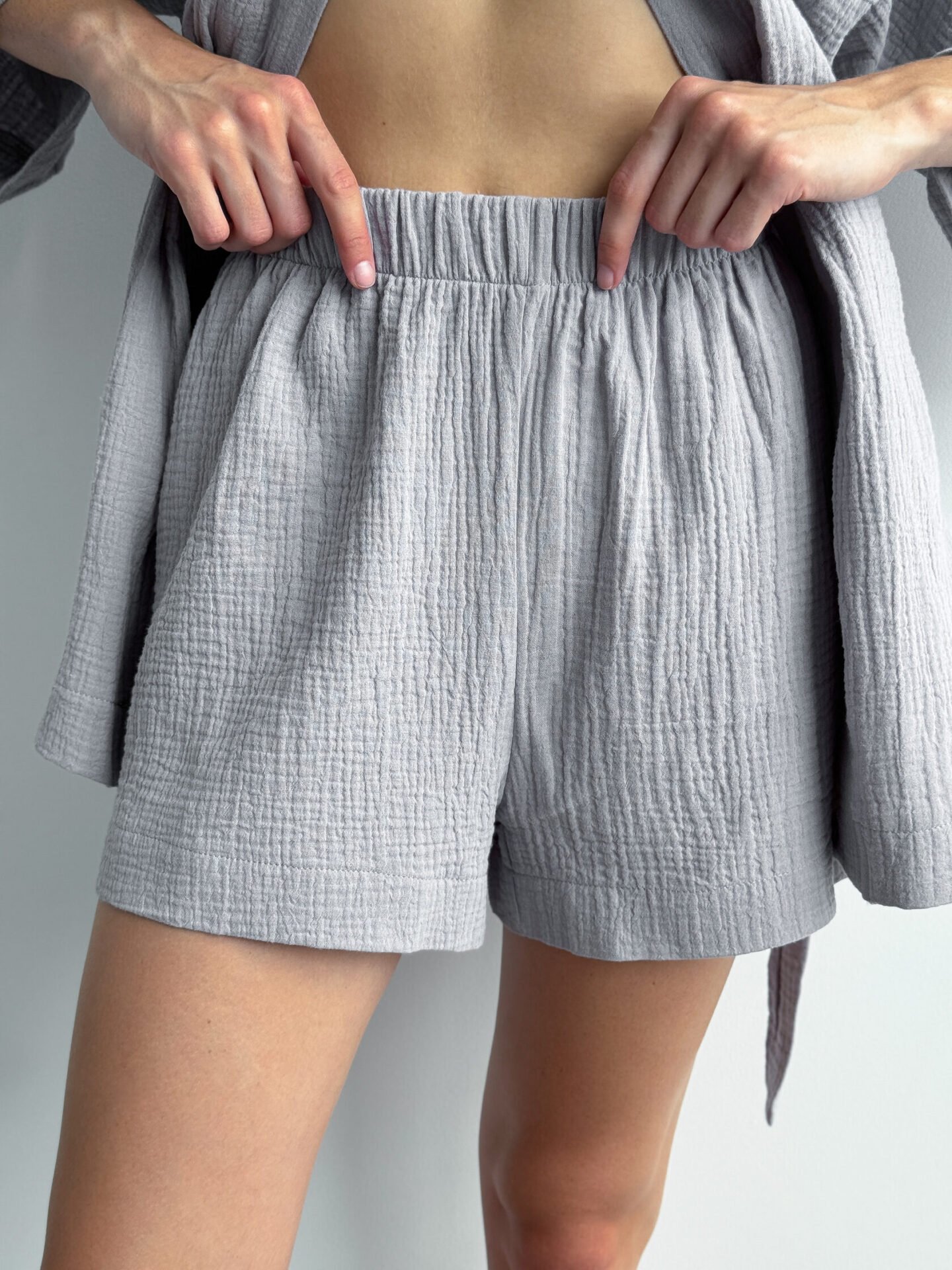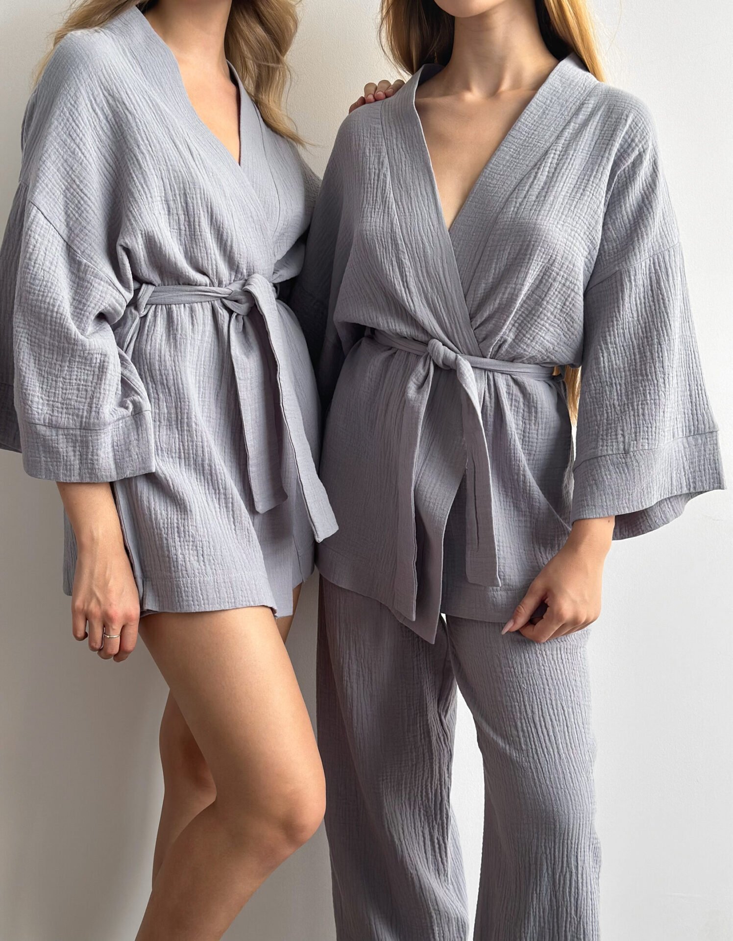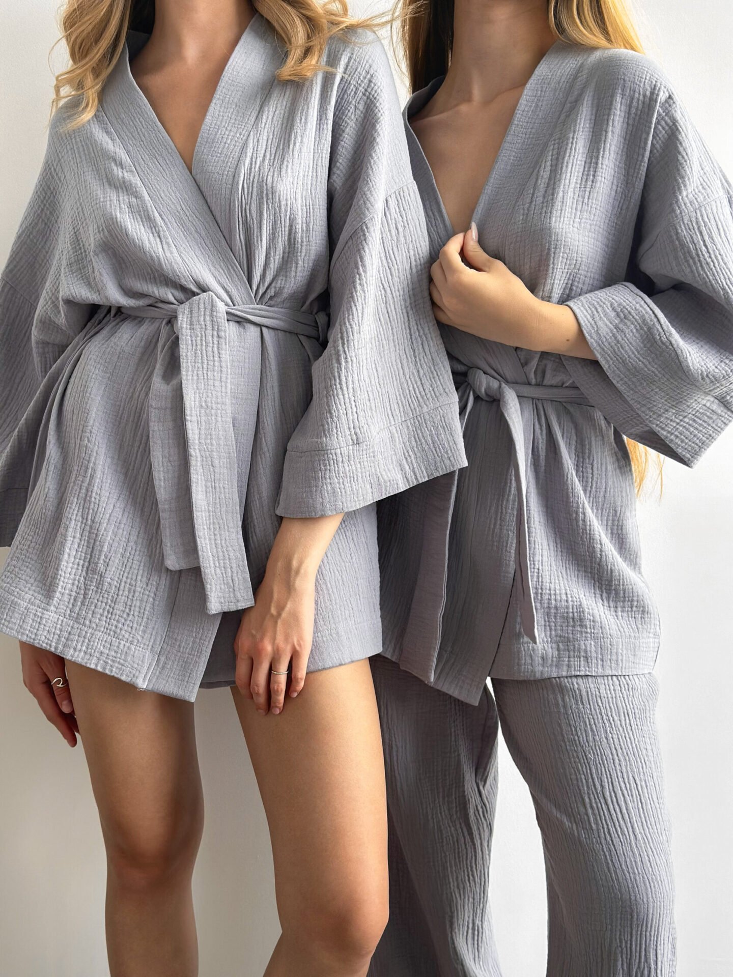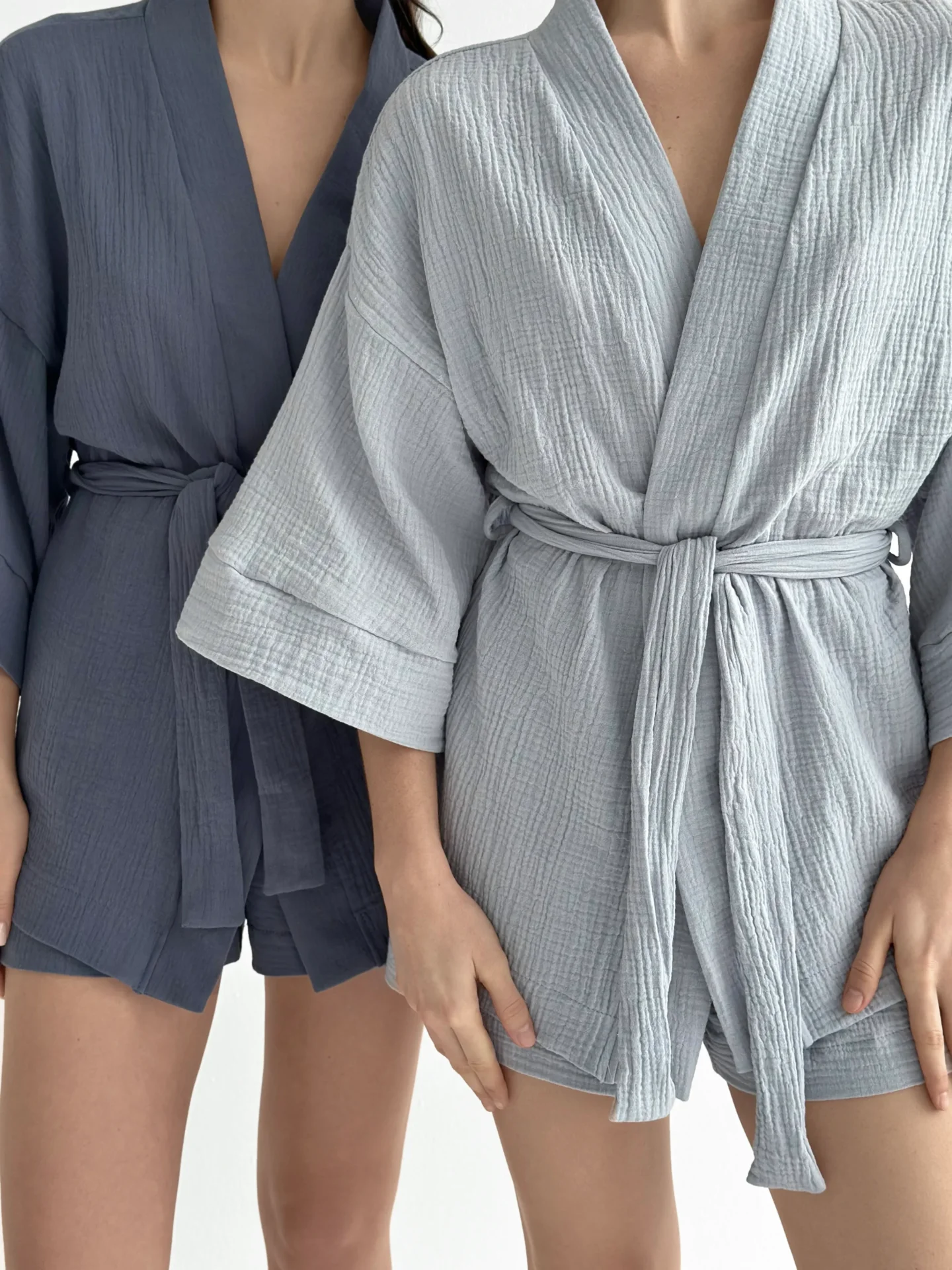 Lekki zestaw z muślinu: kimono i szorty z dwuwarstwowej tkaniny. Naturalny materiał zapewnia komfort i swobodę ruchów, idealny wybór na przytulne dni.