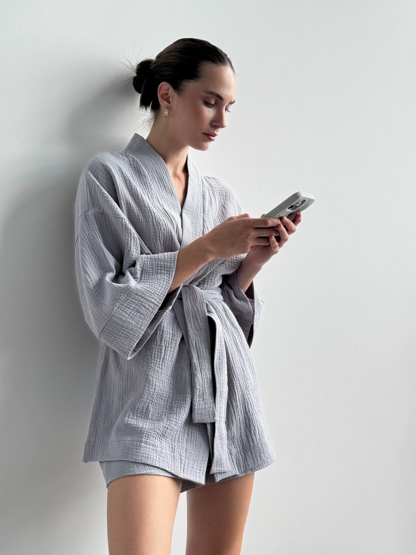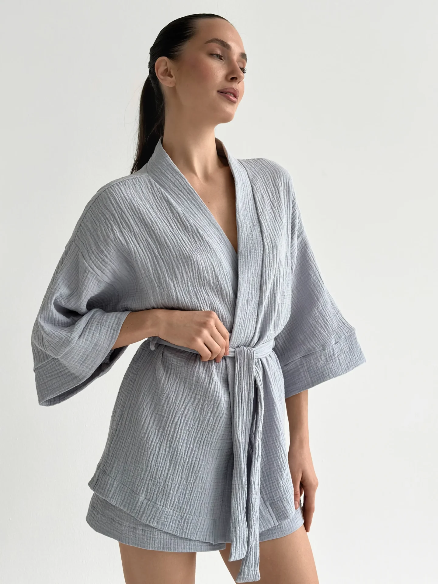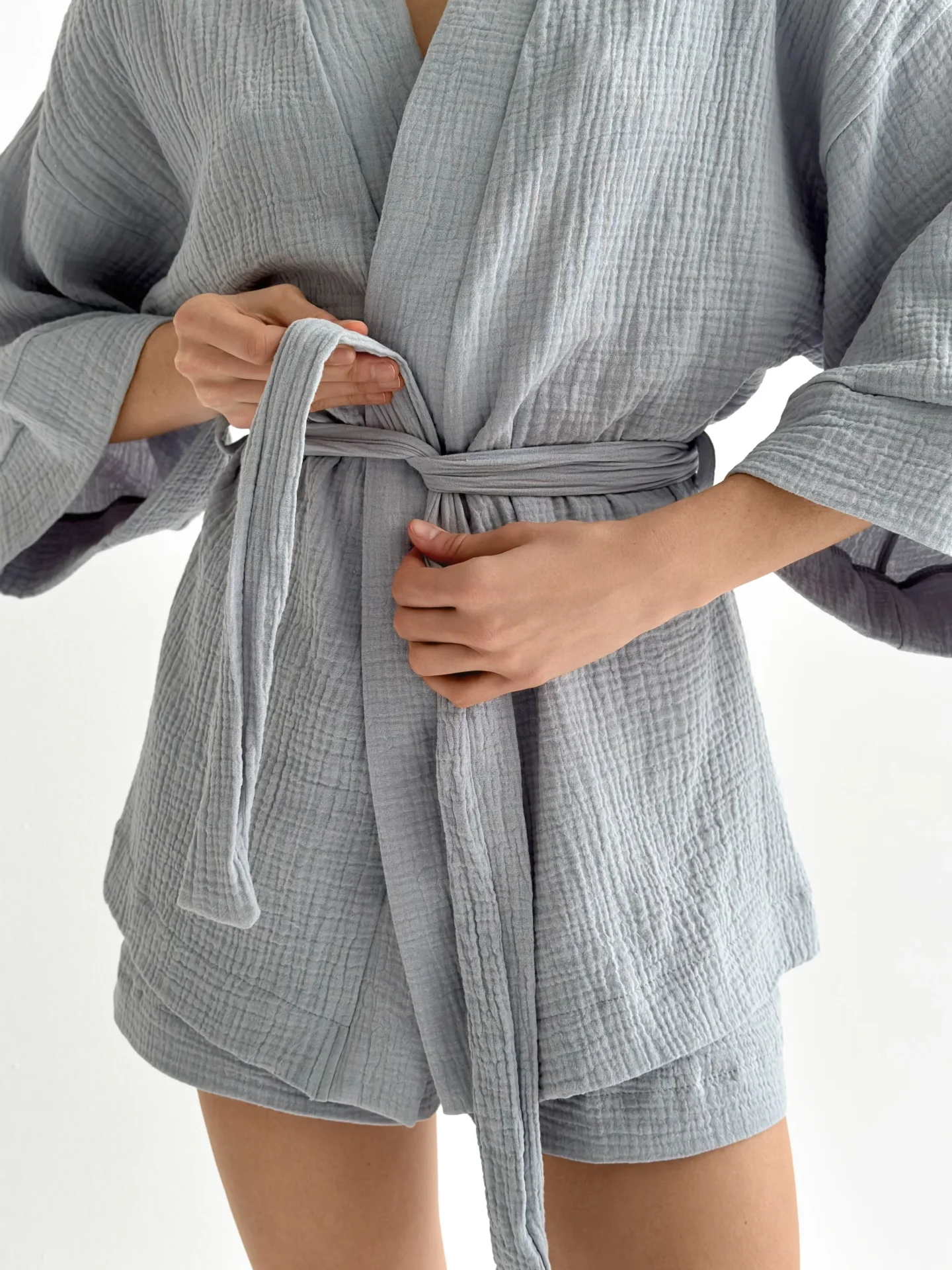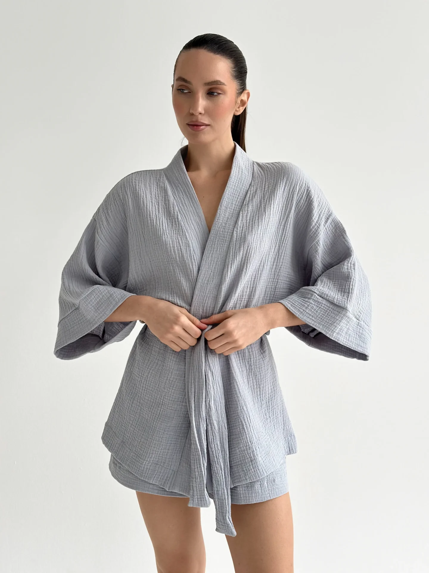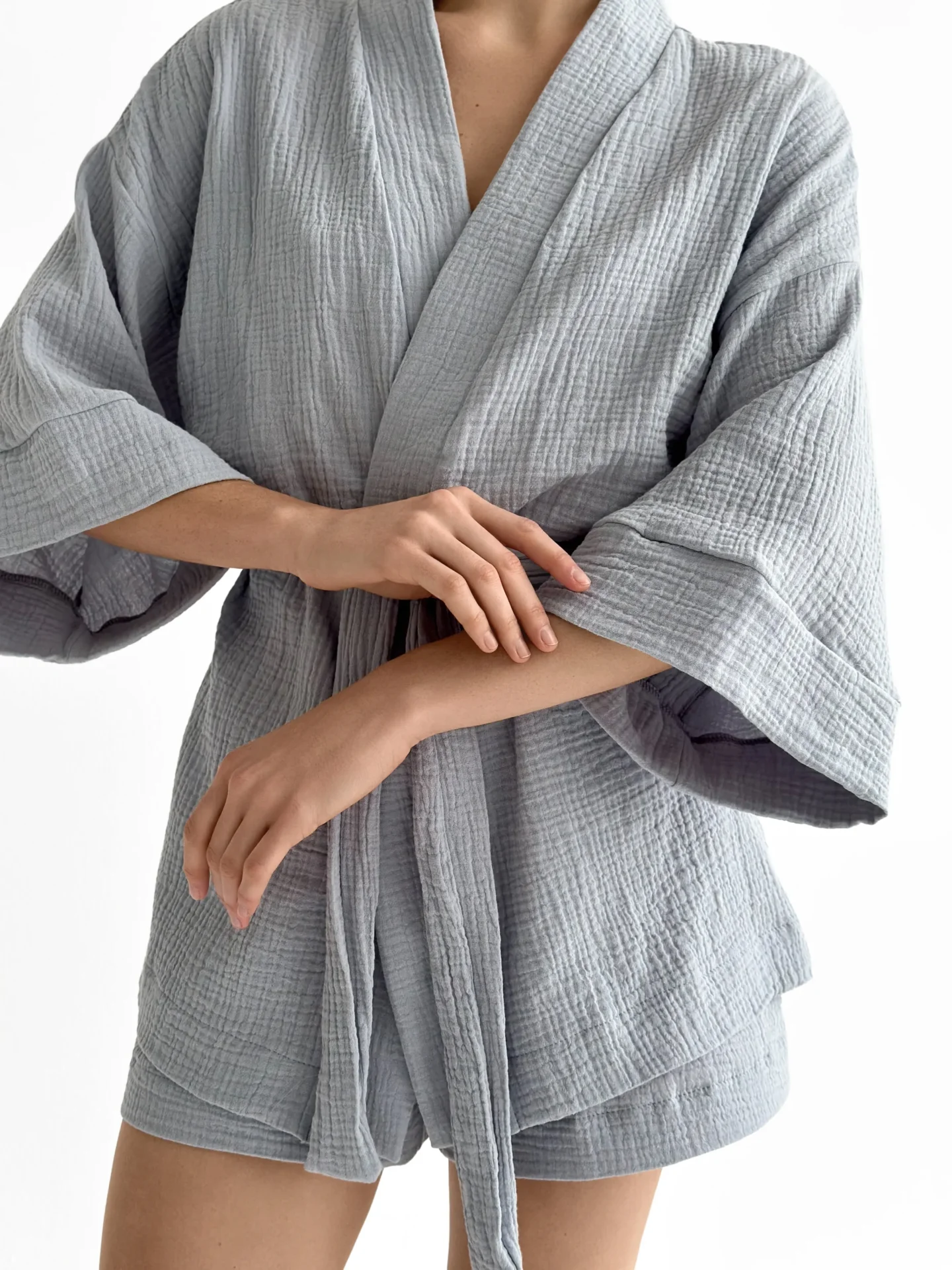 Komplet szlafrok krótki kimono i szorty, z muślinu dwuwarstwowego, szary