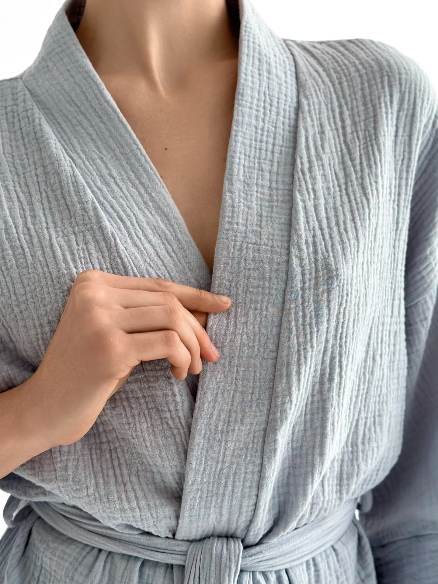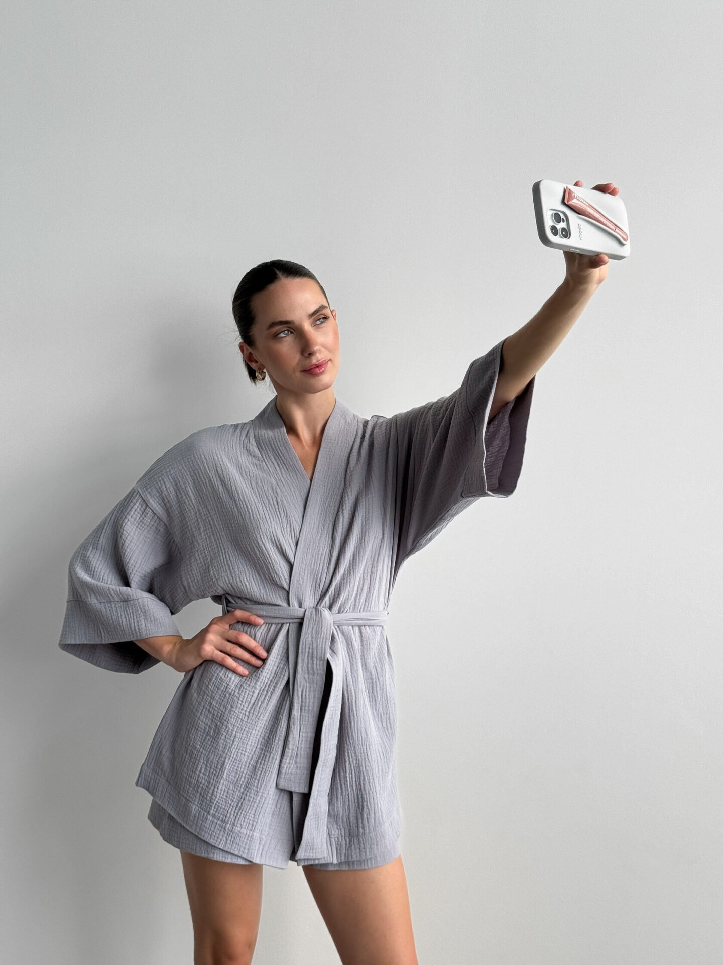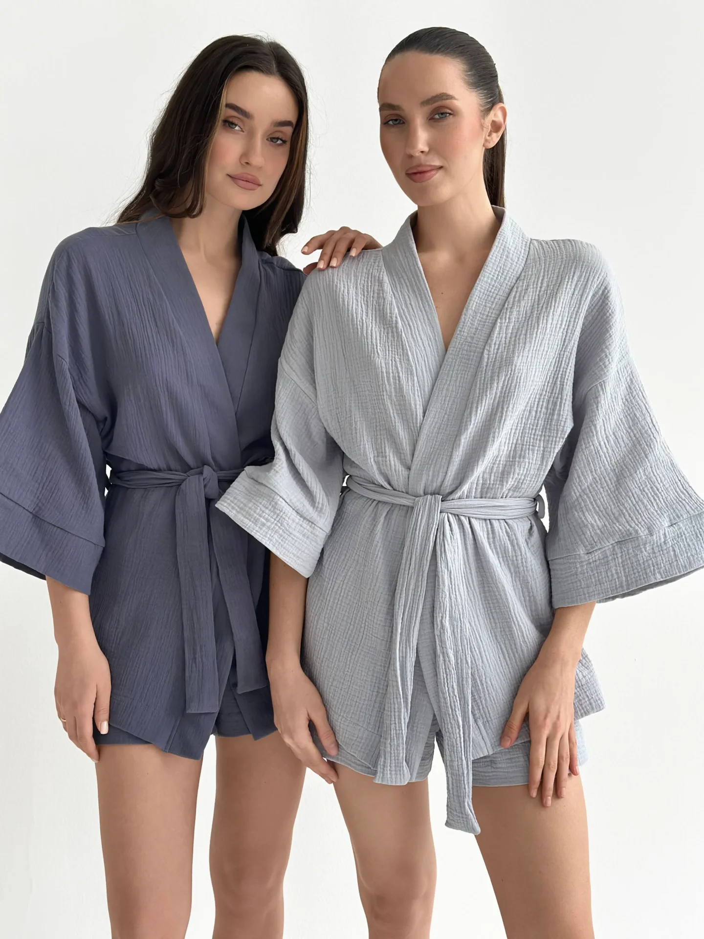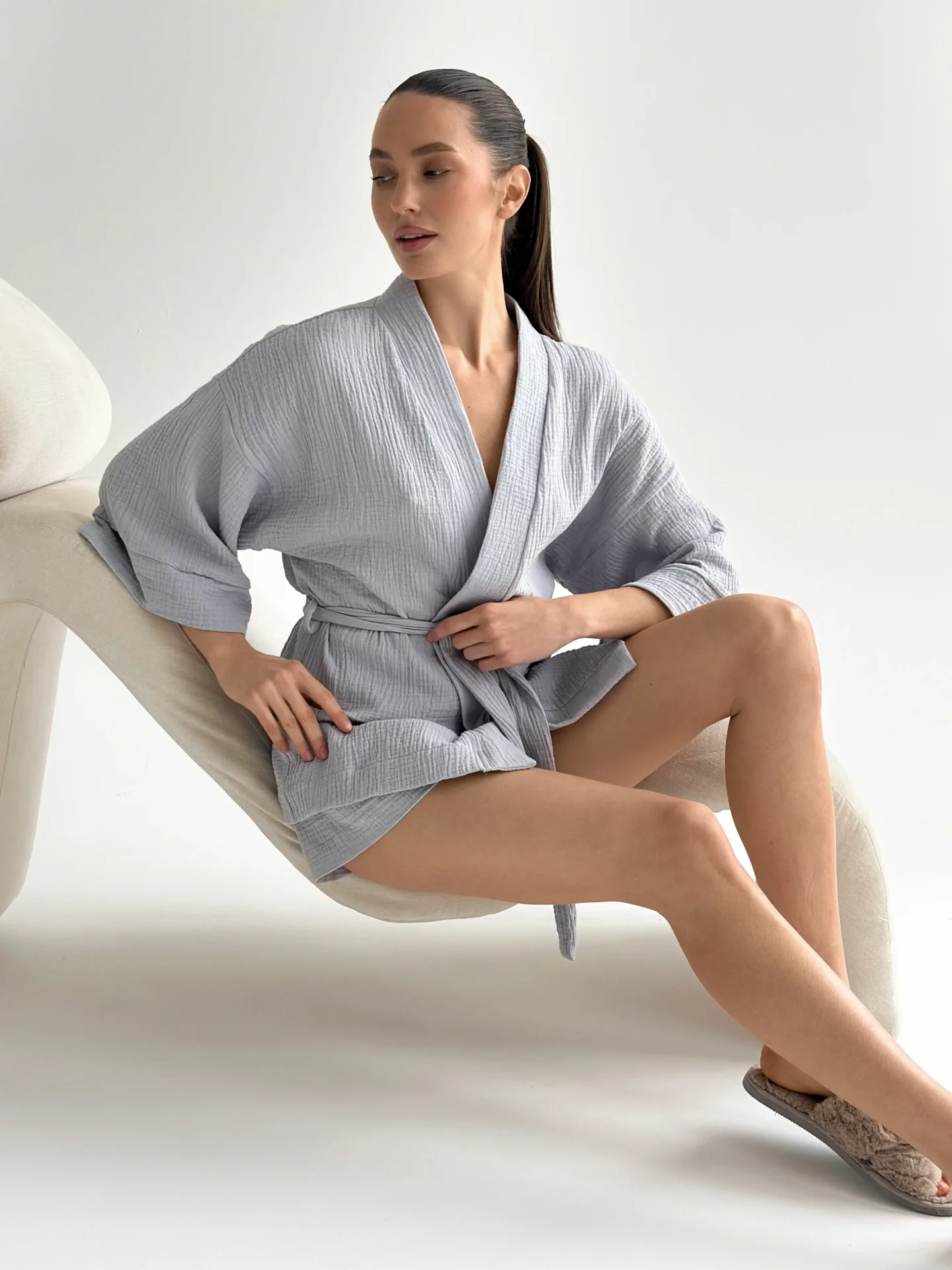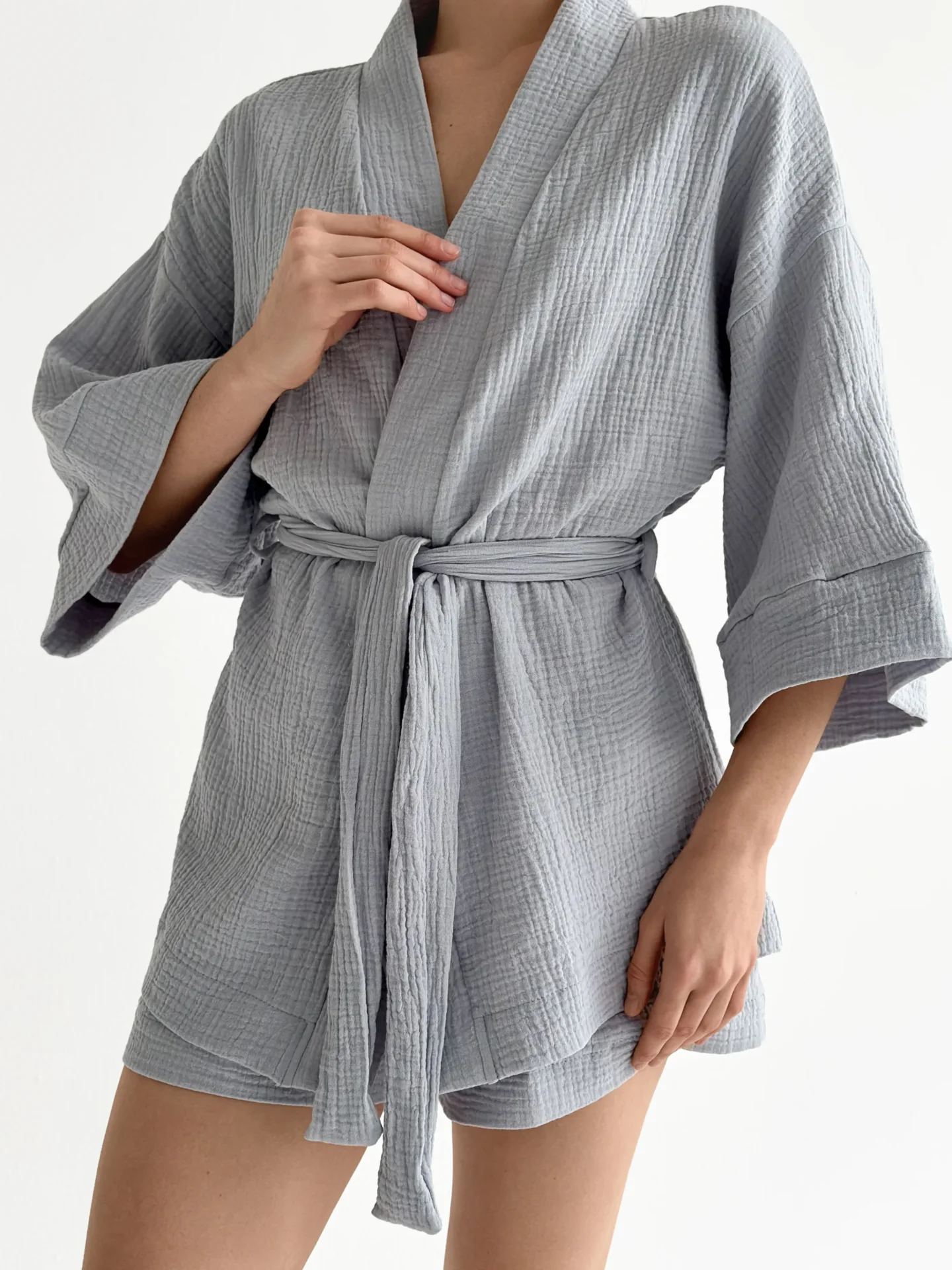 Komplet szlafrok krótki kimono i szorty, z muślinu dwuwarstwowego, szary