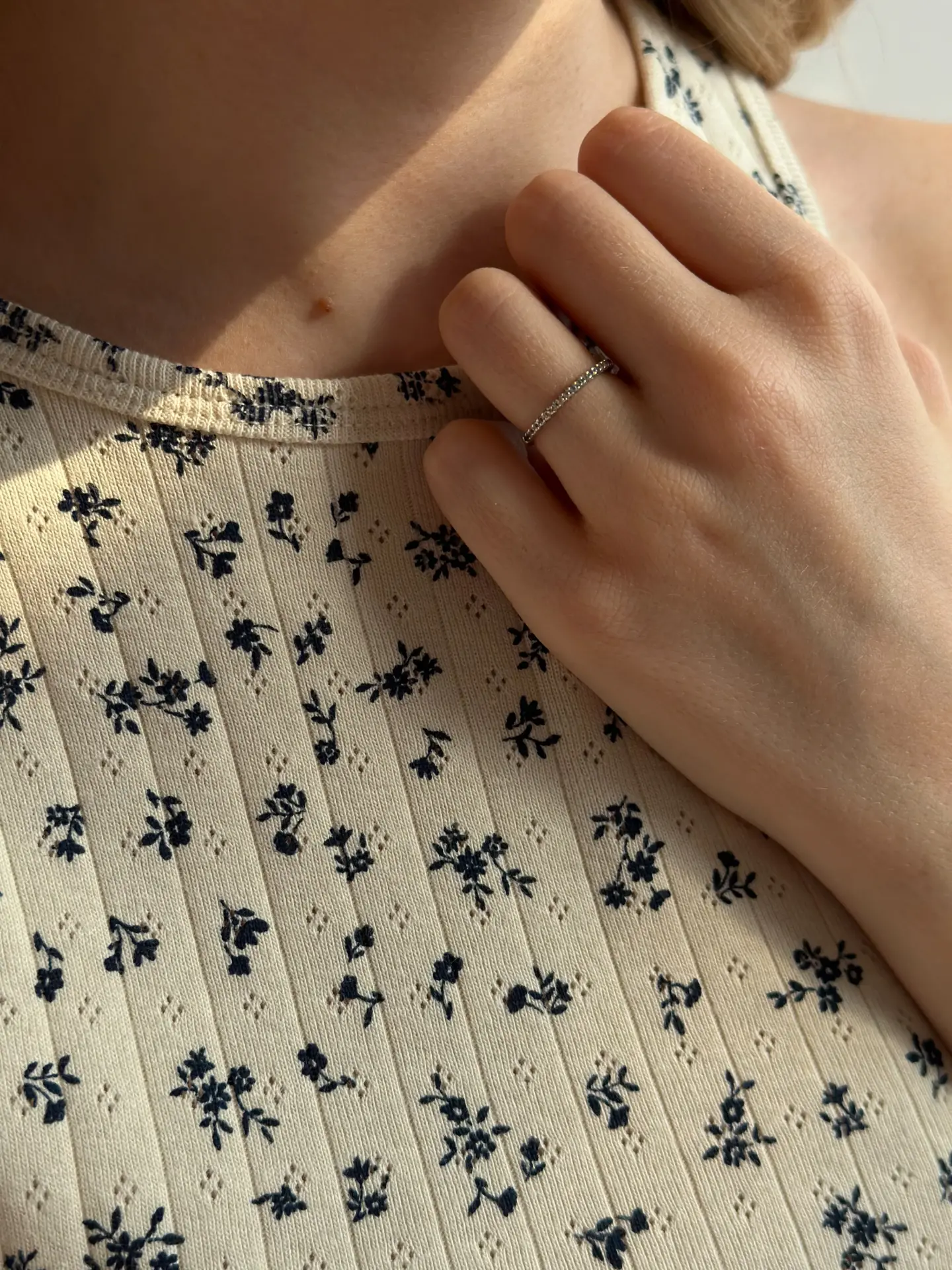 Koszulka bez rękawów z ribany prążkowanej, kremowa w granatowe kwiatki