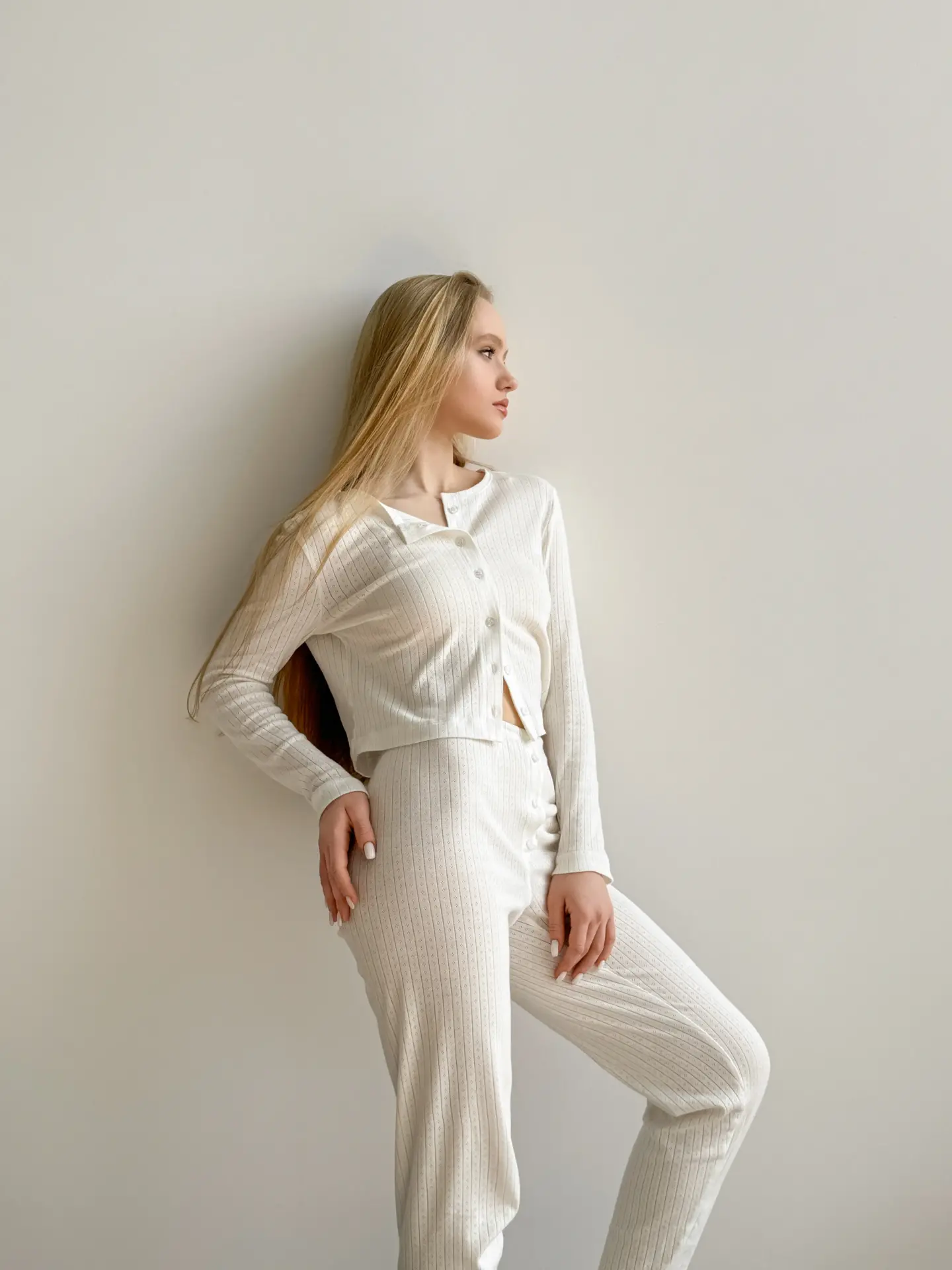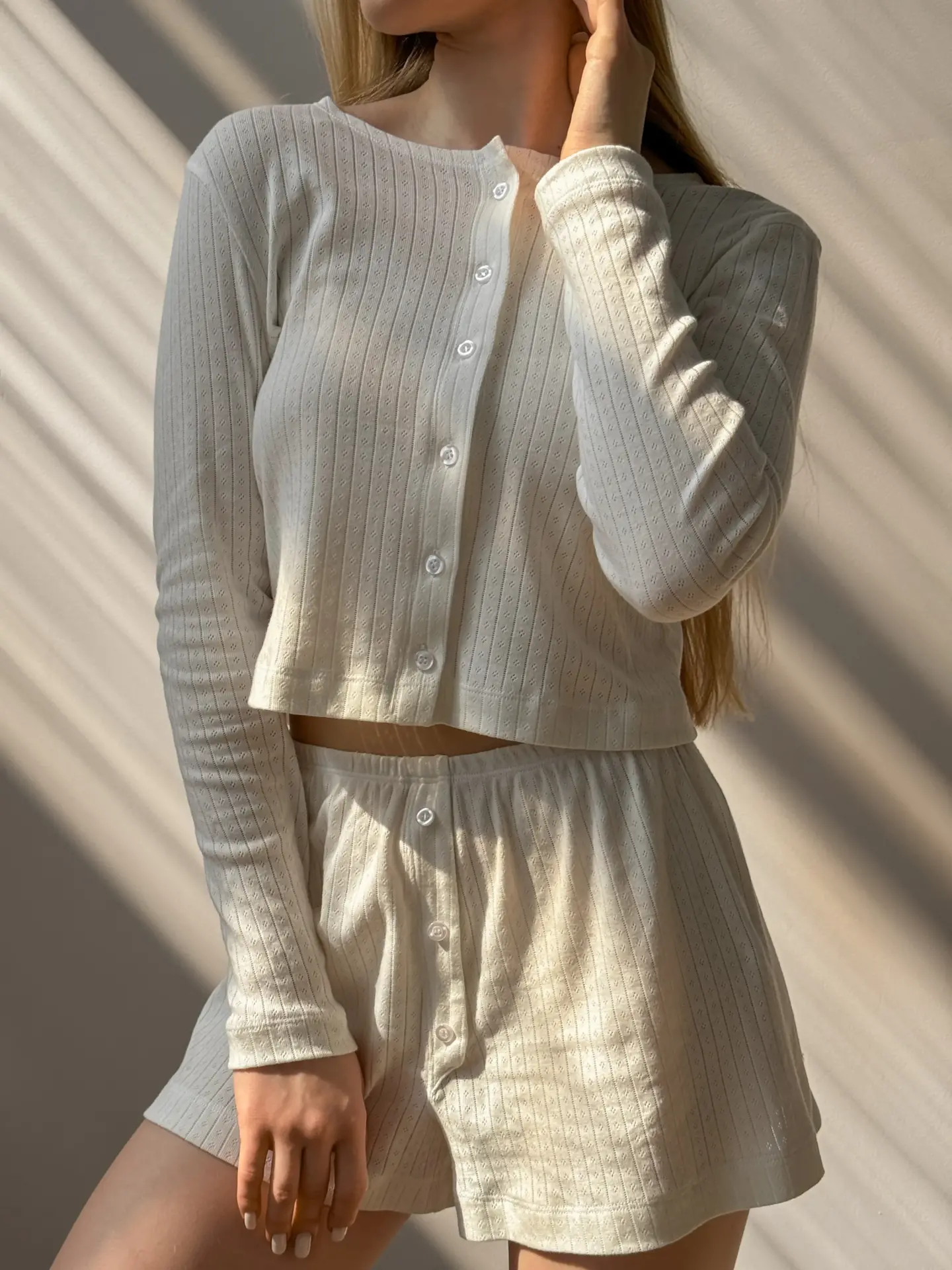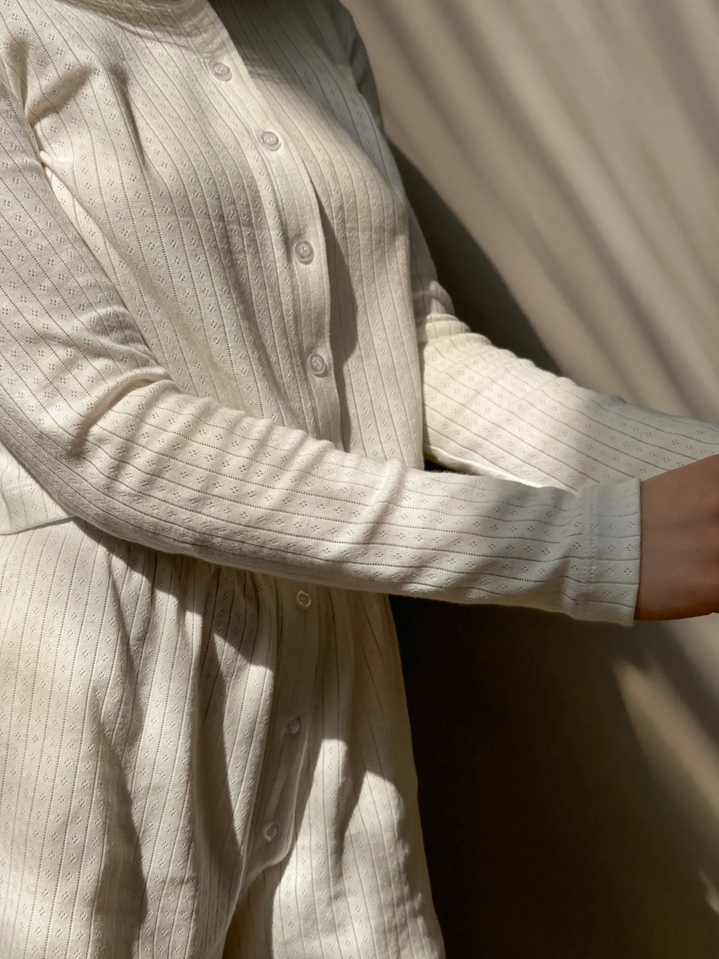 Ażurowy dzianinowy longsleeve tworzy delikatny i romantyczny wygląd, podkreślając kobiecość i lekkość stylu. Dzięki miękkiej fakturze i lekkiemu dopasowaniu do ciała zapewnia komfort i idealnie nadaje się do noszenia w domu lub jako stylowy element codziennej stylizacji.