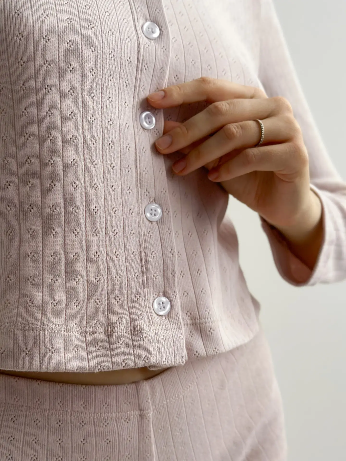 Ażurowy dzianinowy longsleeve tworzy delikatny i romantyczny wygląd, podkreślając kobiecość i lekkość stylu. Dzięki miękkiej fakturze i lekkiemu dopasowaniu do ciała zapewnia komfort i idealnie nadaje się do noszenia w domu lub jako stylowy element codziennej stylizacji.