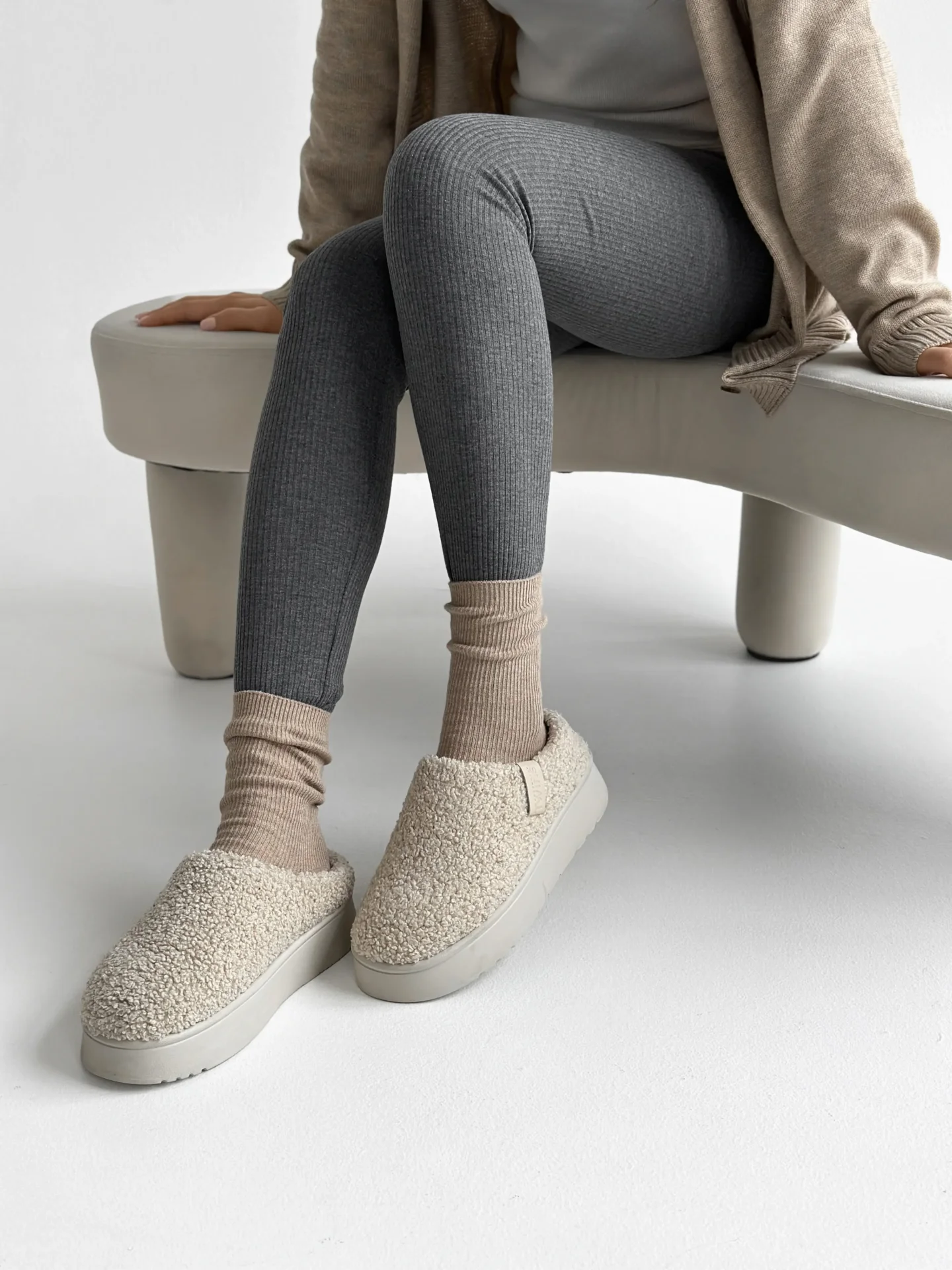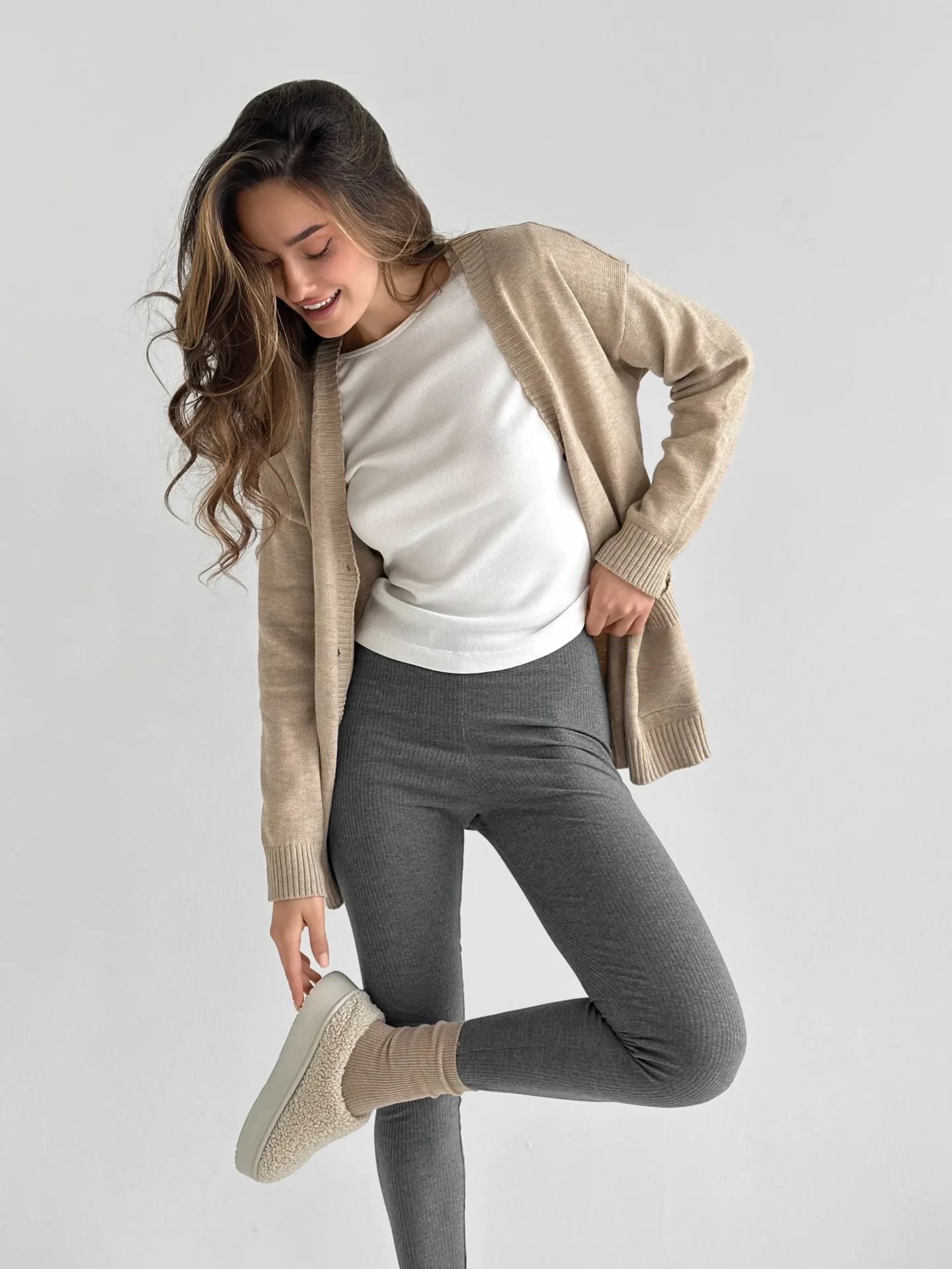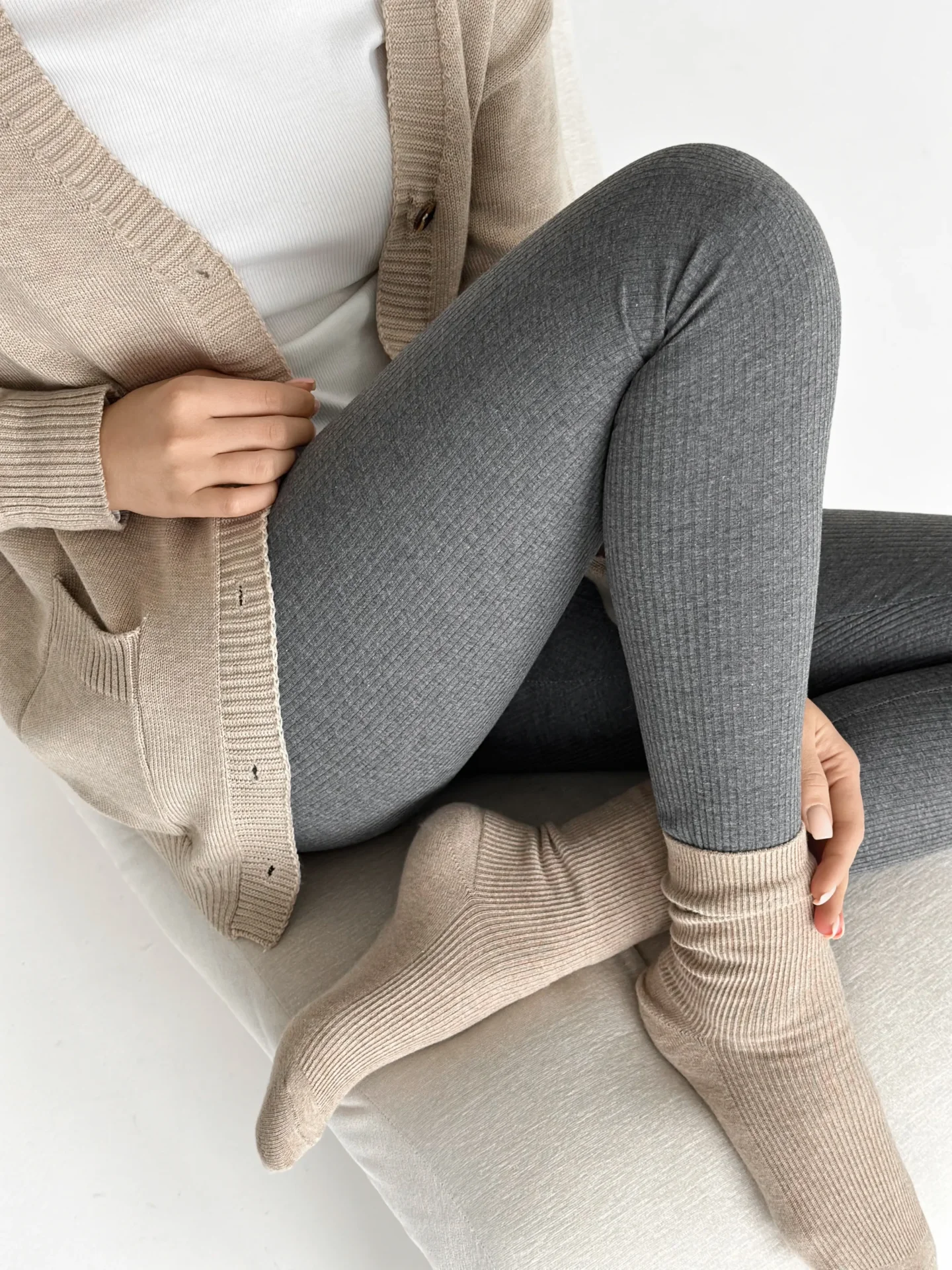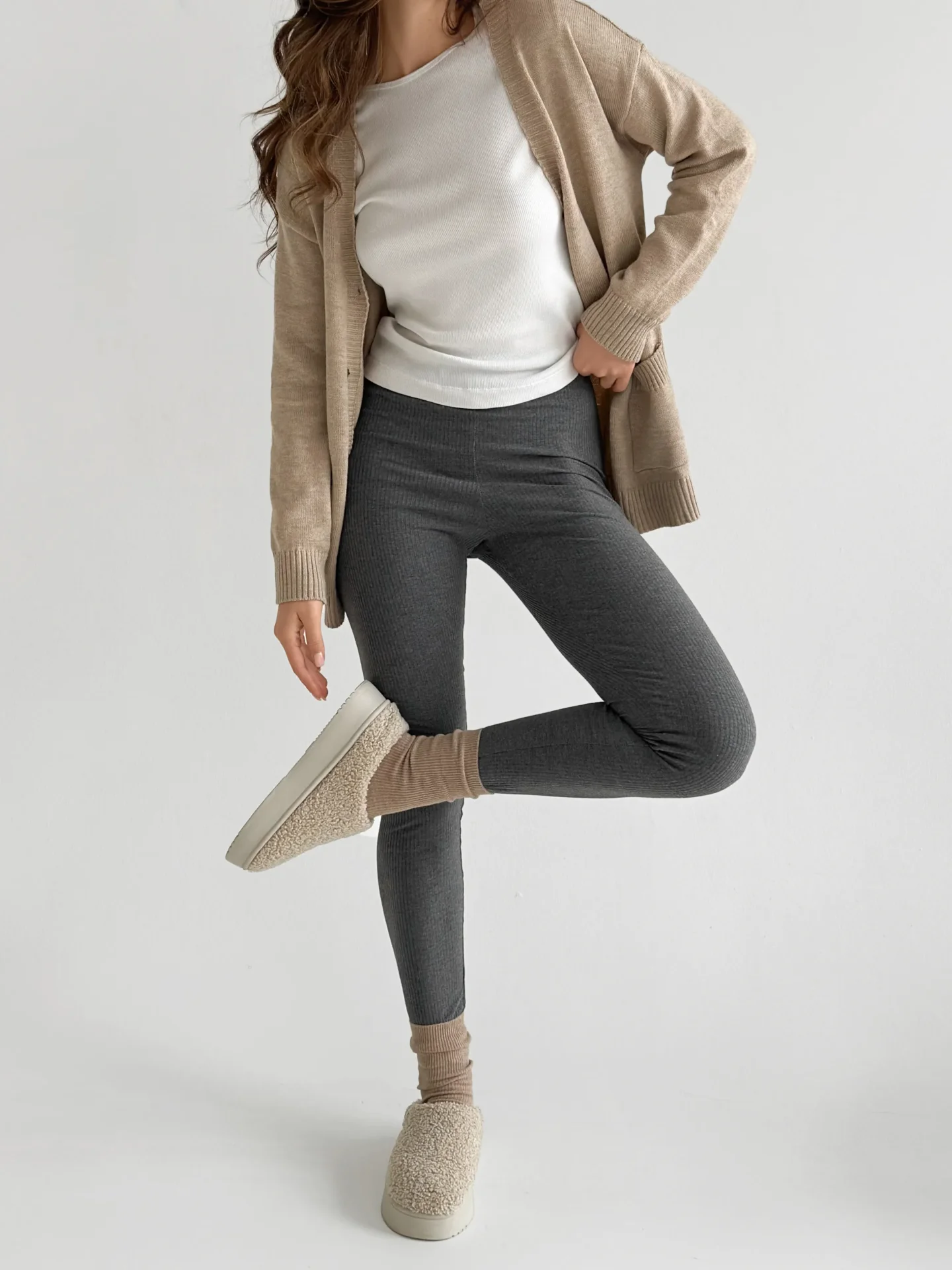 Legginsy z szerokiego prążkowanego dzianinowego materiału zostały stworzone z myślą o maksymalnym komforcie. Elastyczny, miękki materiał przyjemnie dopasowuje się do sylwetki, zapewniając swobodę ruchów przez cały dzień. Modna faktura prążka dodaje stylowego charakteru i sprawia, że model jest uniwersalny zarówno do domu, jak i codziennych stylizacji.