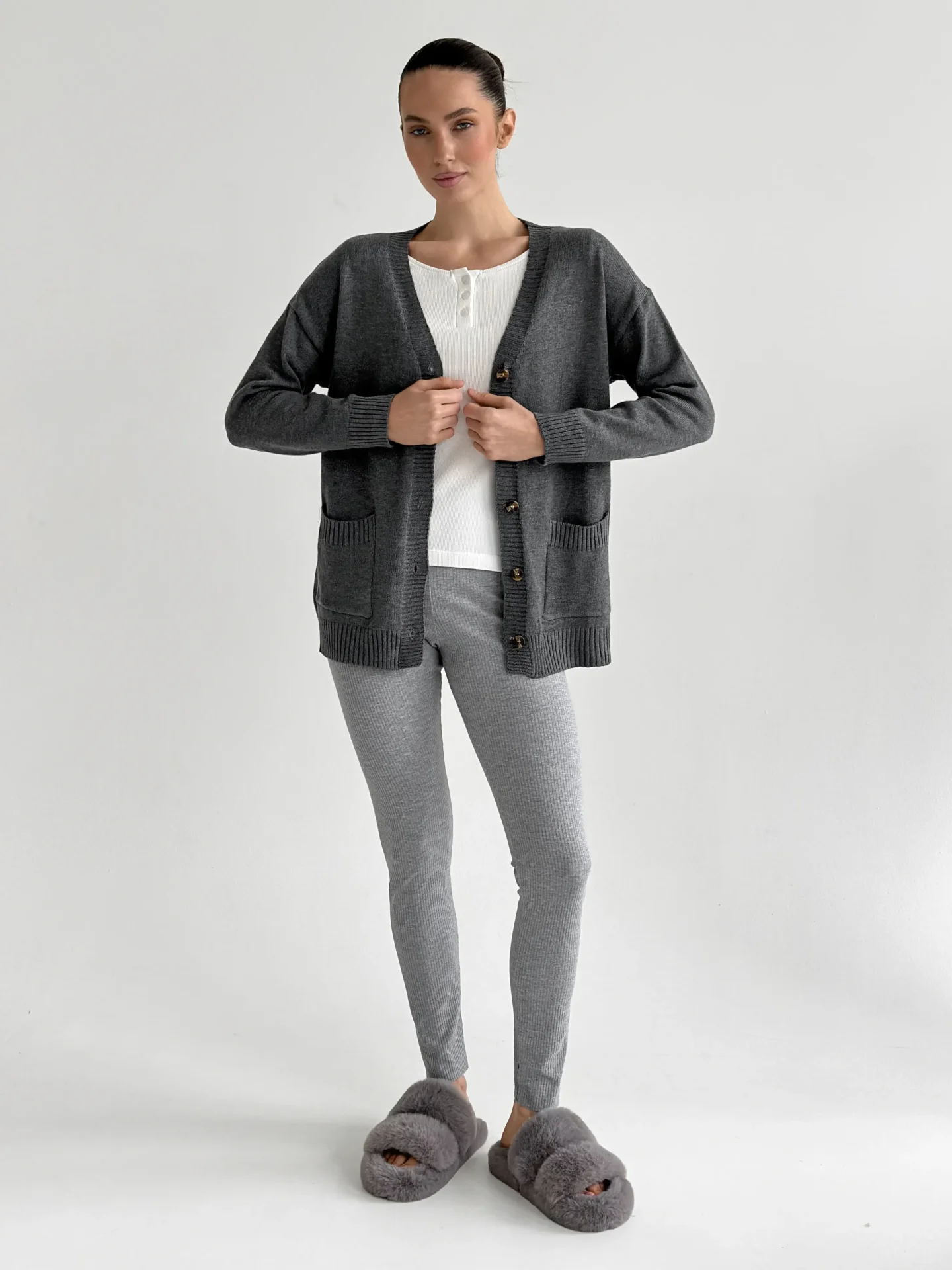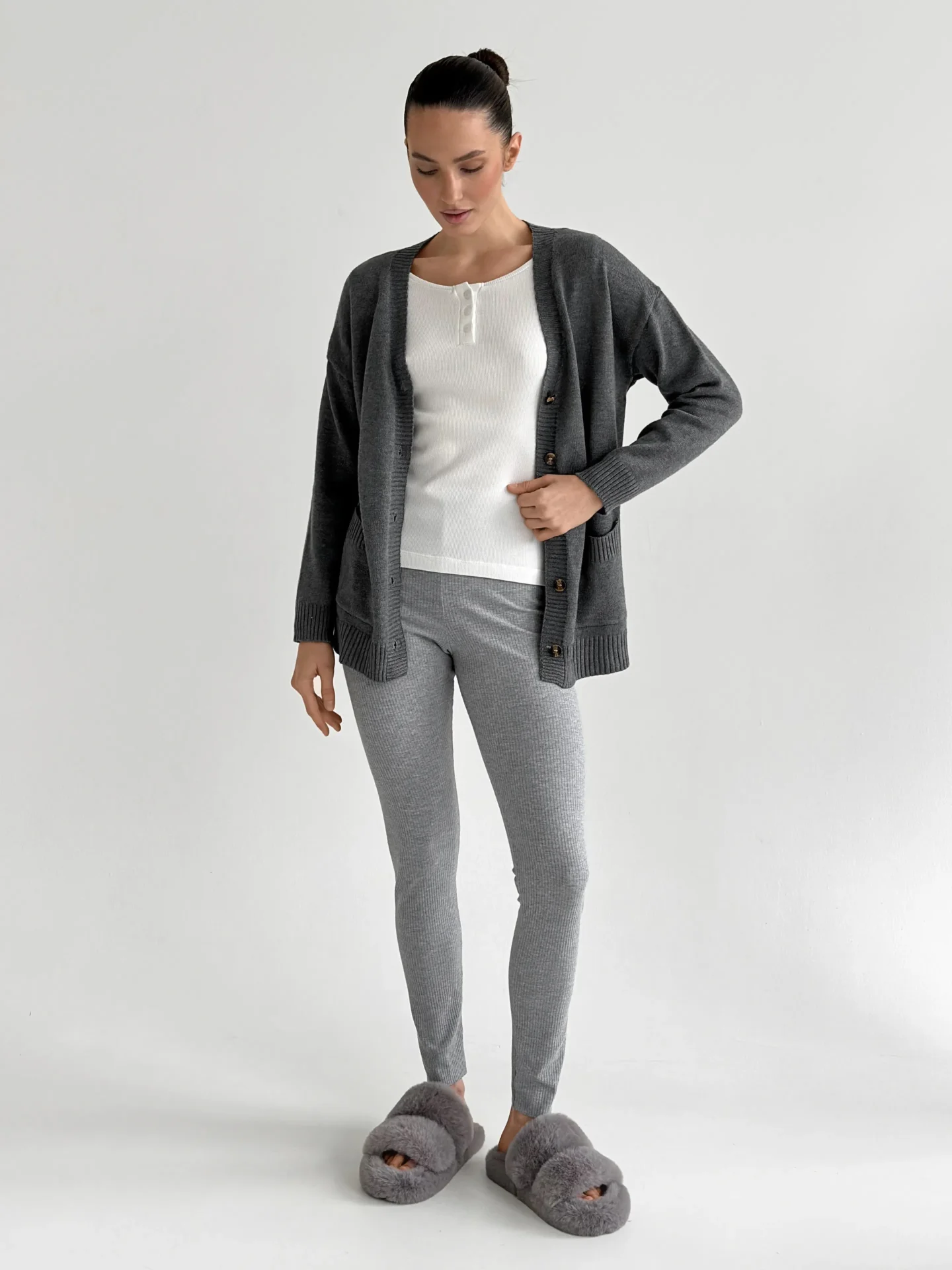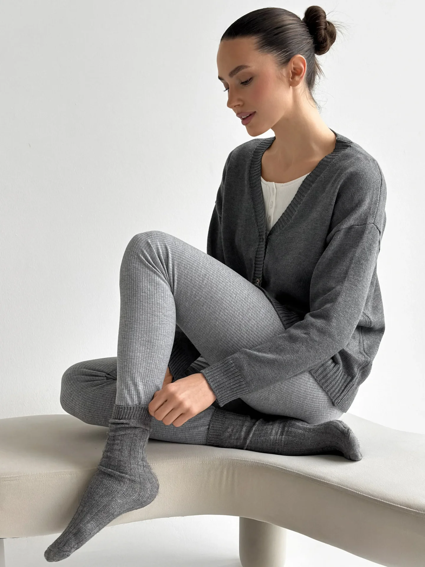 Legginsy z szerokiego prążkowanego dzianinowego materiału zostały stworzone z myślą o maksymalnym komforcie. Elastyczny, miękki materiał przyjemnie dopasowuje się do sylwetki, zapewniając swobodę ruchów przez cały dzień. Modna faktura prążka dodaje stylowego charakteru i sprawia, że model jest uniwersalny zarówno do domu, jak i codziennych stylizacji.