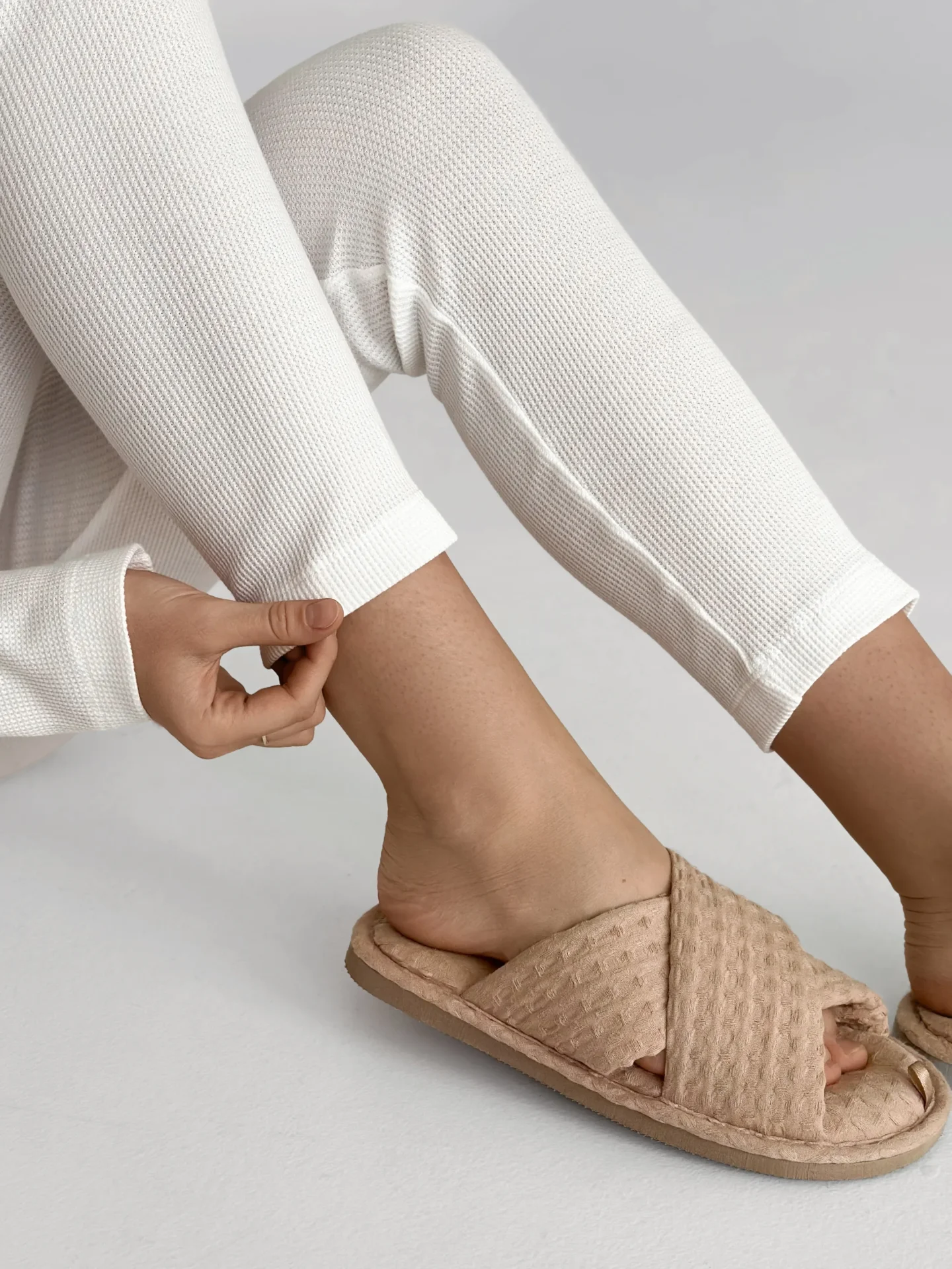Legginsy z waflowej dzianiny zapewniają komfort i miękkość podczas noszenia. Elastyczny materiał delikatnie dopasowuje się do sylwetki i nie ogranicza ruchów. Idealne do domu lub do wygodnych, codziennych stylizacji.