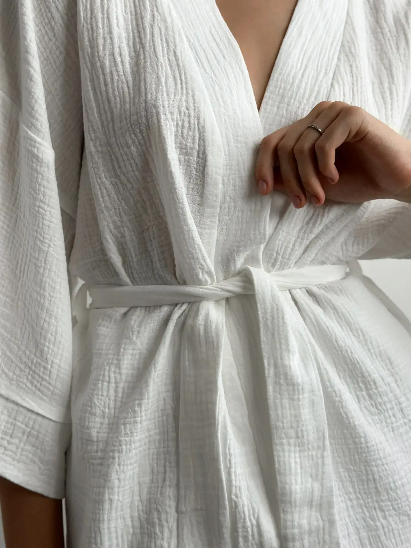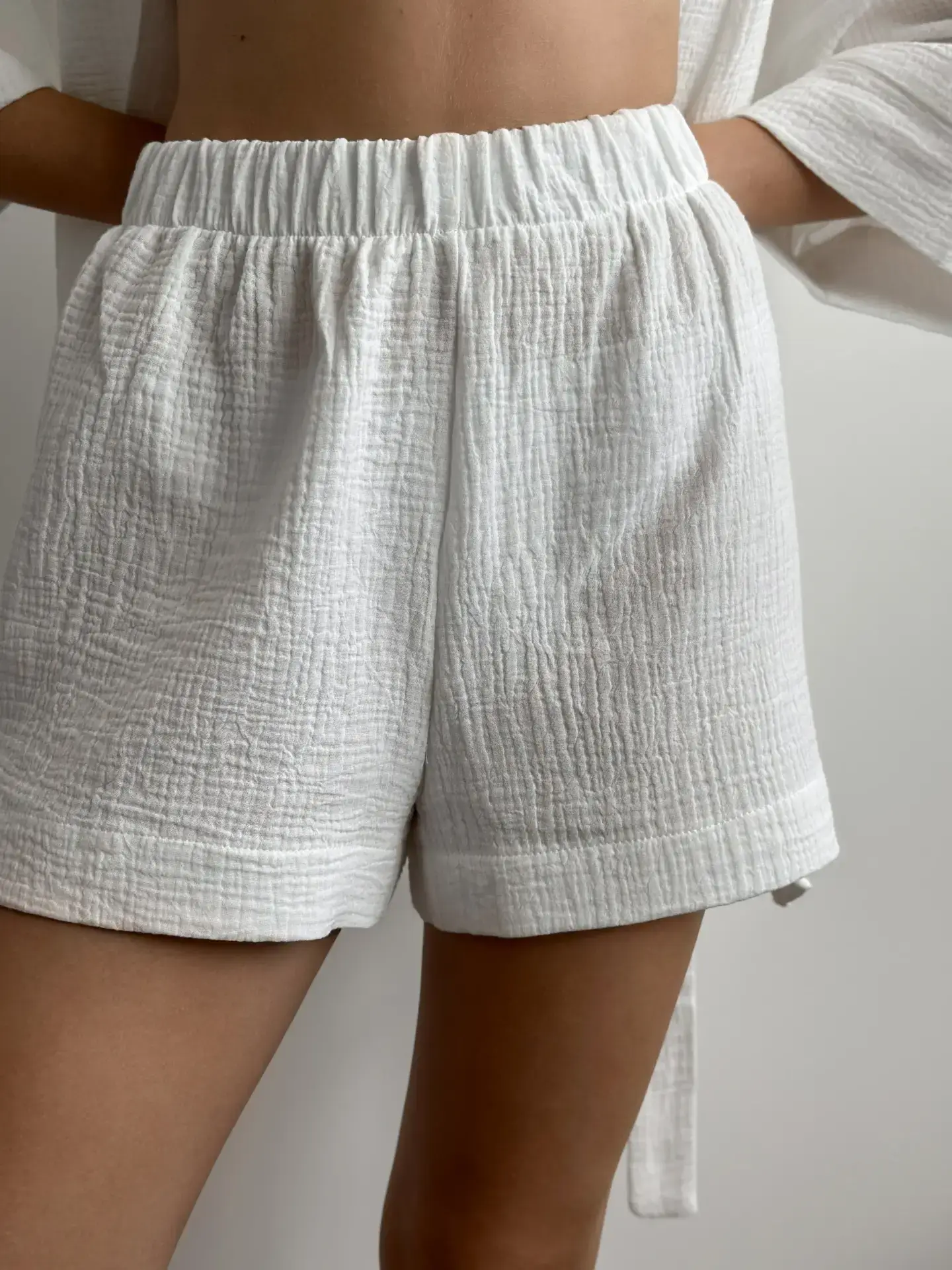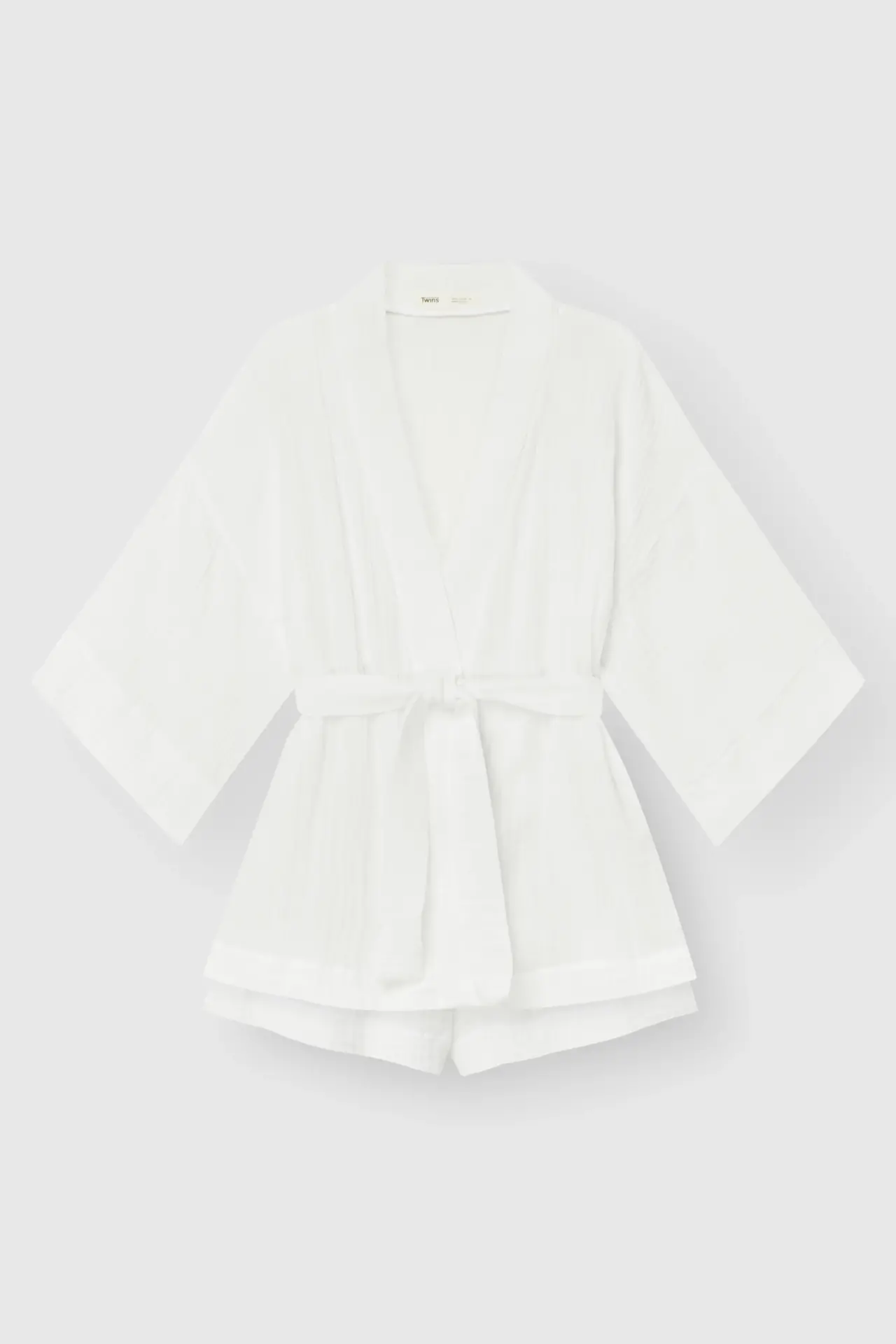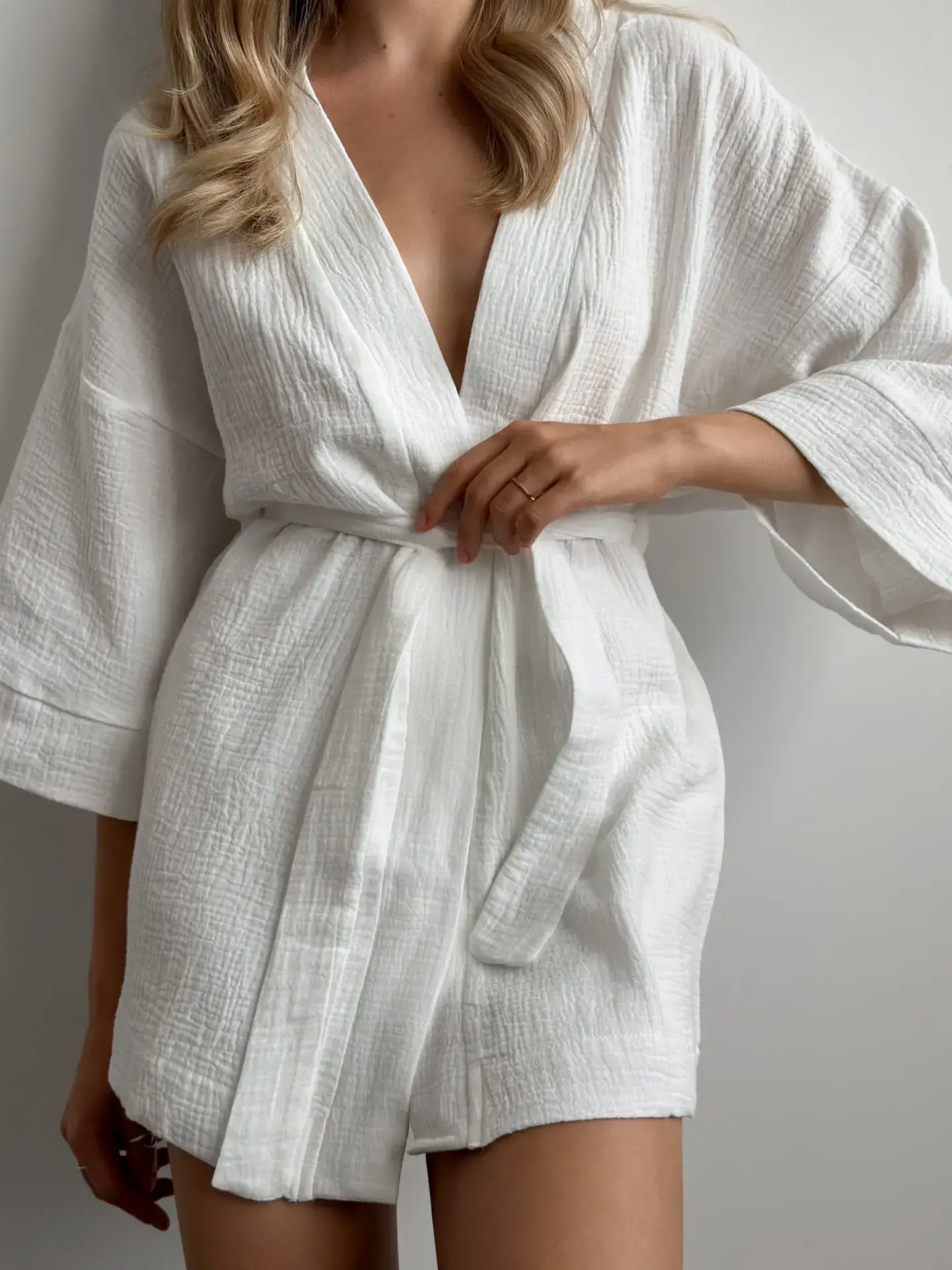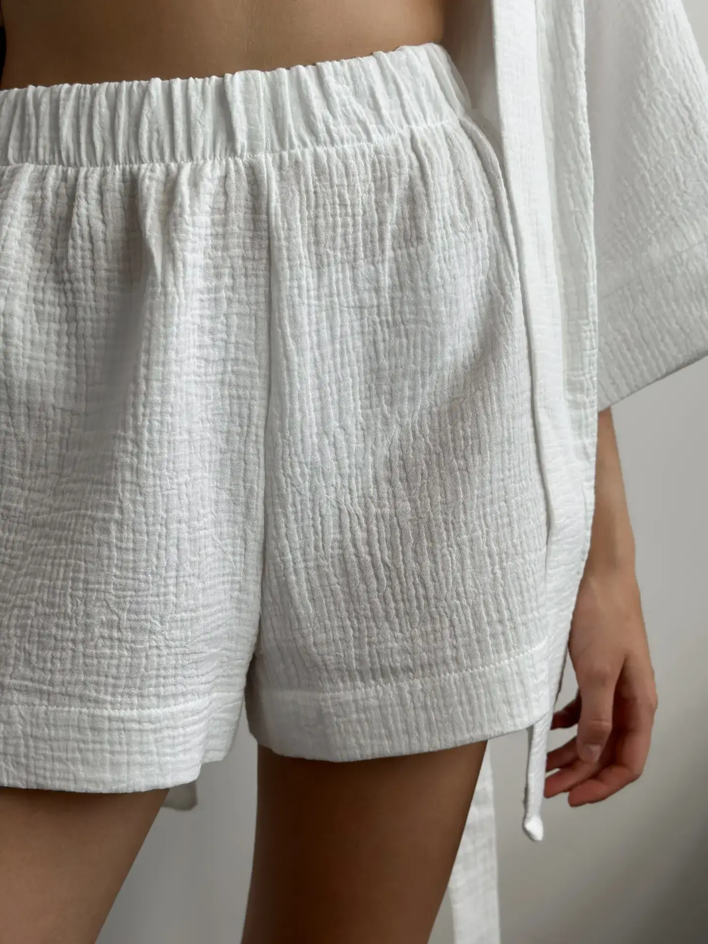 Komplet szlafrok krótki kimono i szorty, z muślinu dwuwarstwowego, biały