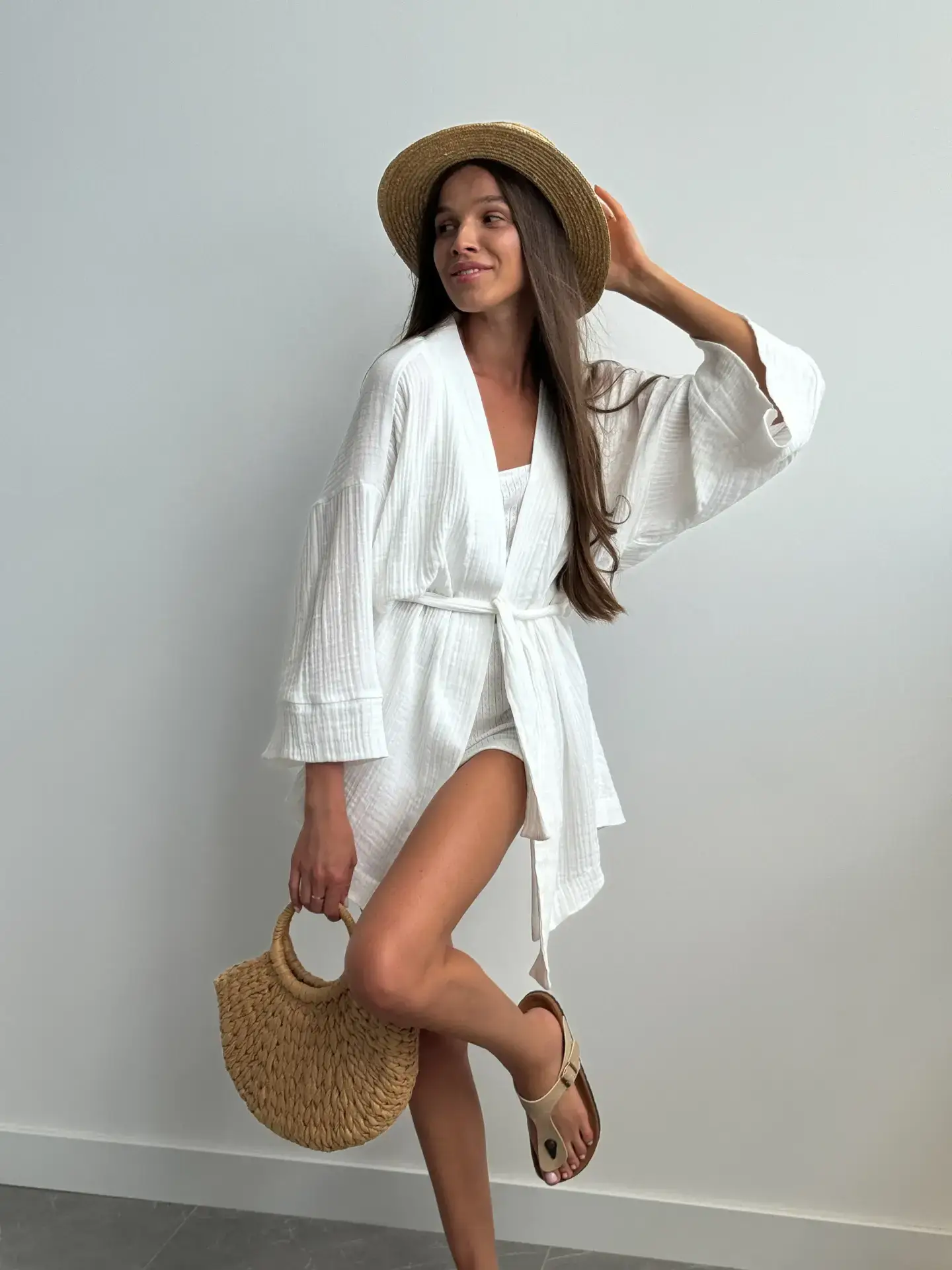 Dwupowłokowy zestaw z muślinu w kolorze białym, składający się z kimona i szortów, wygląda delikatnie i elegancko. Biały muślin nadaje stylizacji świeżości i lekkości, a dwuwarstwowy materiał sprawia, że zestaw jest bardziej gęsty, zachowując jednocześnie jego przewiewność.