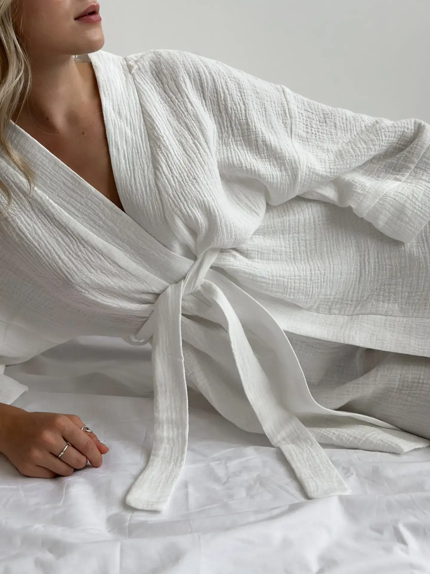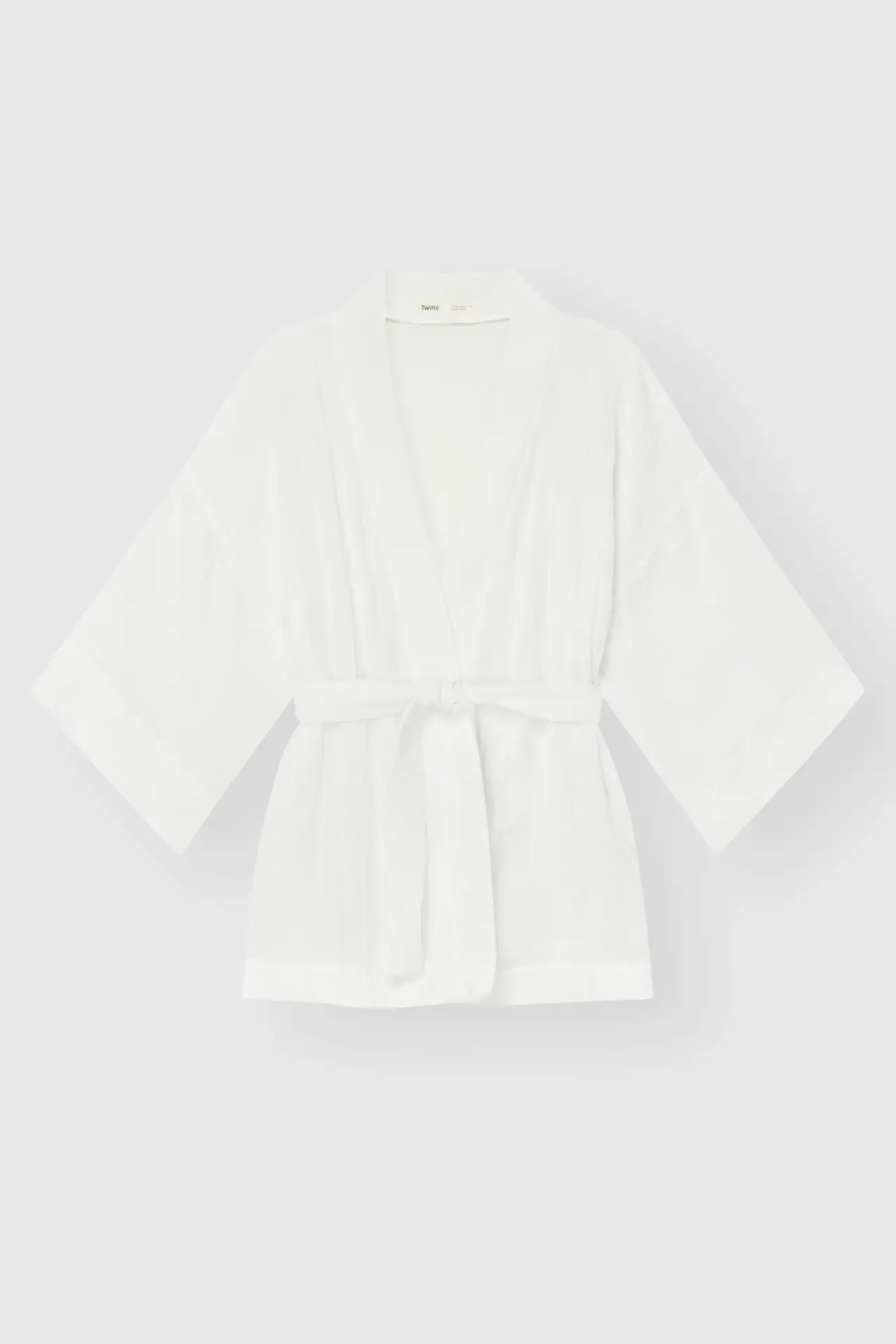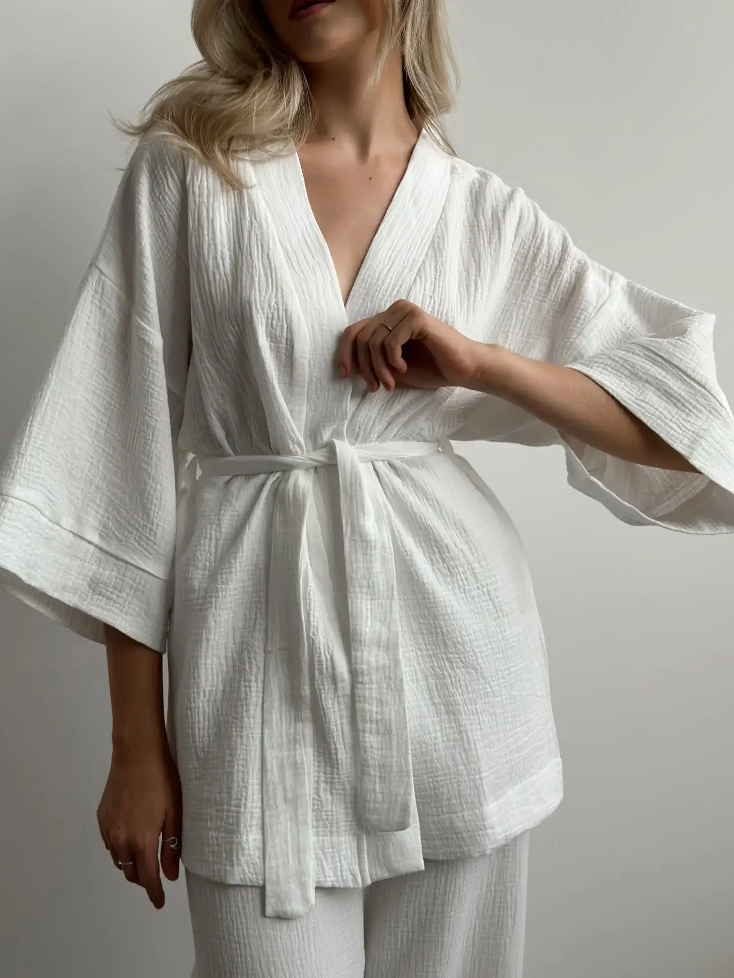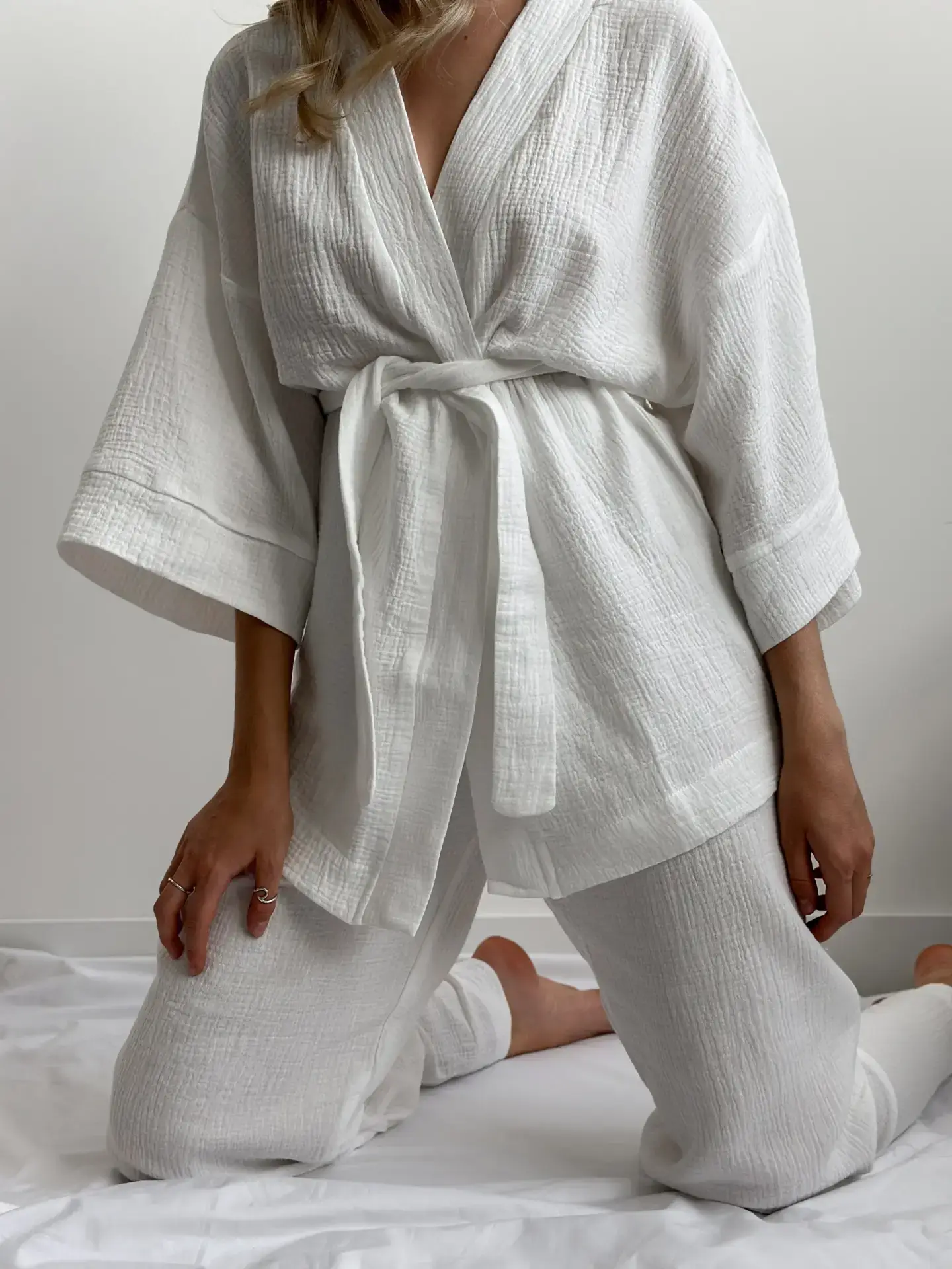 Komplet szlafrok krótki kimono i spodnie, z muślinu dwuwarstwowego, biały - Miso