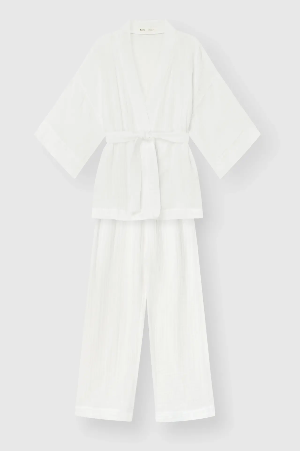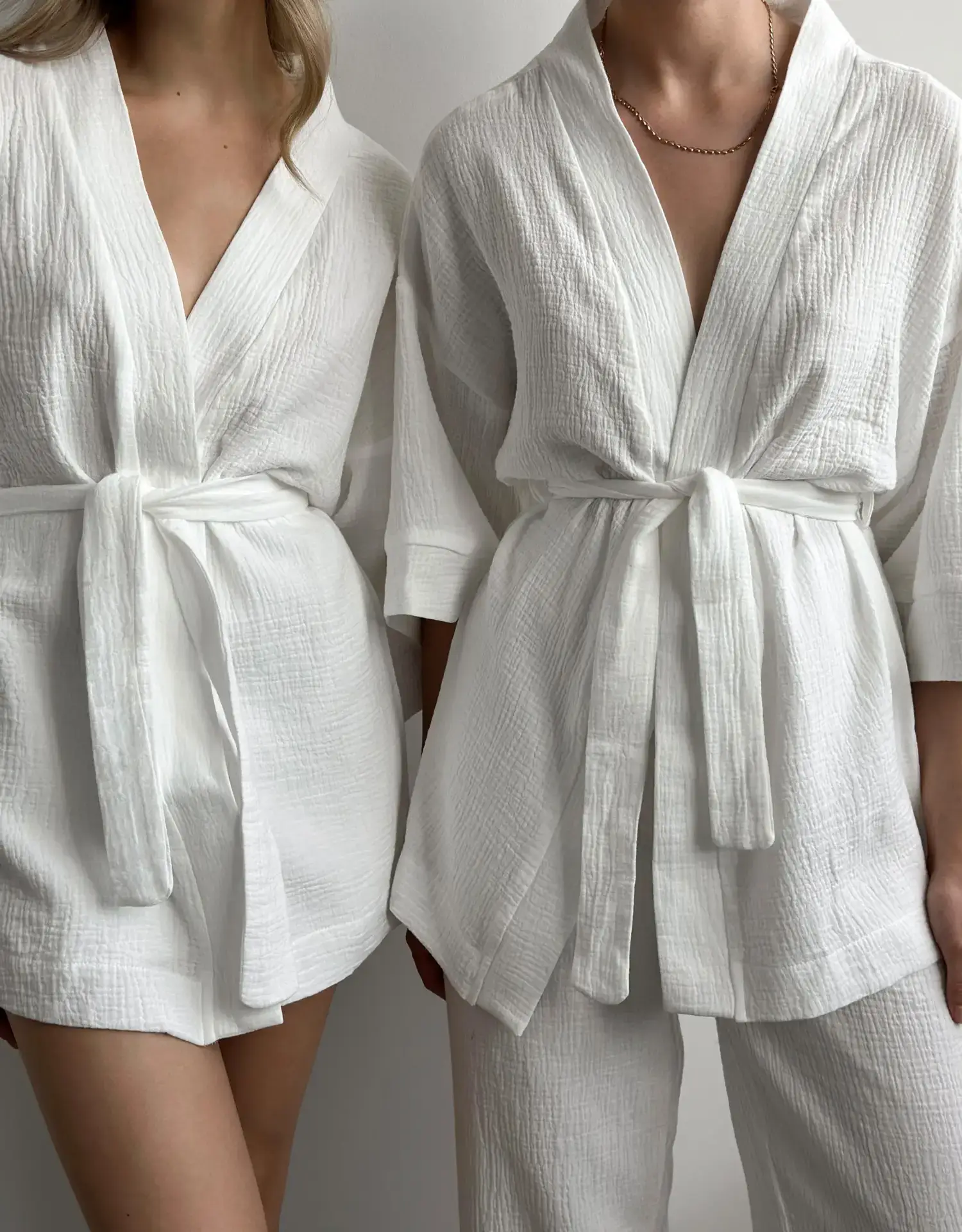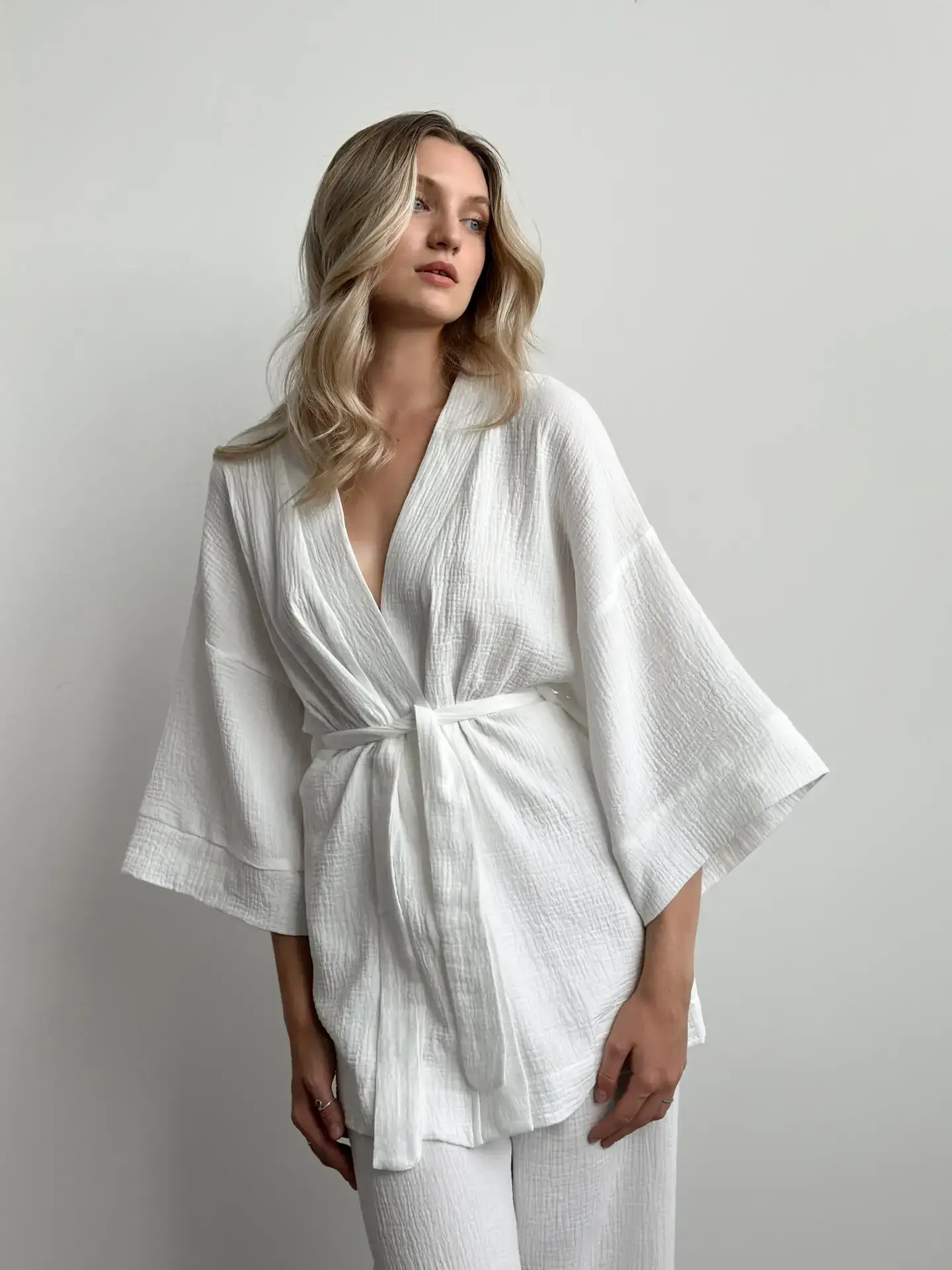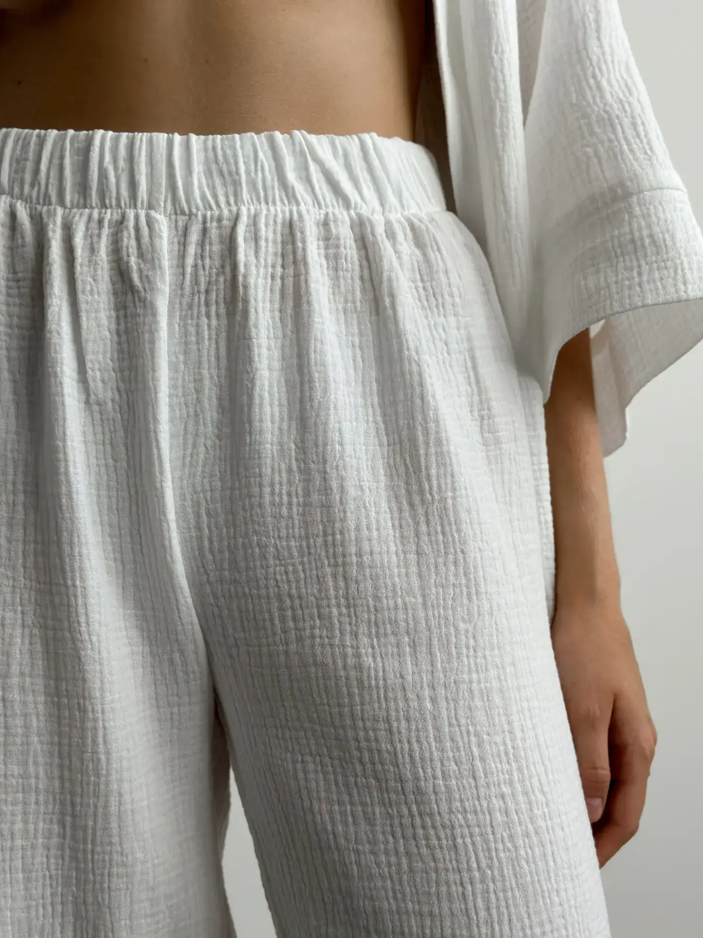 Komplet szlafrok krótki kimono i spodnie, z muślinu dwuwarstwowego, biały