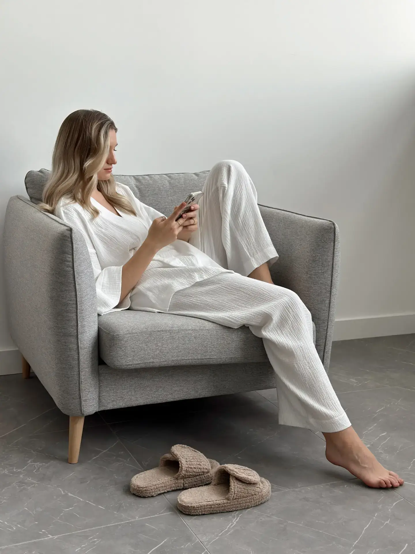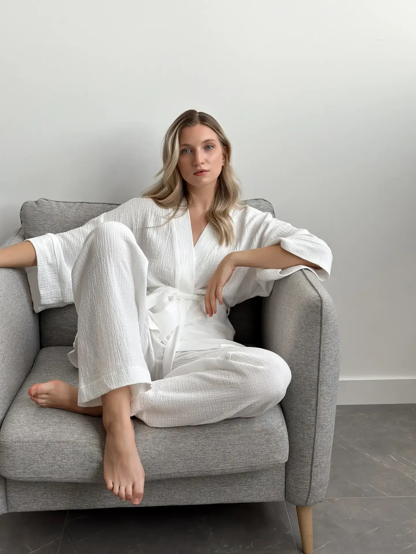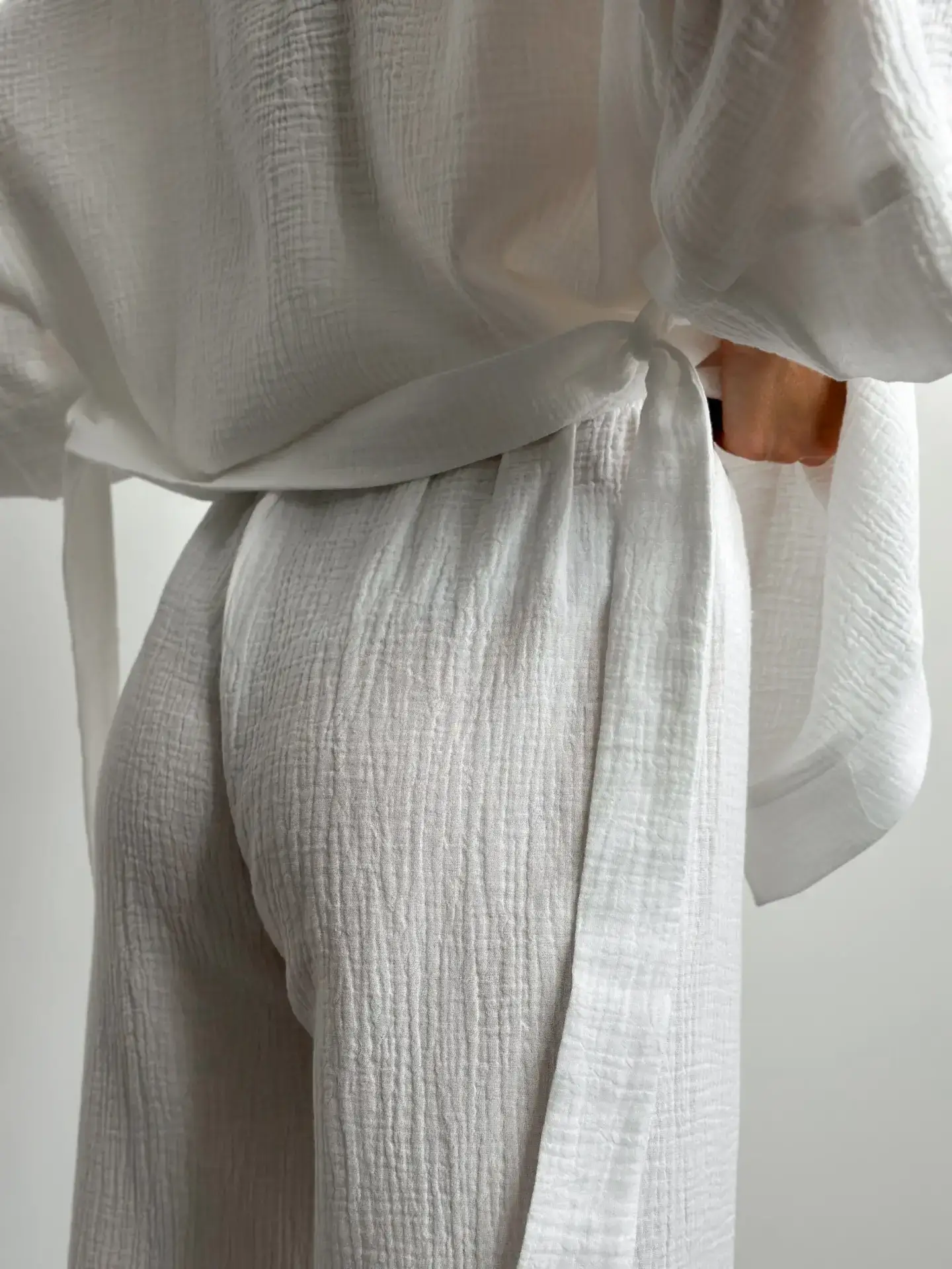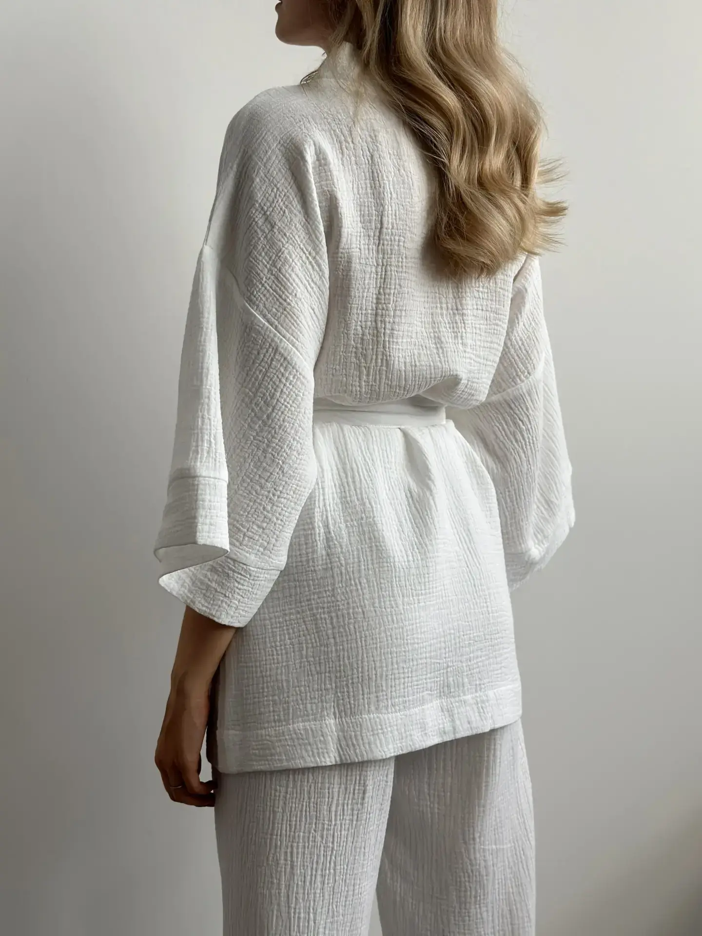 Lekki zestaw z muślinu: kimono i spodnie z dwuwarstwowej tkaniny. Naturalny materiał zapewnia komfort i swobodę ruchów, idealny wybór na przytulne dni.