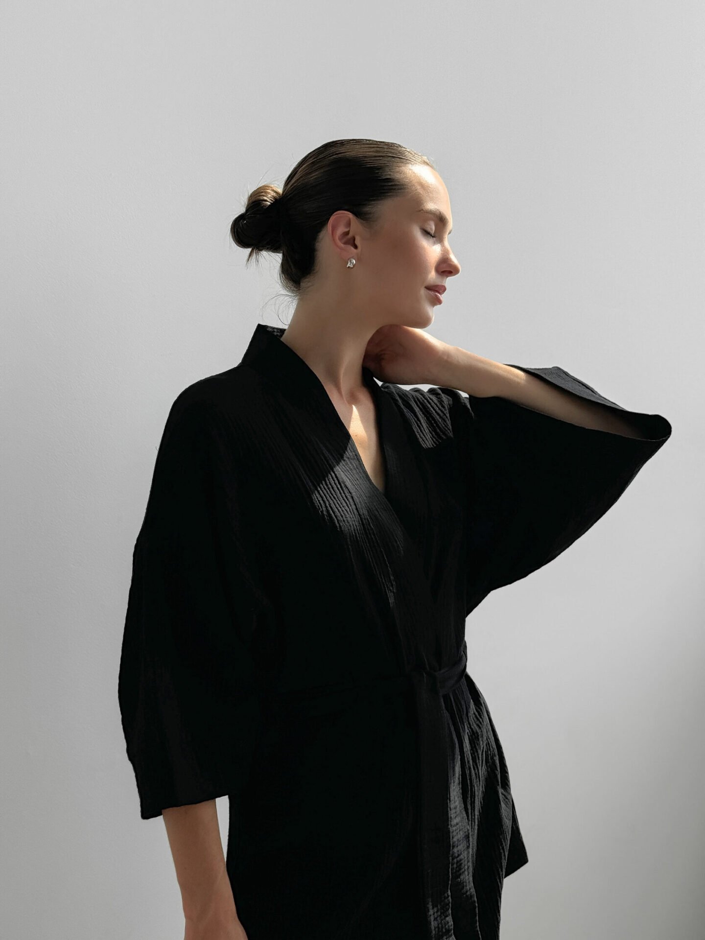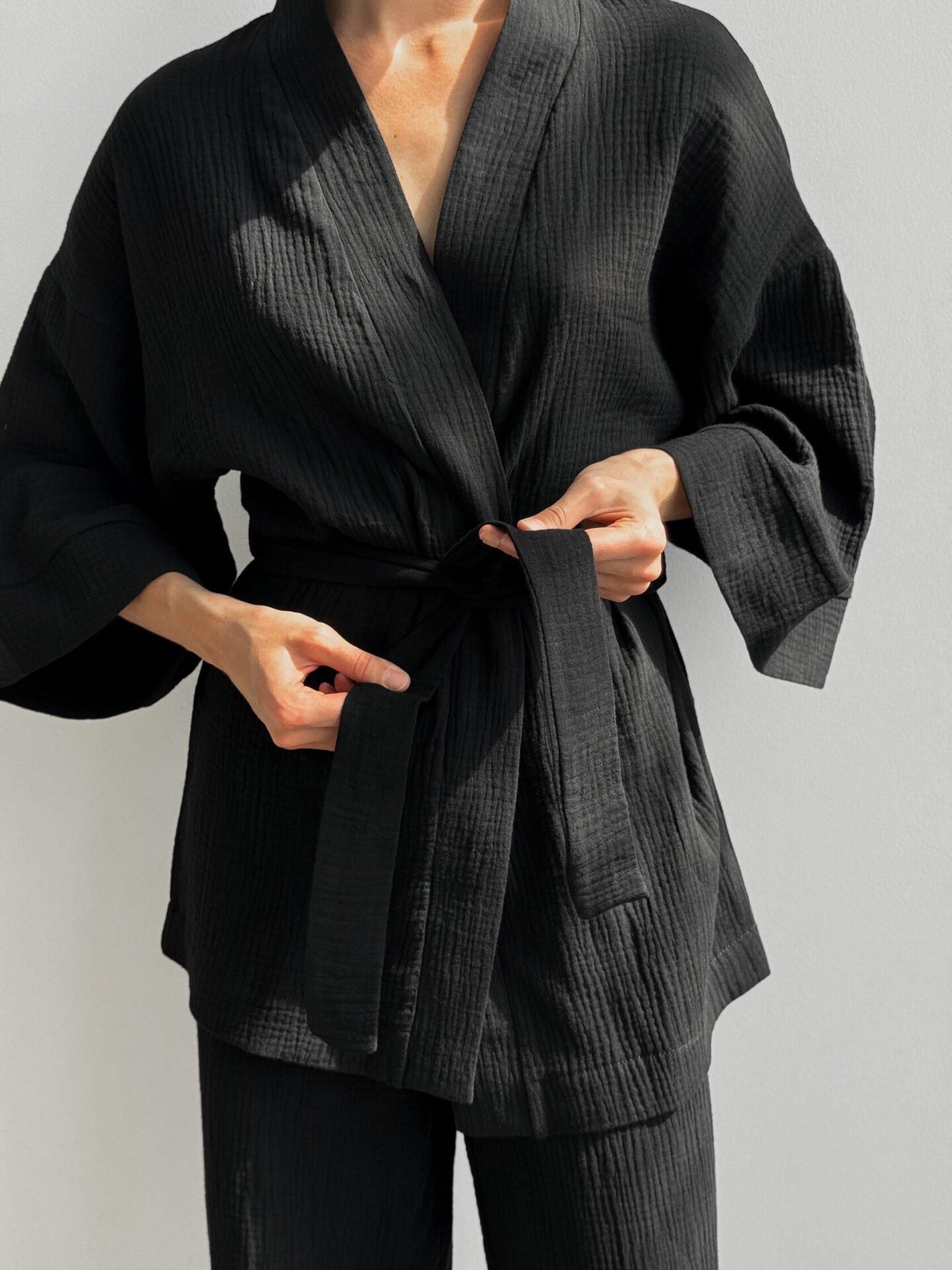 Komplet szlafrok krótki kimono i spodnie, z muślinu dwuwarstwowego, czarny - Miso