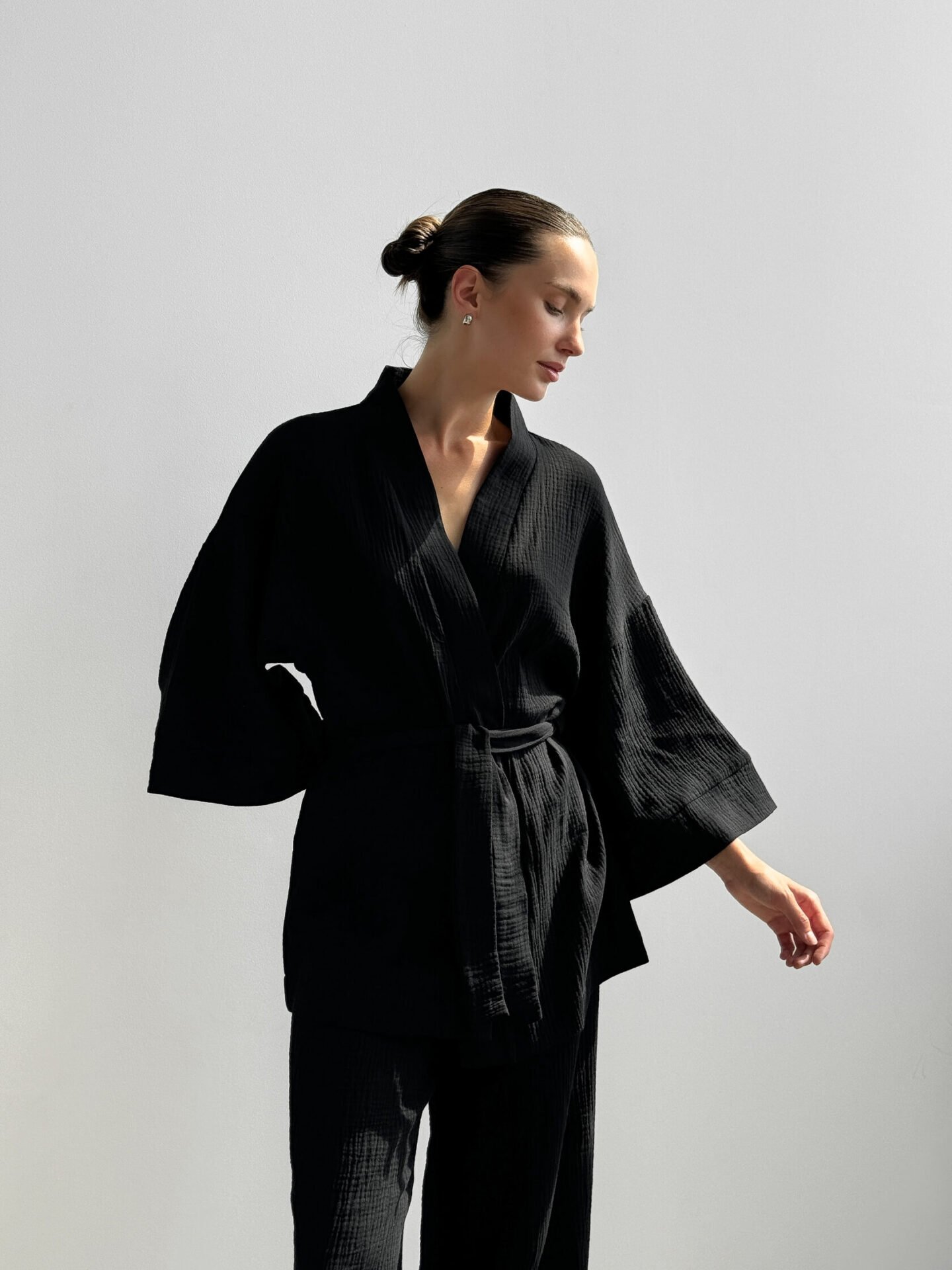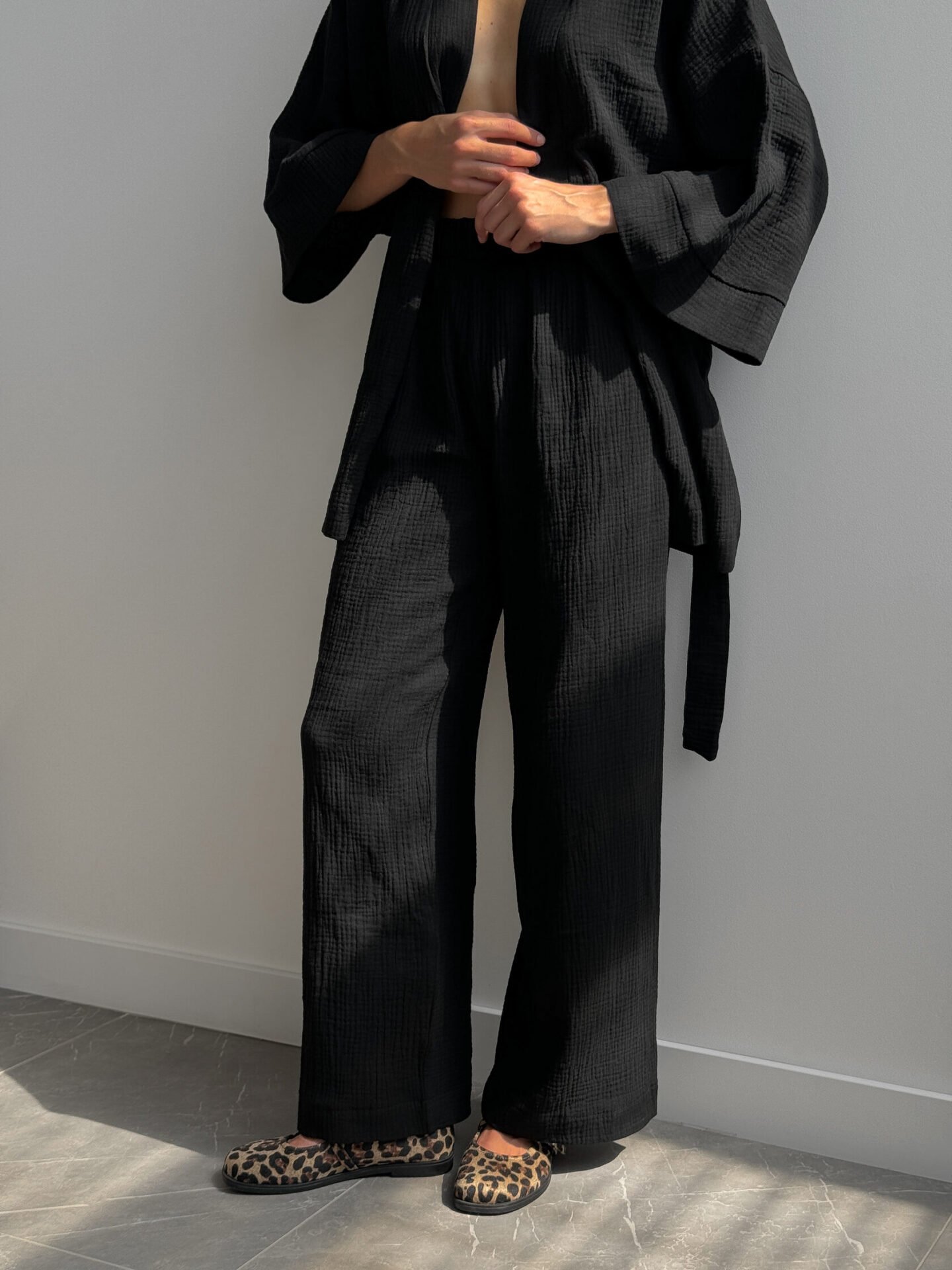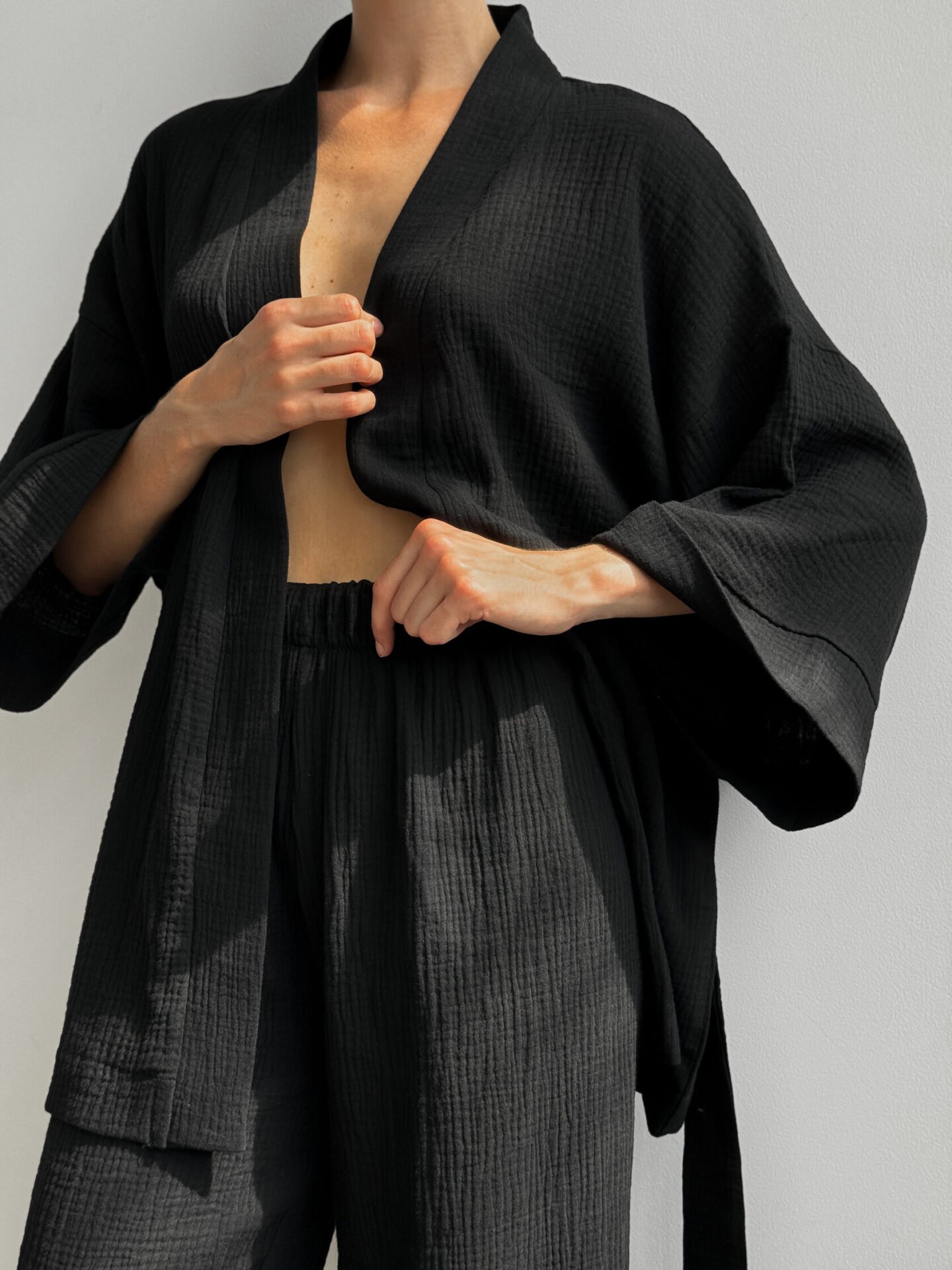 Lekki zestaw z muślinu z 2-warstwowej tkaniny: kimono i spodnie. Naturalny materiał zapewnia komfort i swobodę, tworząc stylowy i przytulny wygląd.
