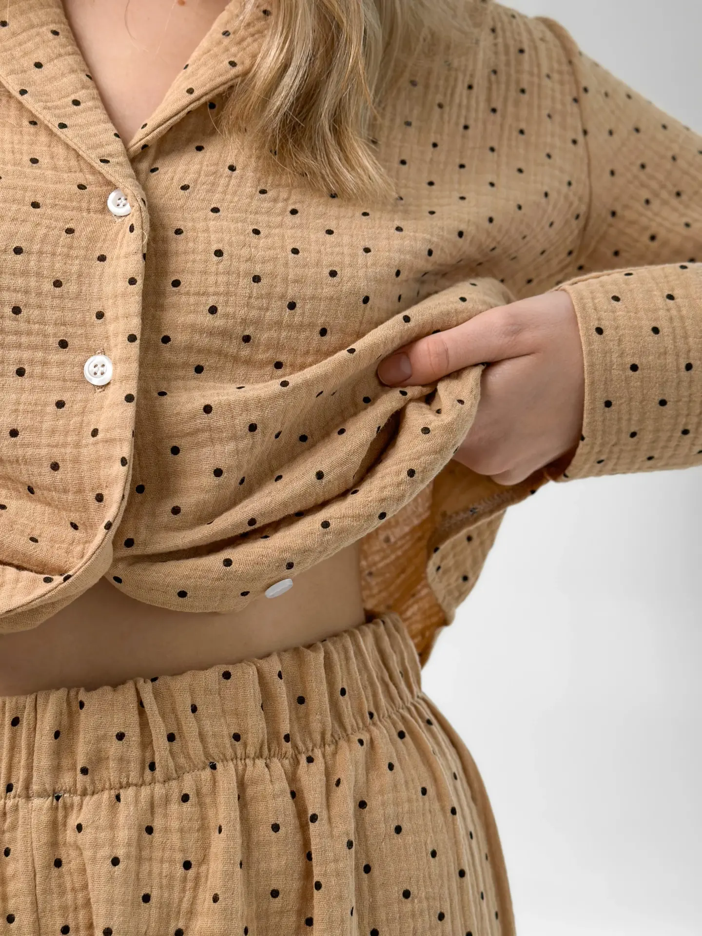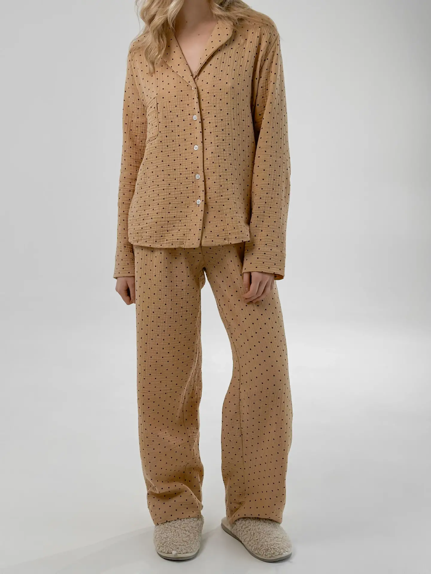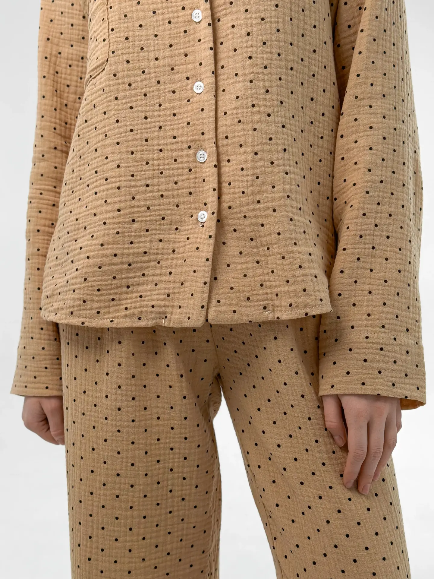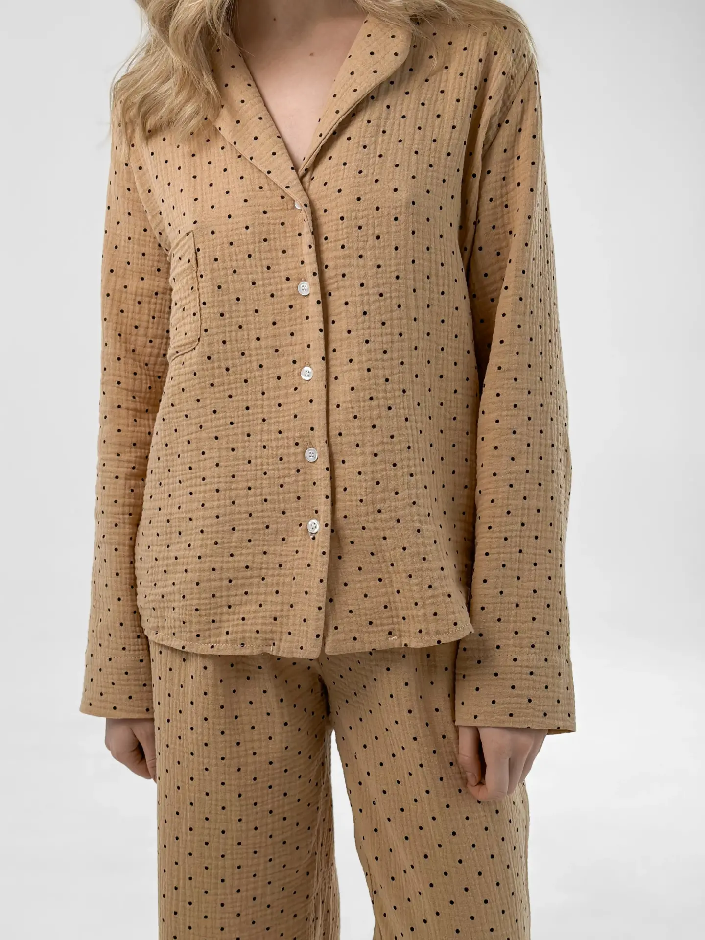 Komplet piżamowy koszula i spodnie, z muślinu, brązowy w groszki