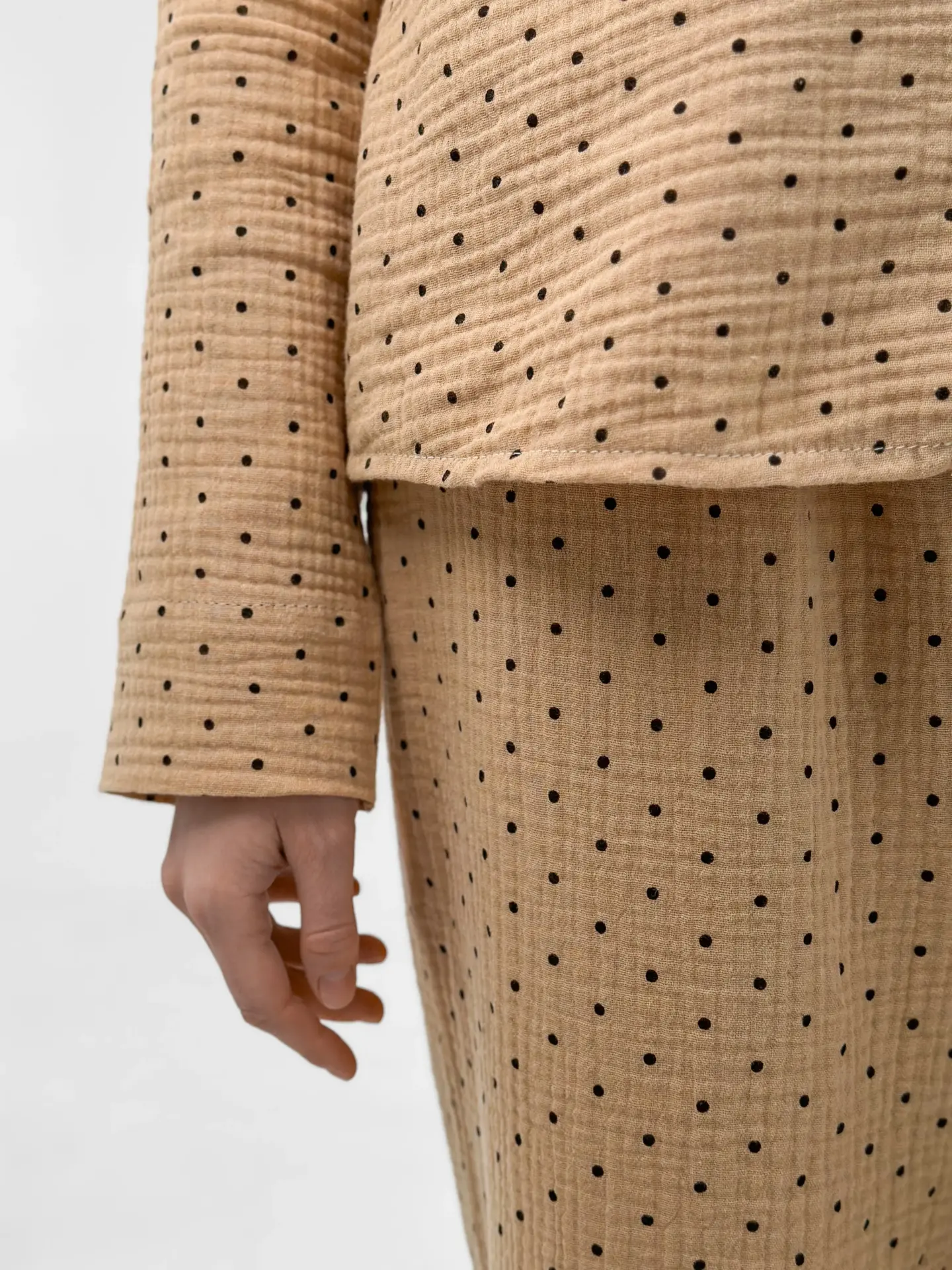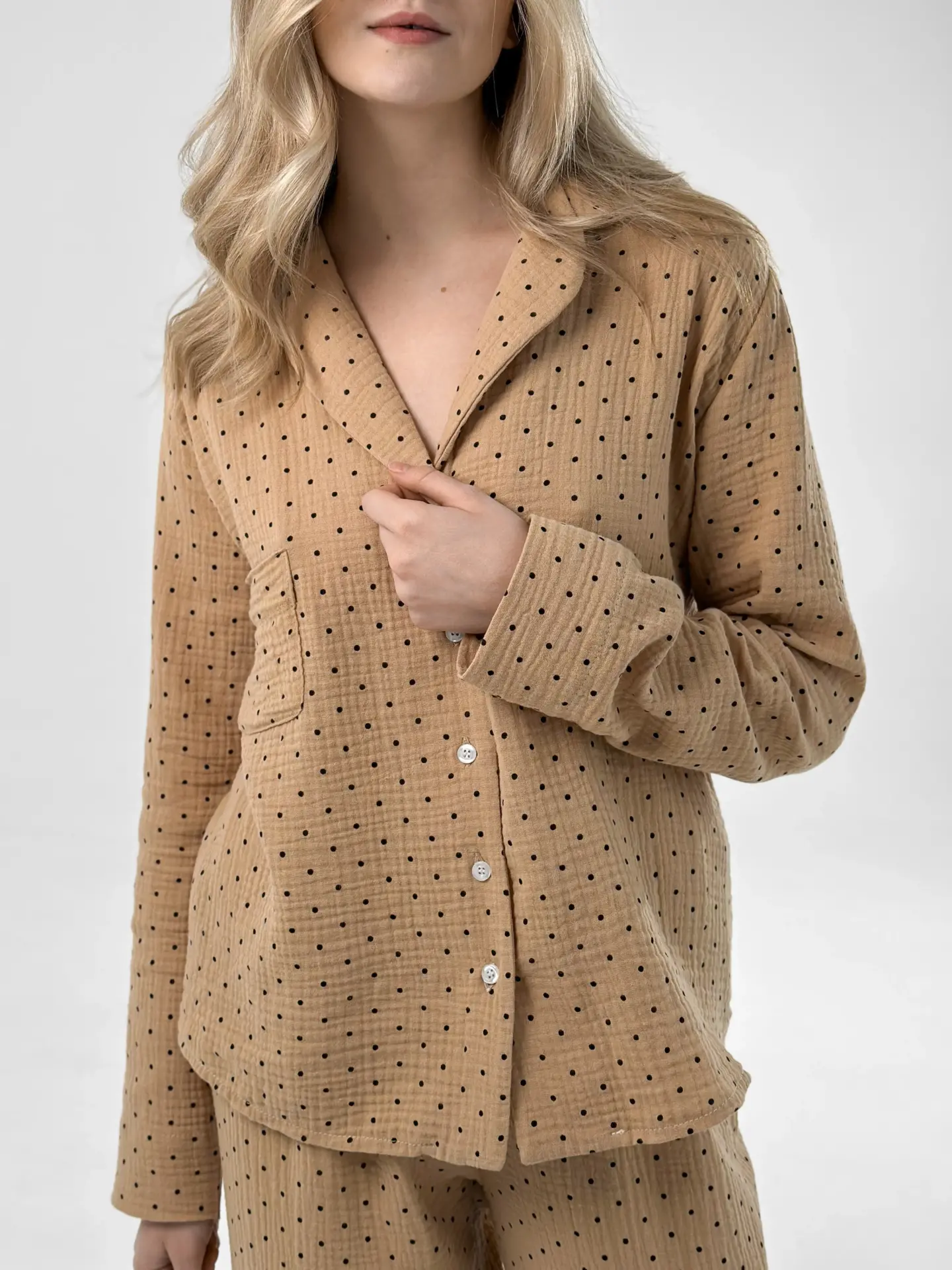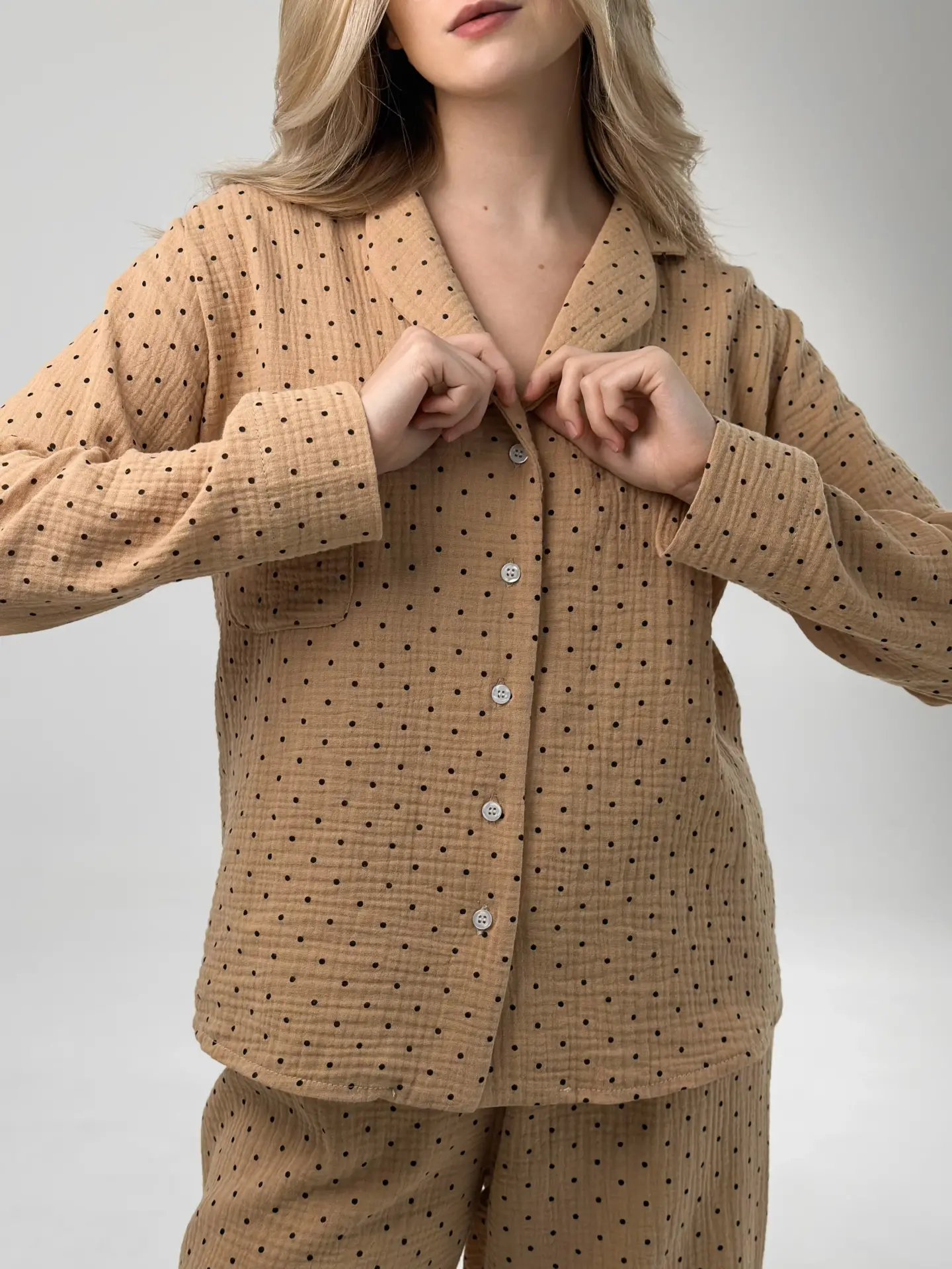 Komplet piżamowy koszula i spodnie, z muślinu, brązowy w groszki