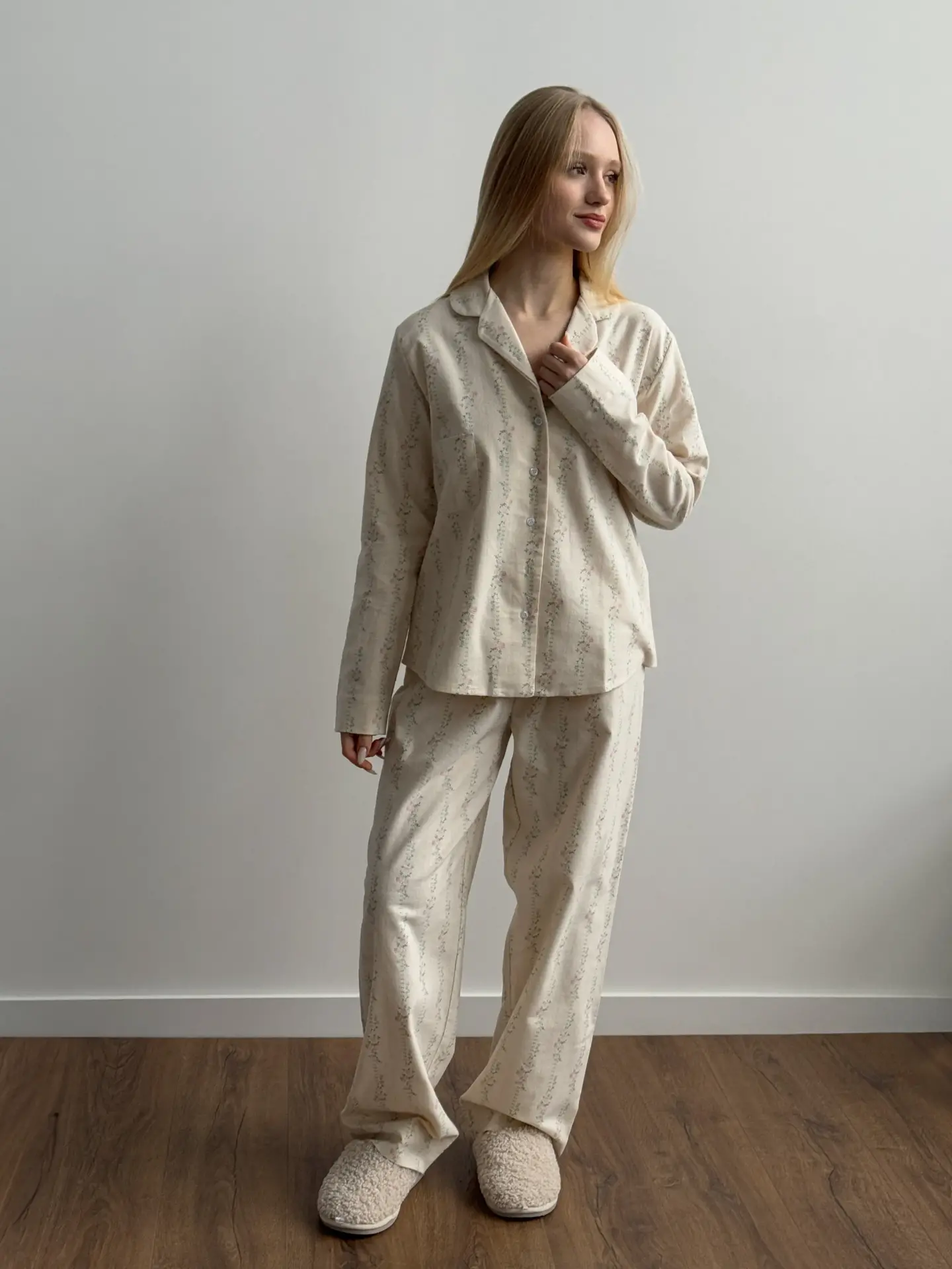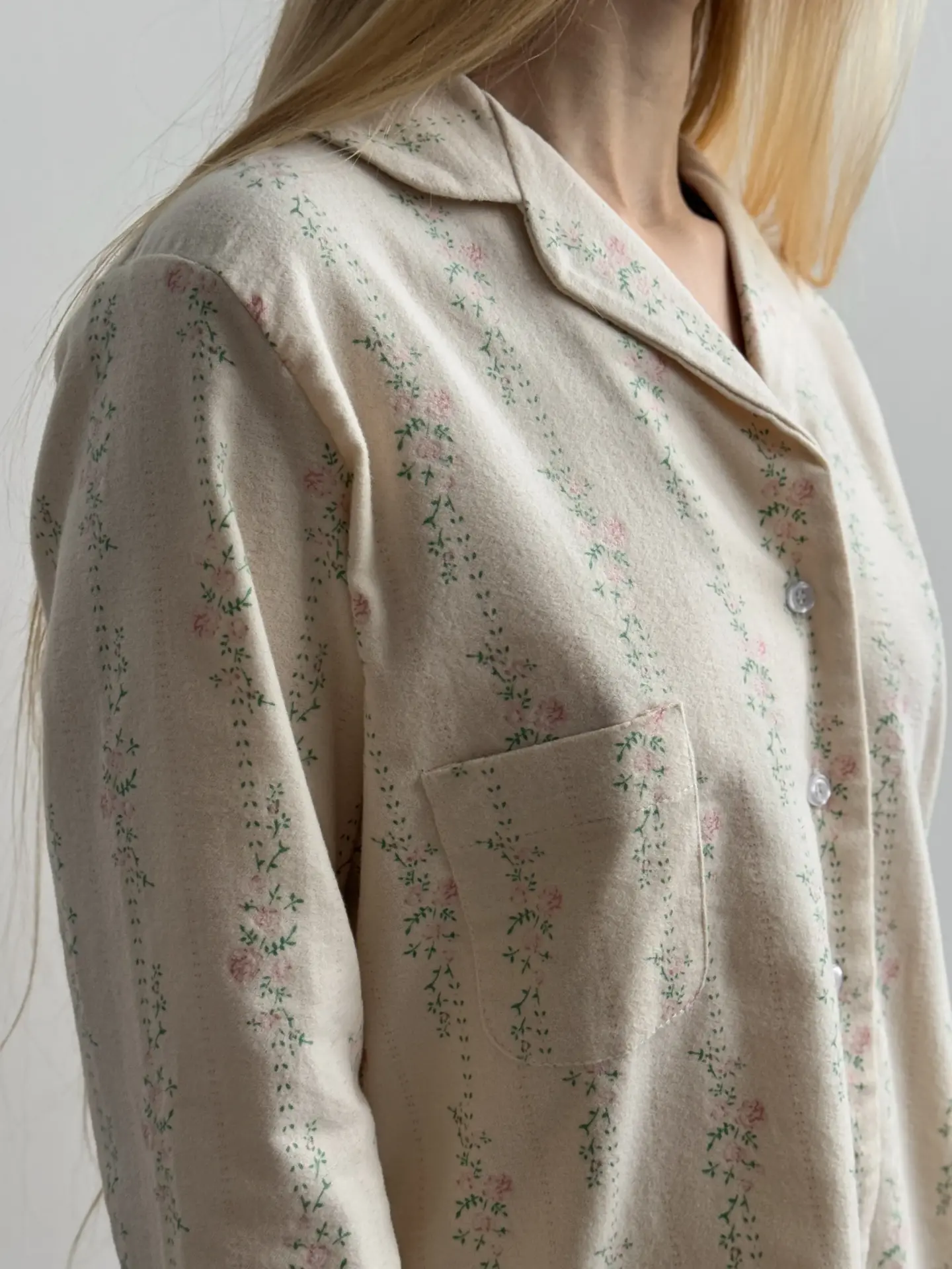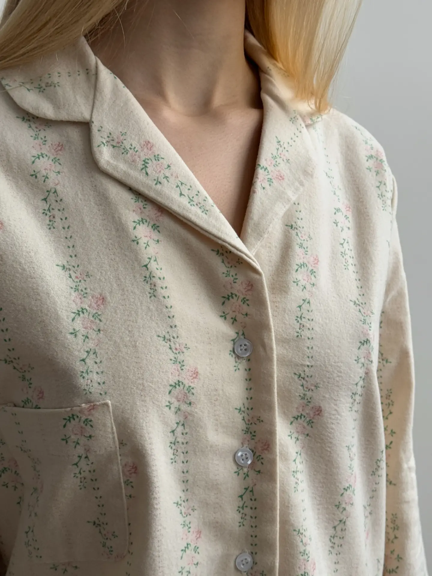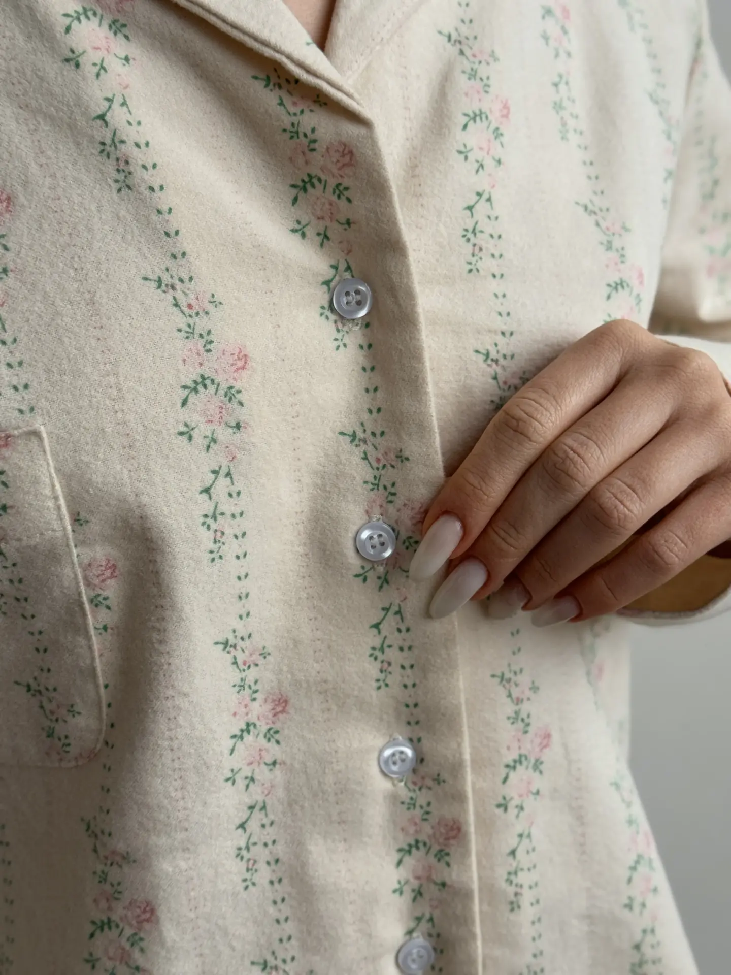 Komplet piżamowy koszula i spodnie, z flaneli, kremowy w kwiatki
