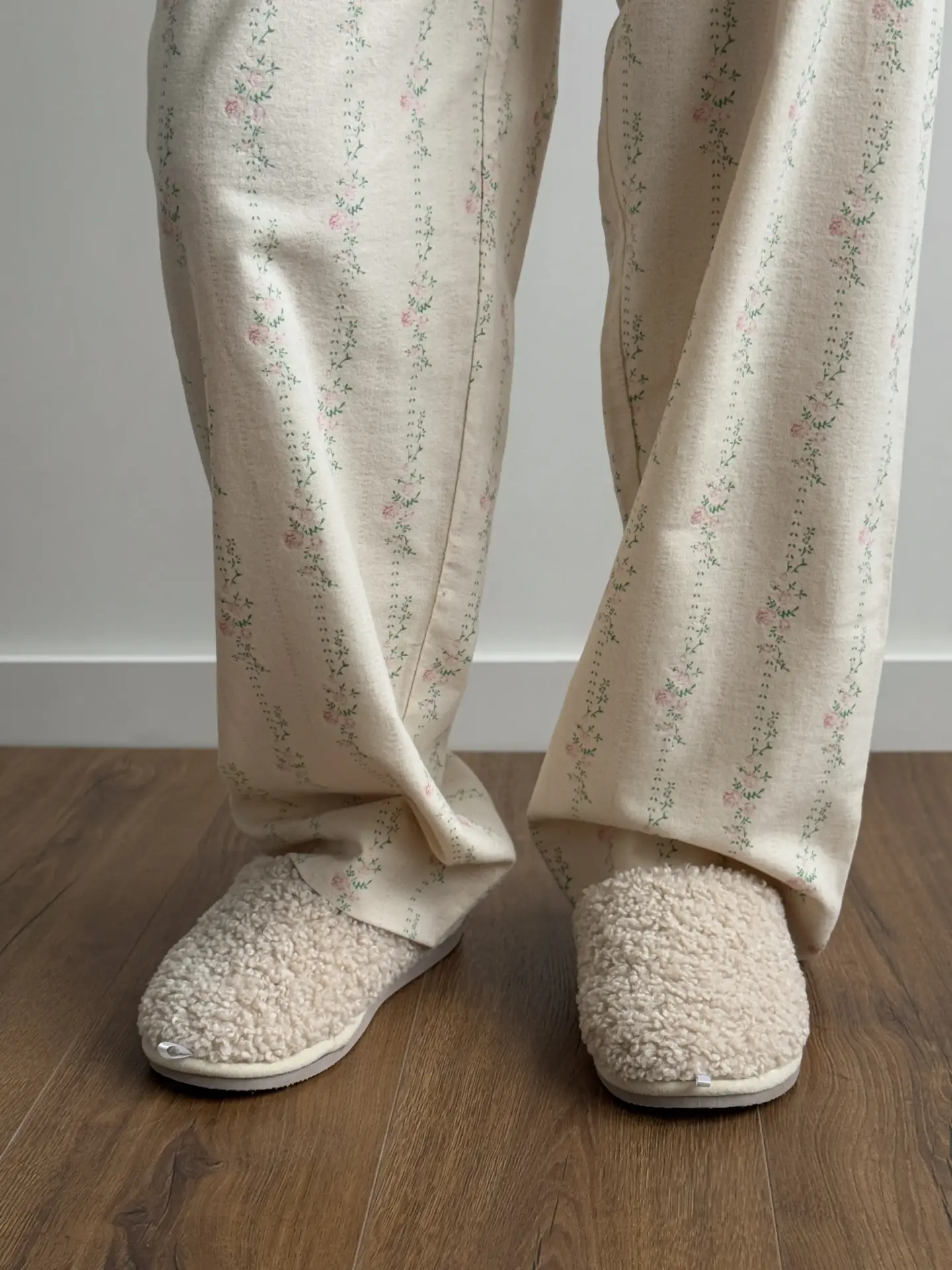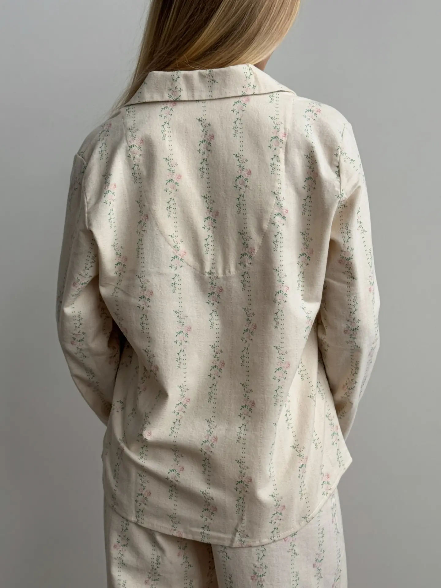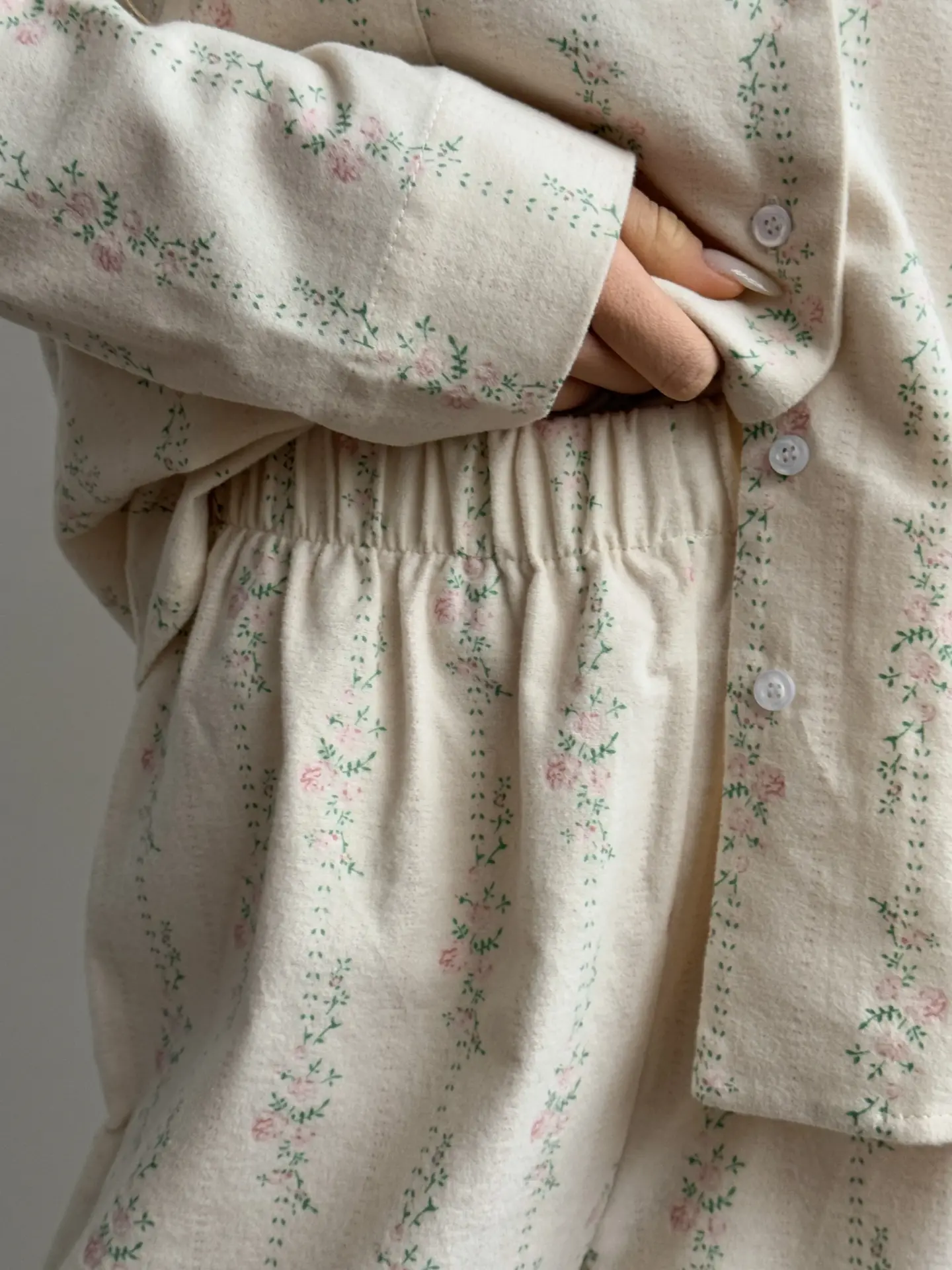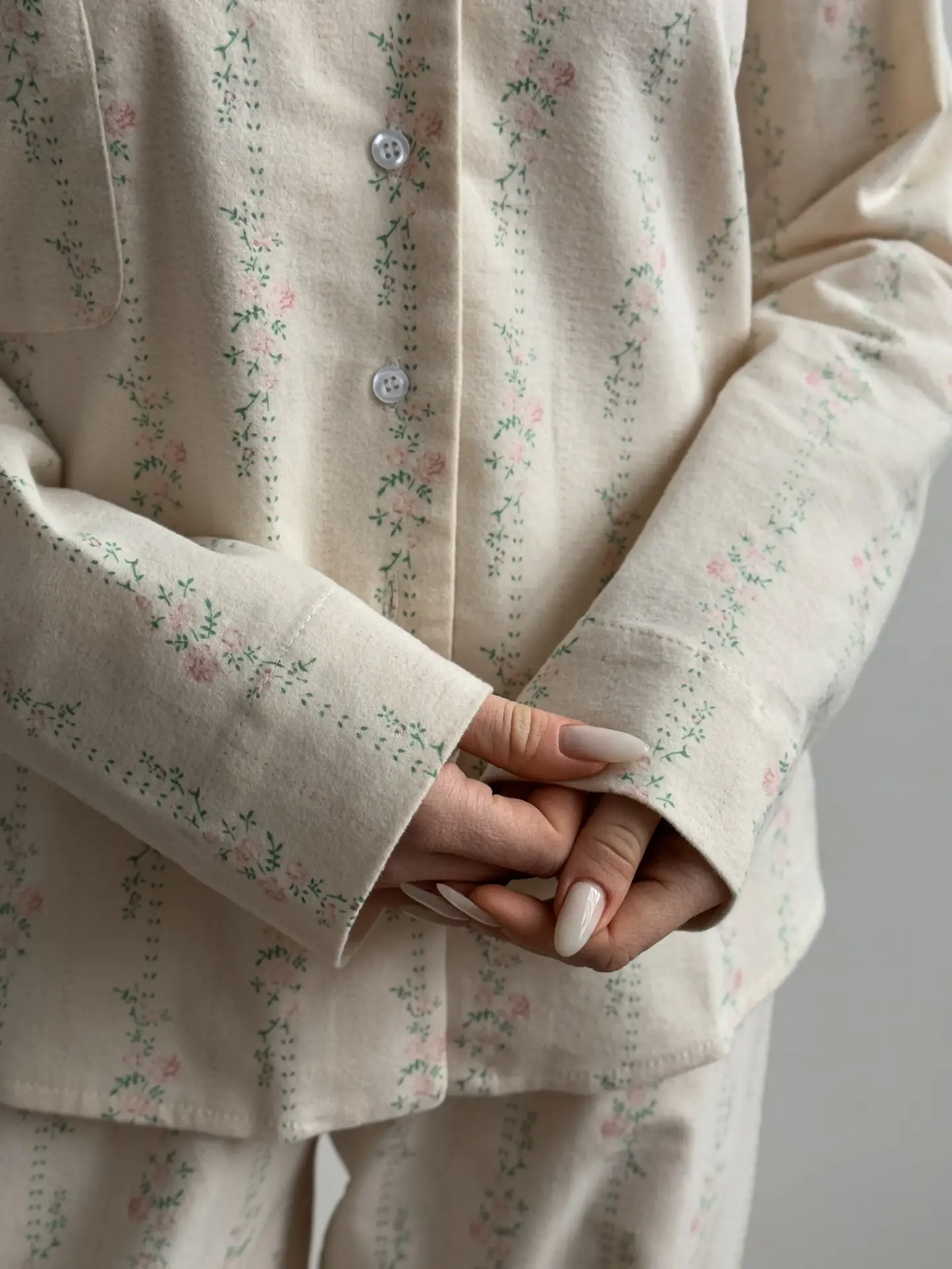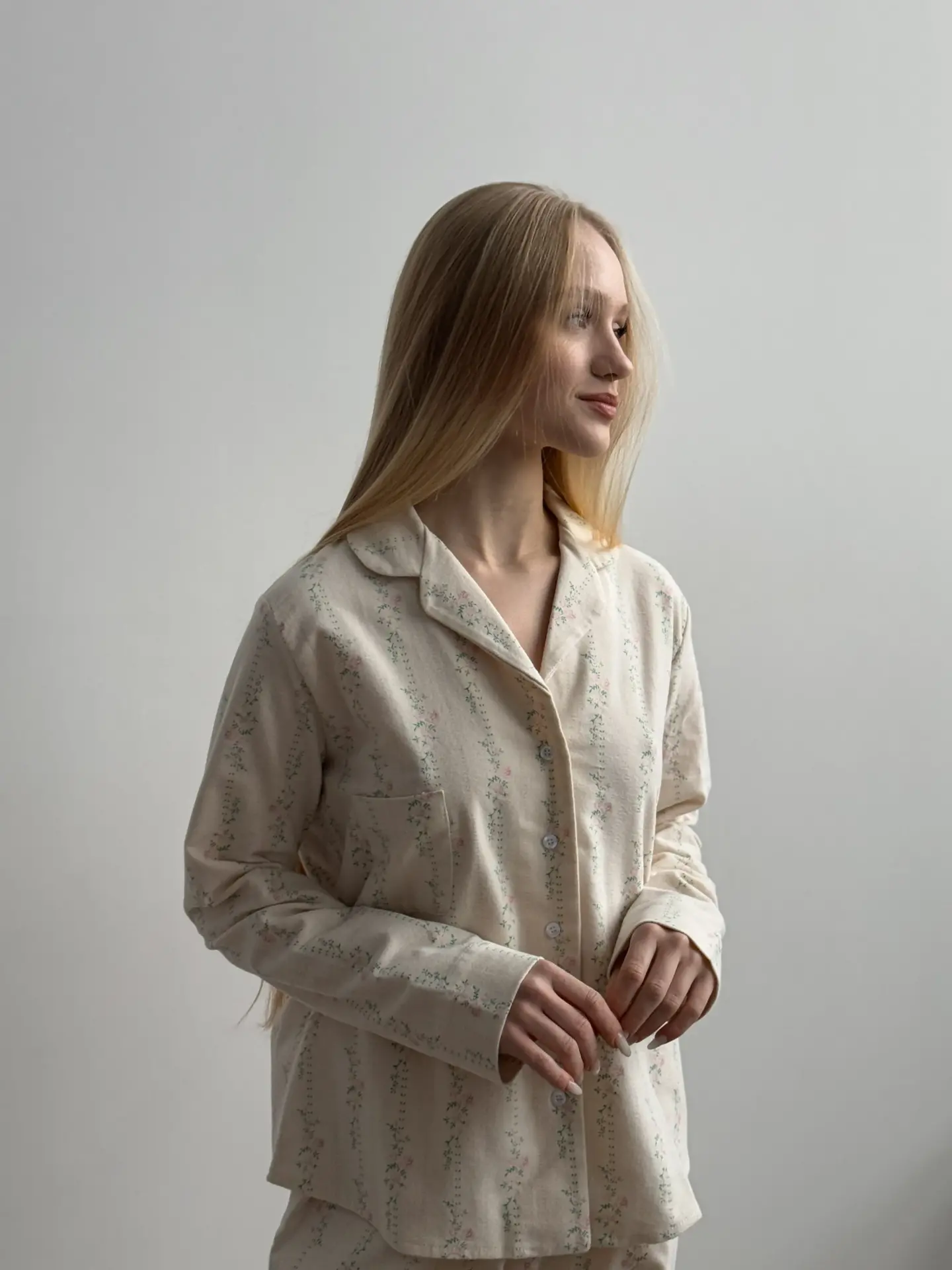 Komplet piżamowy koszula i spodnie, z flaneli, kremowy w kwiatki