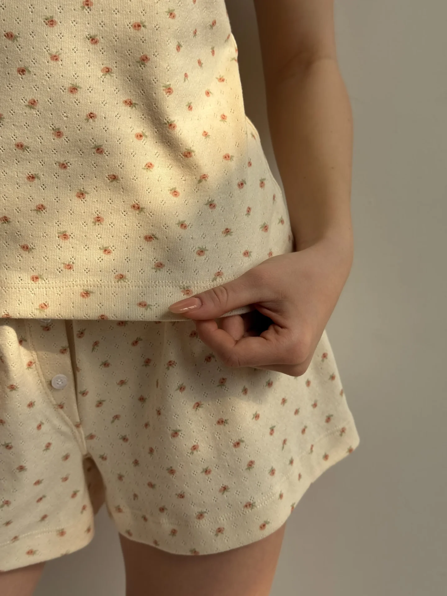 Koszulka bez rękawów z ribany, kremowa w różę