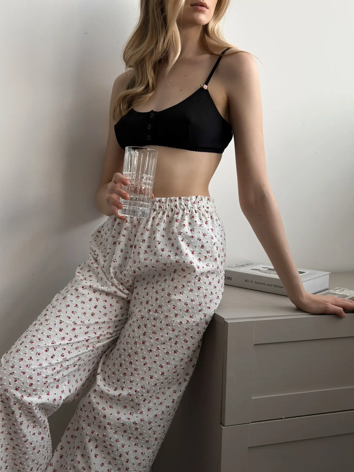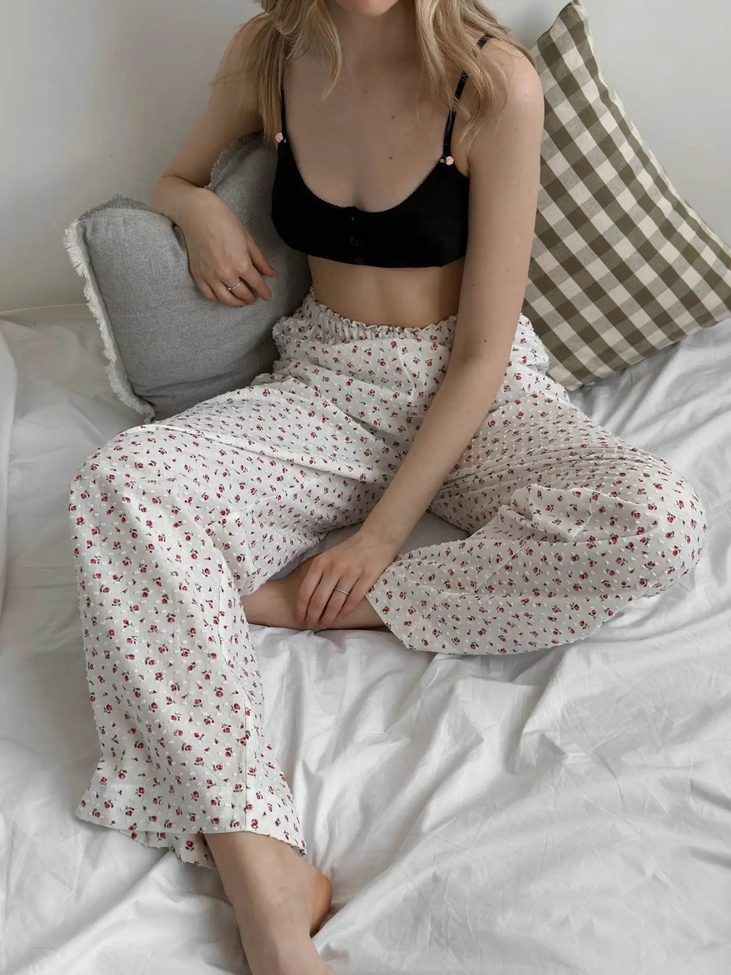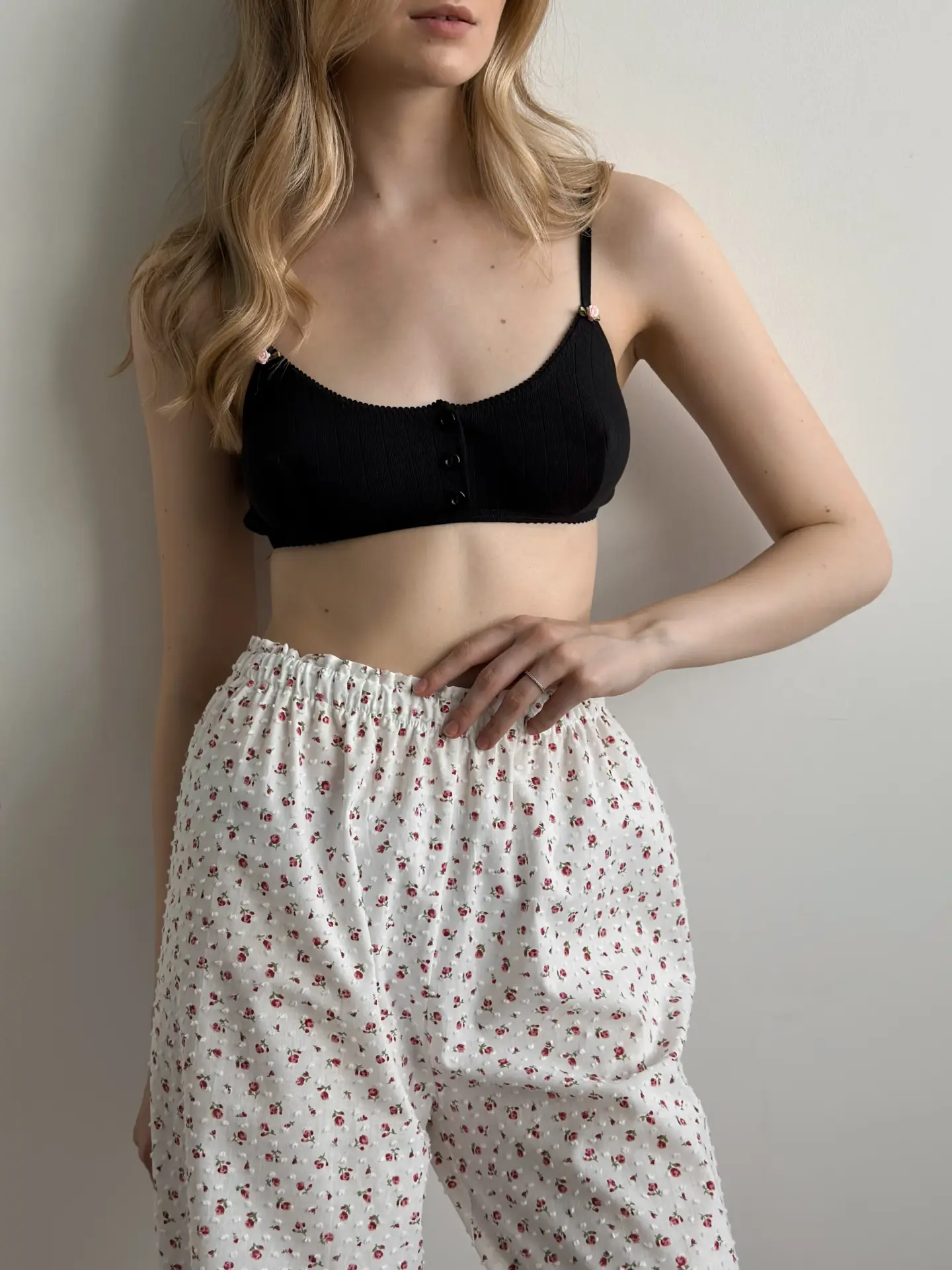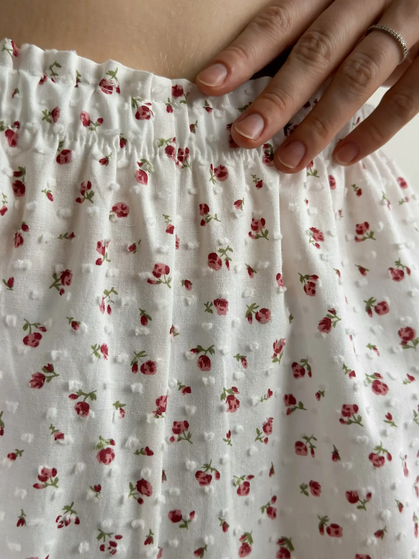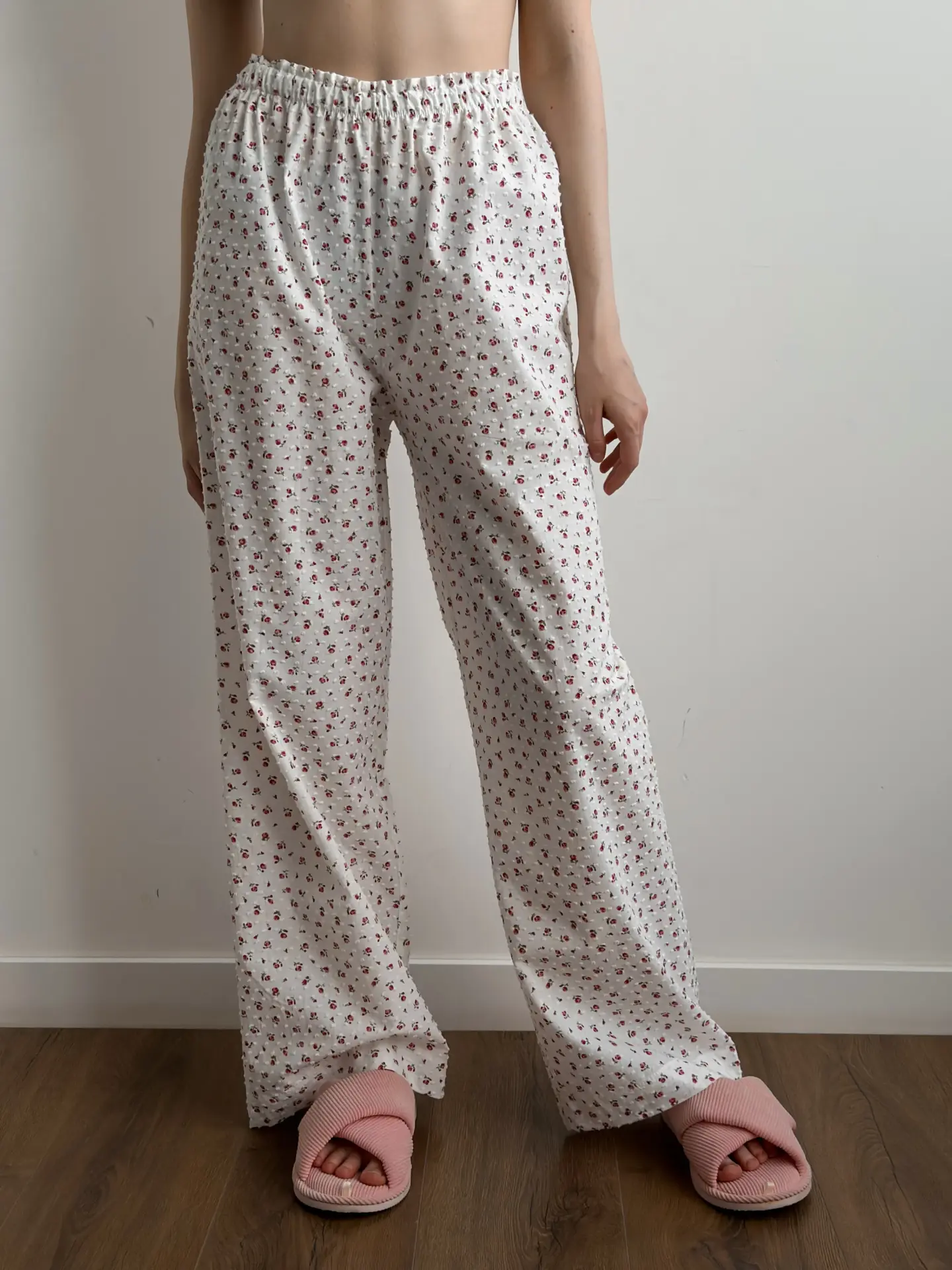 Spodnie Mono z batystu, białe w kropki i czerwone róże