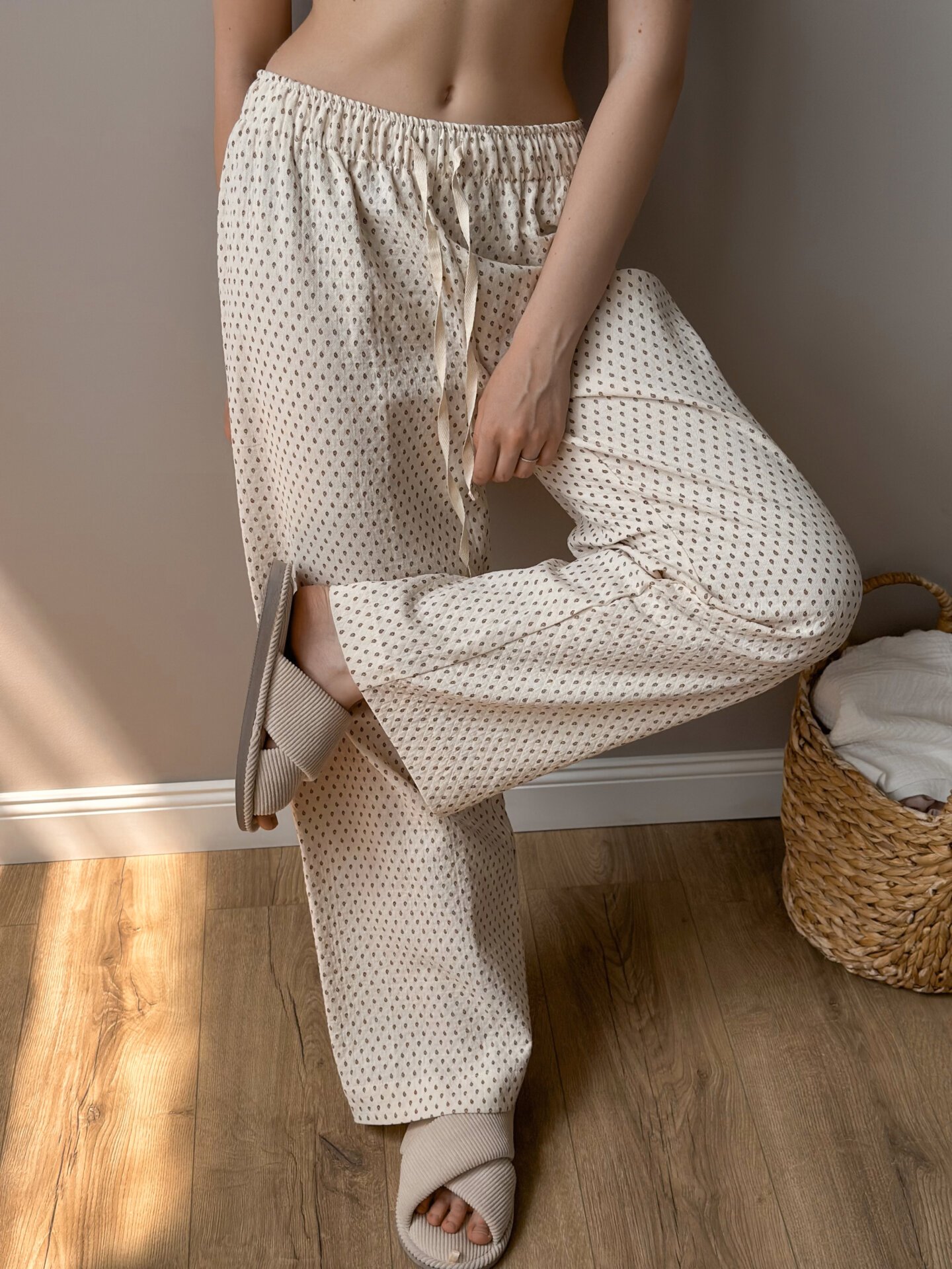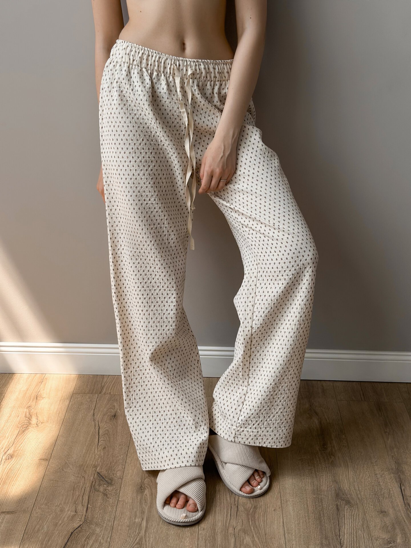 Spodnie Mono z letniej pikowanej bawełny łączą lekkość z nowoczesnym minimalizmem. Cienka bawełniana tkanina o pikowanej strukturze miękko układa się na sylwetce i pozwala skórze oddychać. Luźny krój zapewnia komfort ruchu, a minimalistyczny fason łatwo zestawić z podstawową lub wyrazistą górą. Idealne do miejskich stylizacji i wypoczynku w gorące dni.