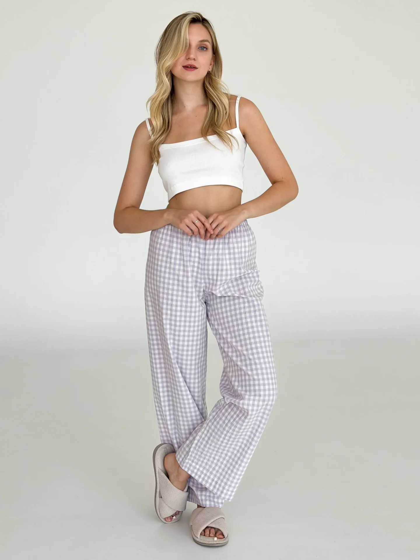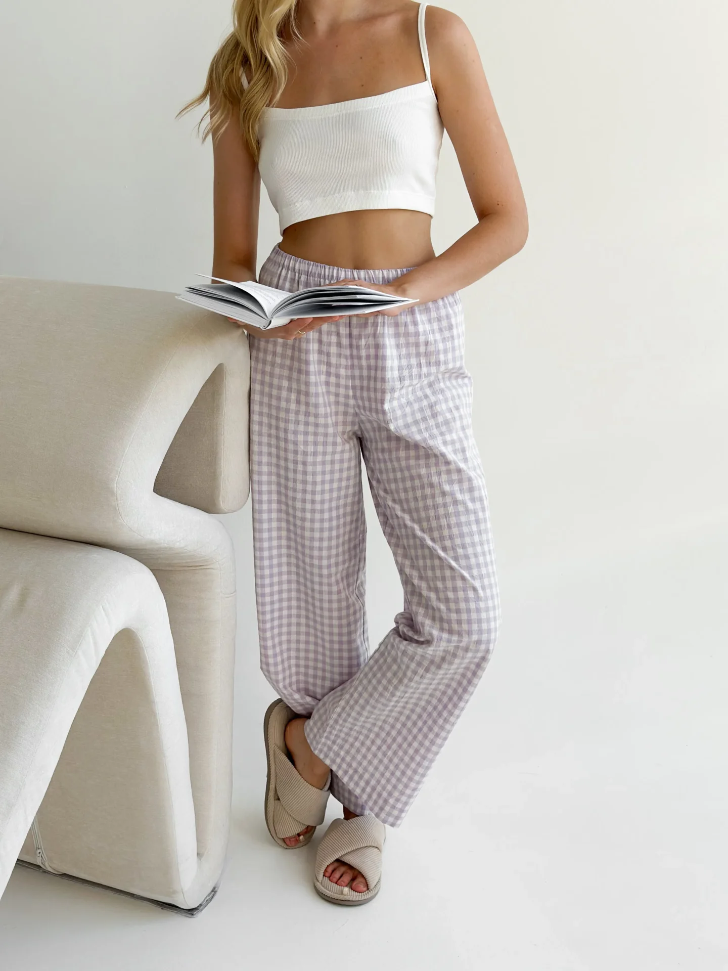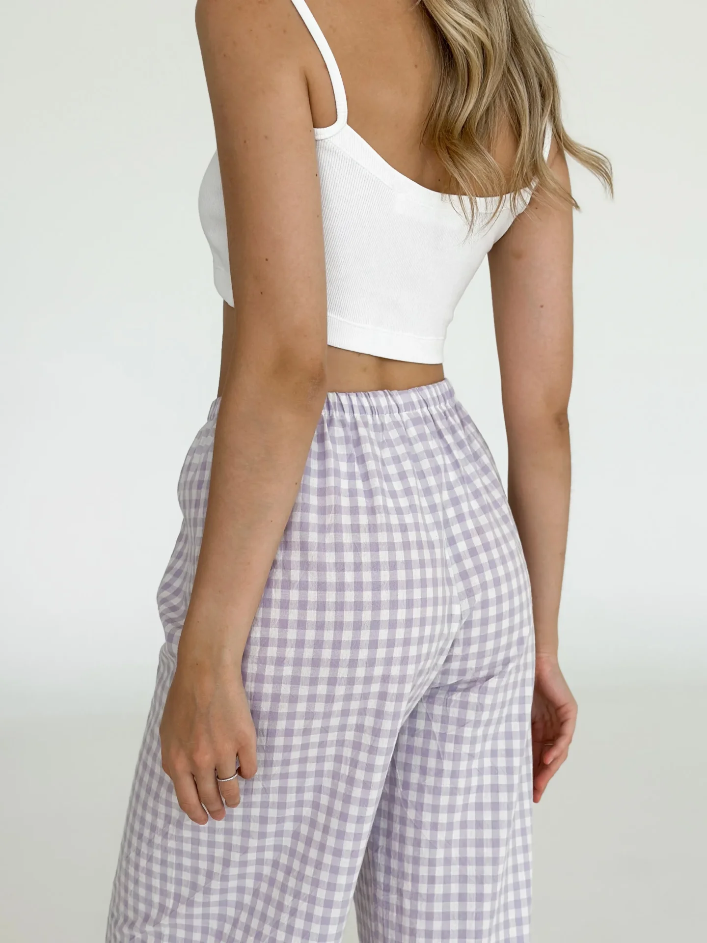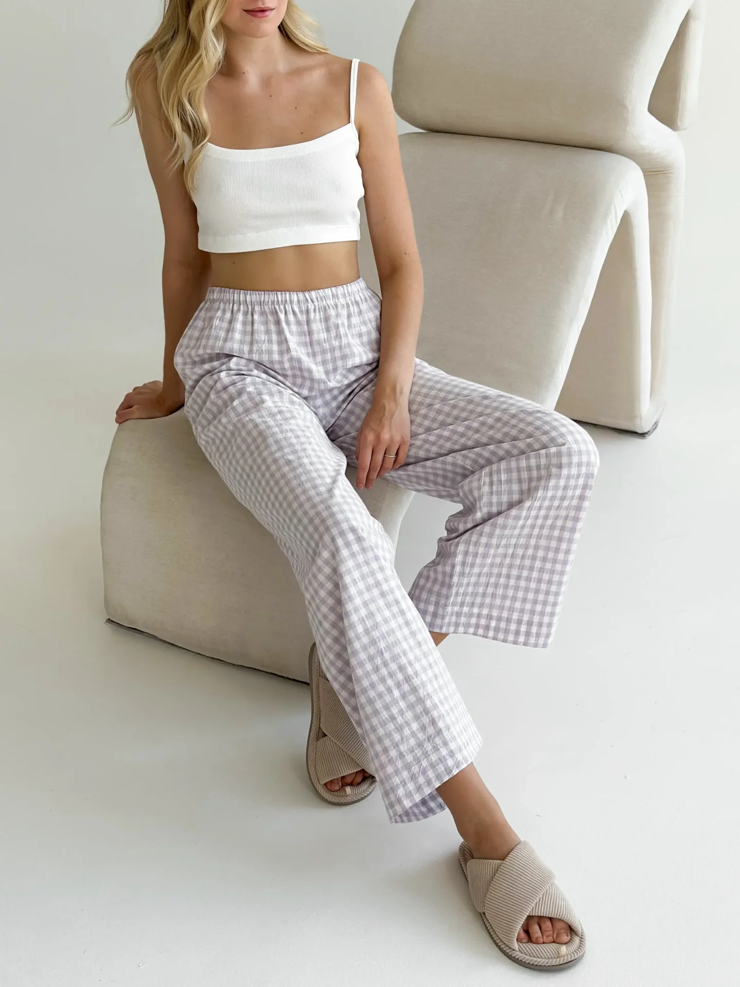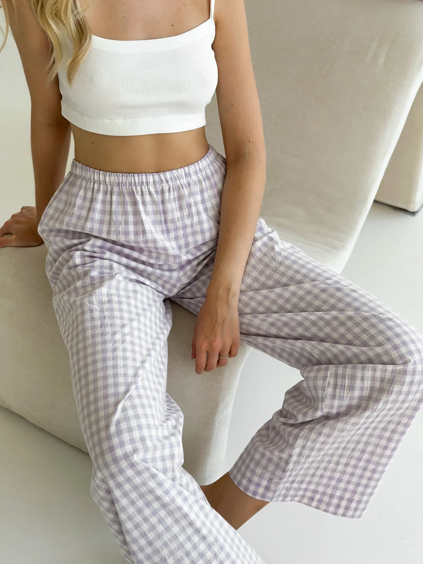 Spodnie Mono z bawełny pranej, mleczne w fioletową kratkę