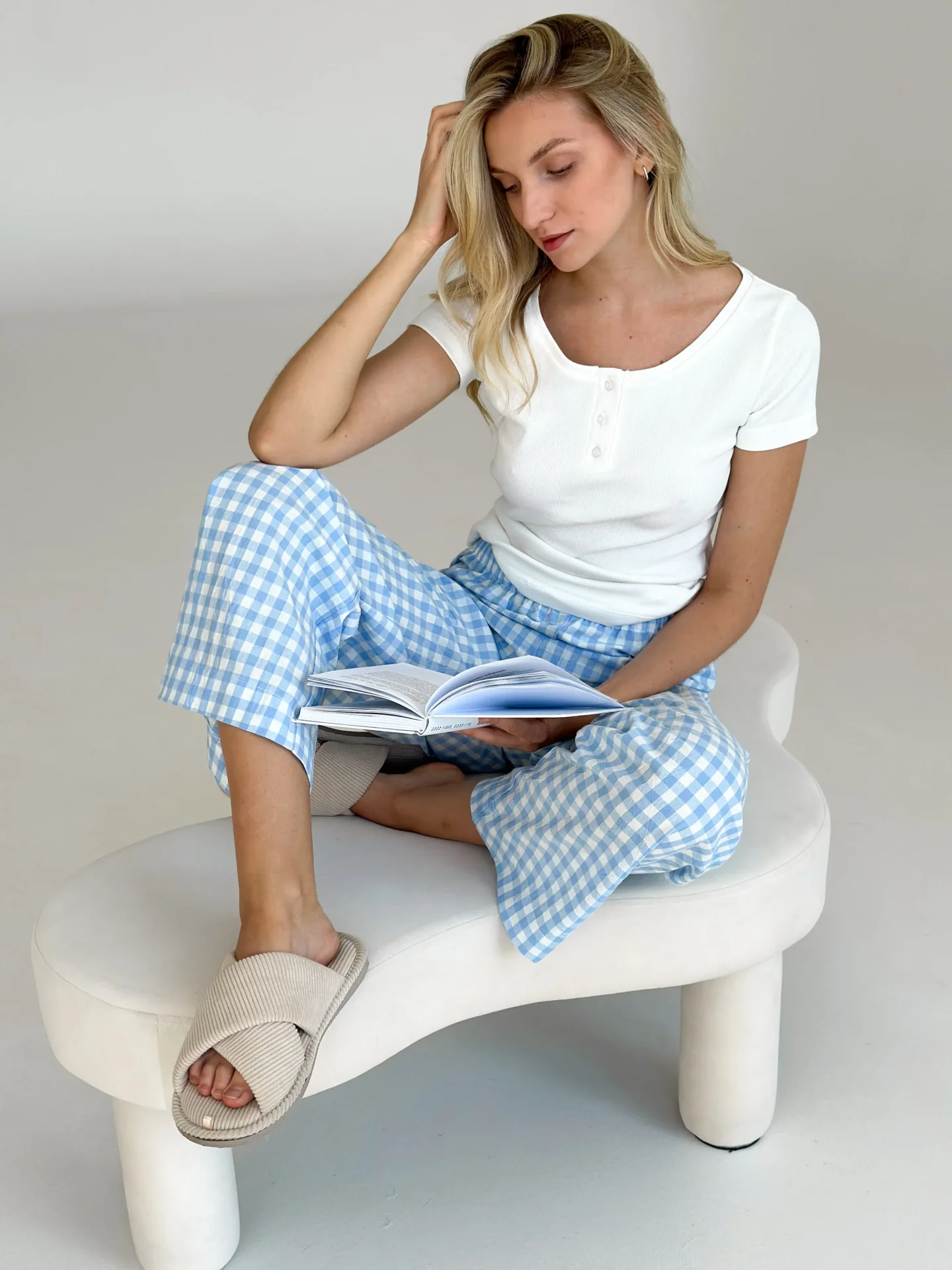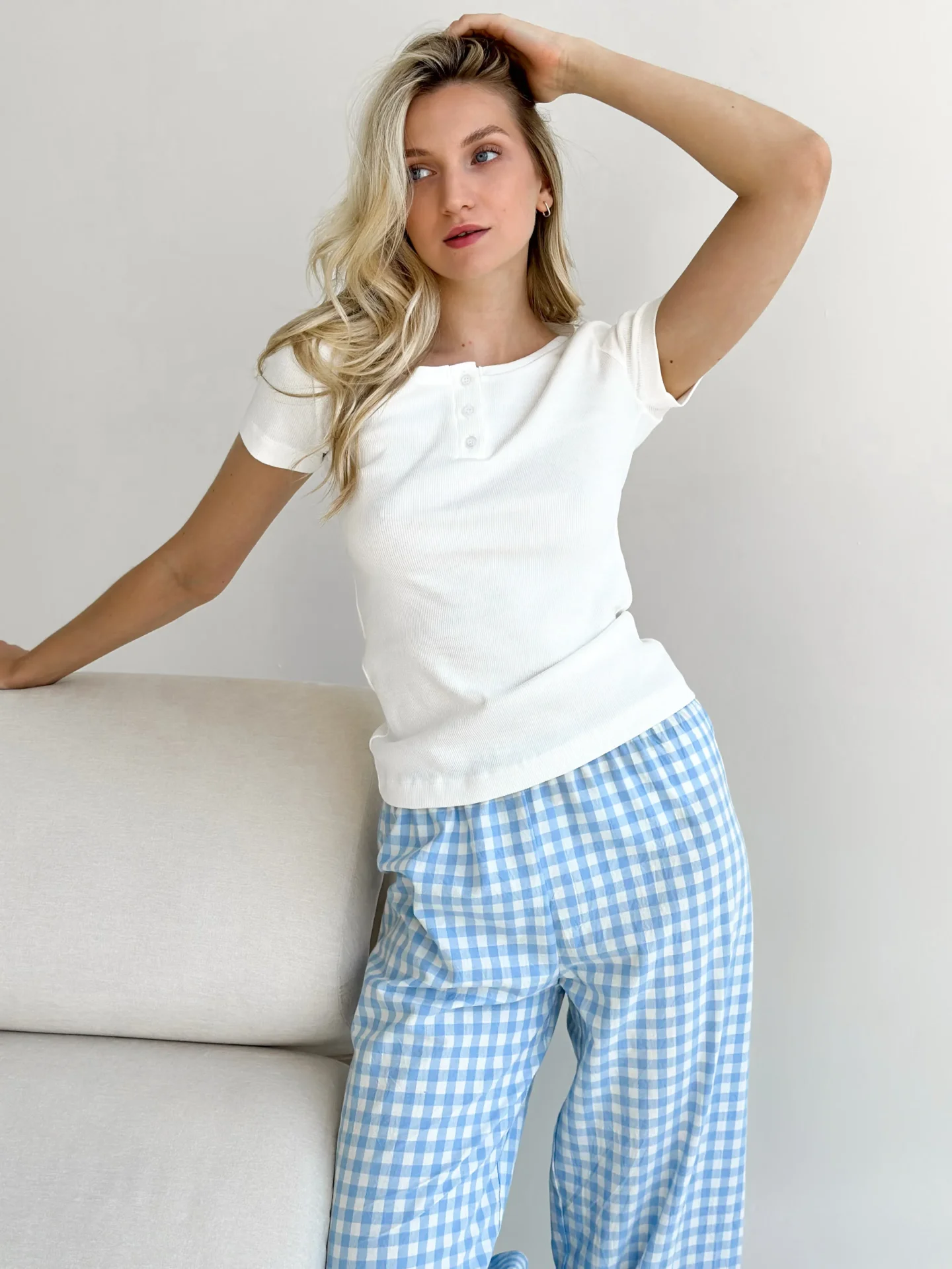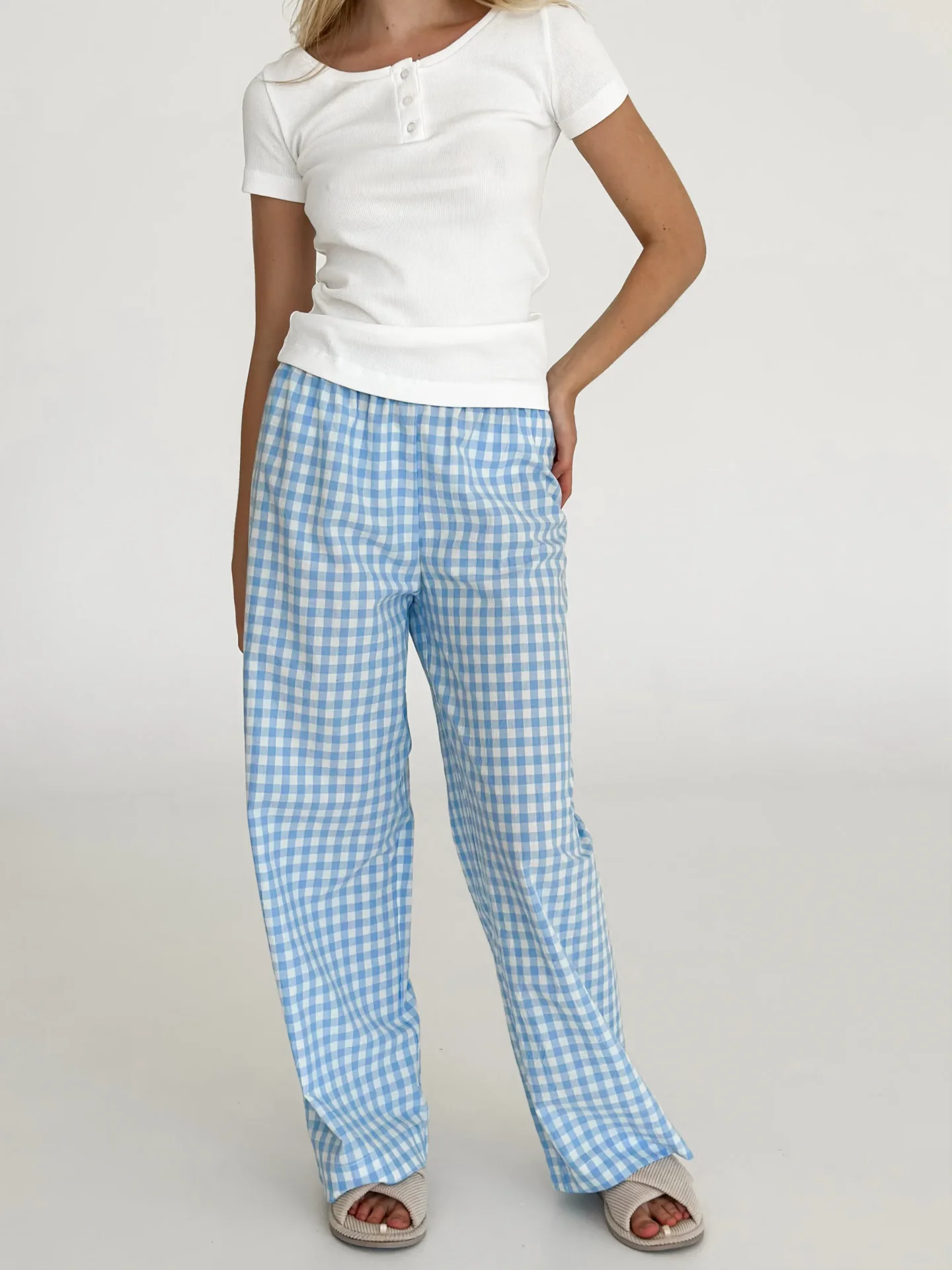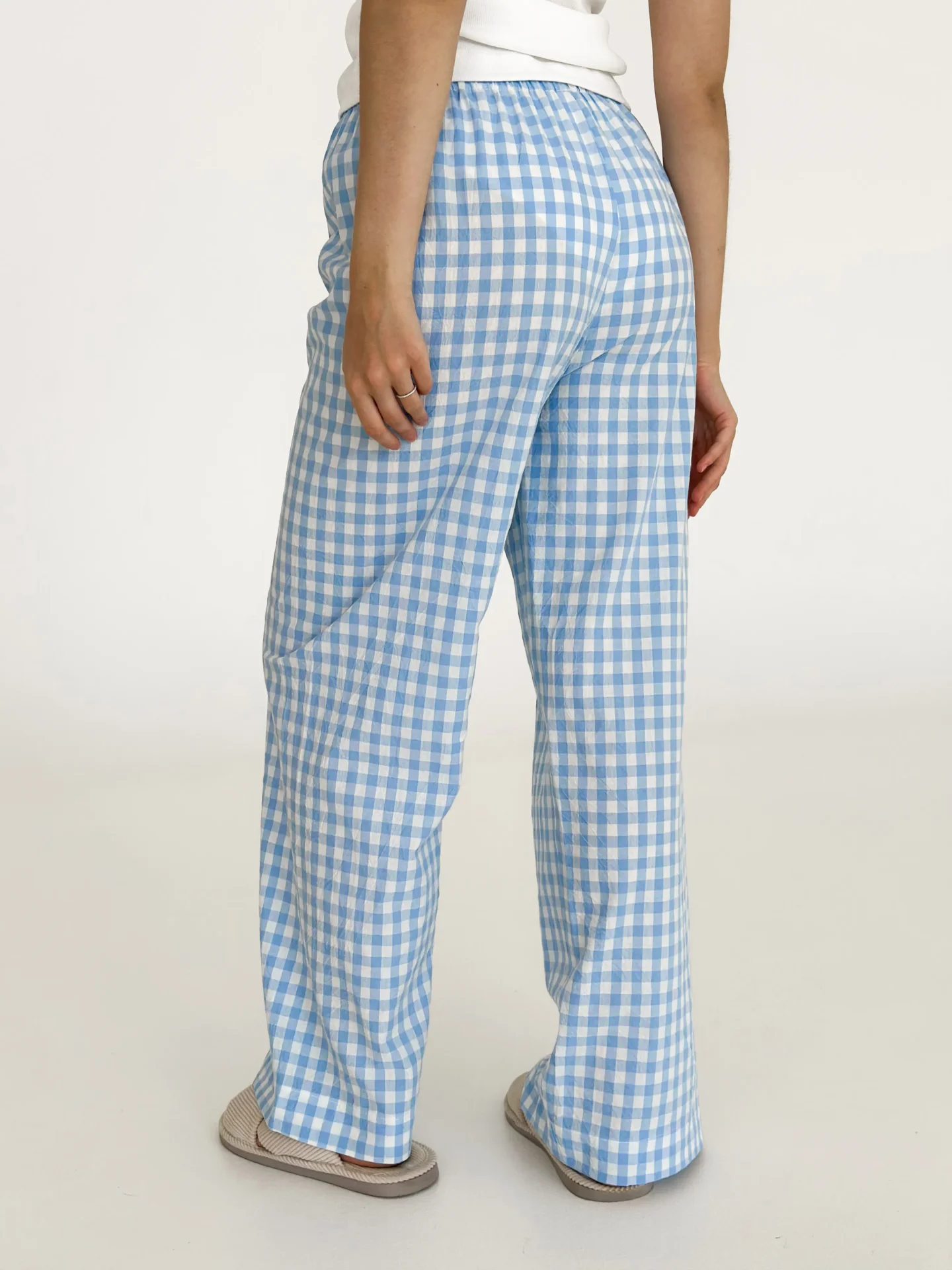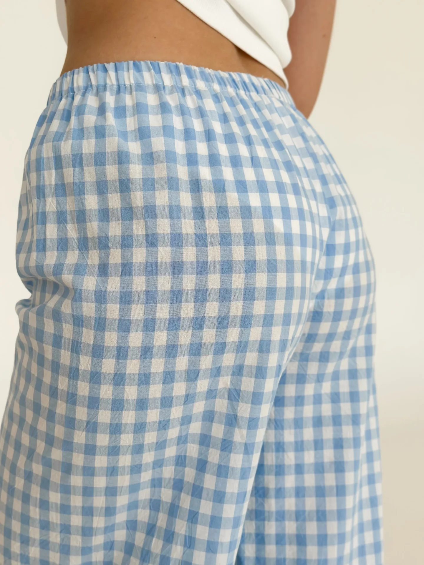 Spodnie Mono z bawełny pranej, mleczne w niebieską kratkę