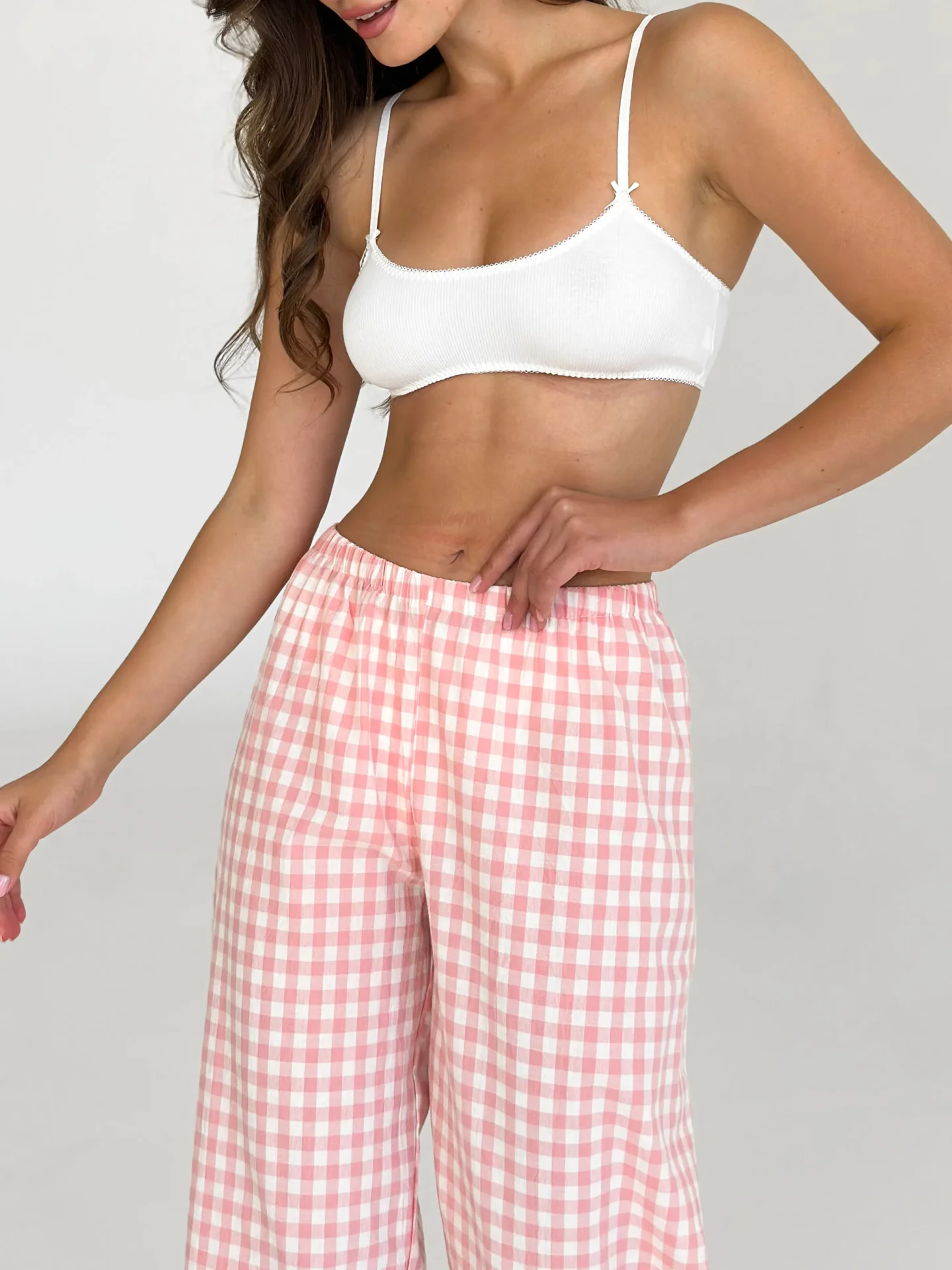 Spodnie Mono z bawełny pranej, mleczne w różową kratkę