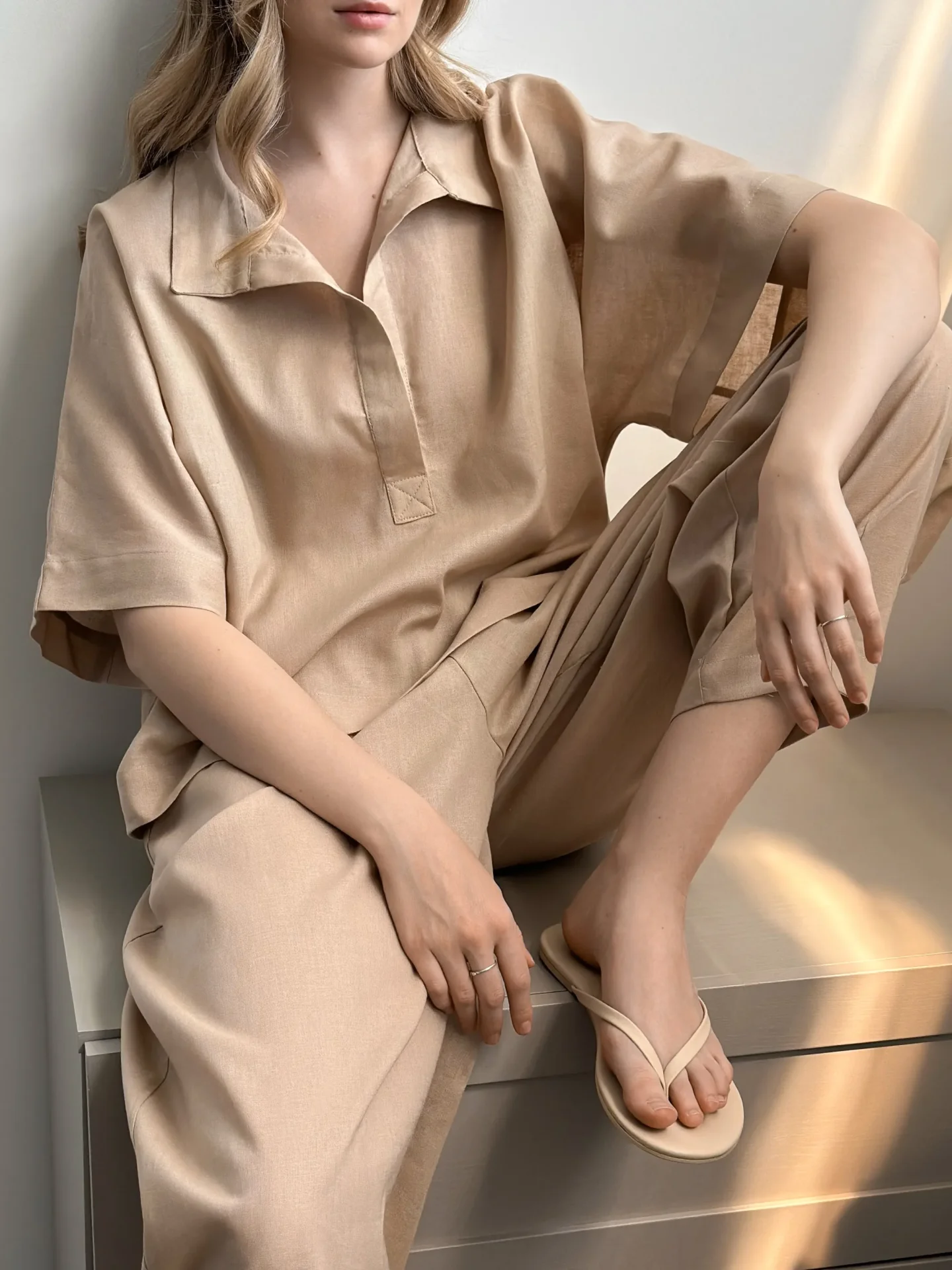 Spodnie Muki z naturalnego lnu mają luźny krój i lekką strukturę, co zapewnia komfort w ciepłe dni. Len jest przyjemny w dotyku, dobrze oddycha i nadaje stylizacji naturalnej prostoty. Dzięki minimalistycznemu designowi spodnie łatwo łączyć z różnymi wariantami góry i są idealne do codziennych stylizacji, spacerów i odpoczynku.