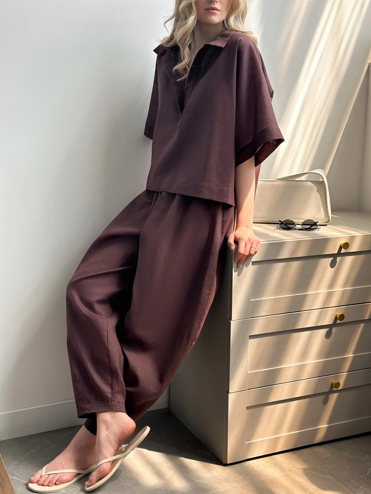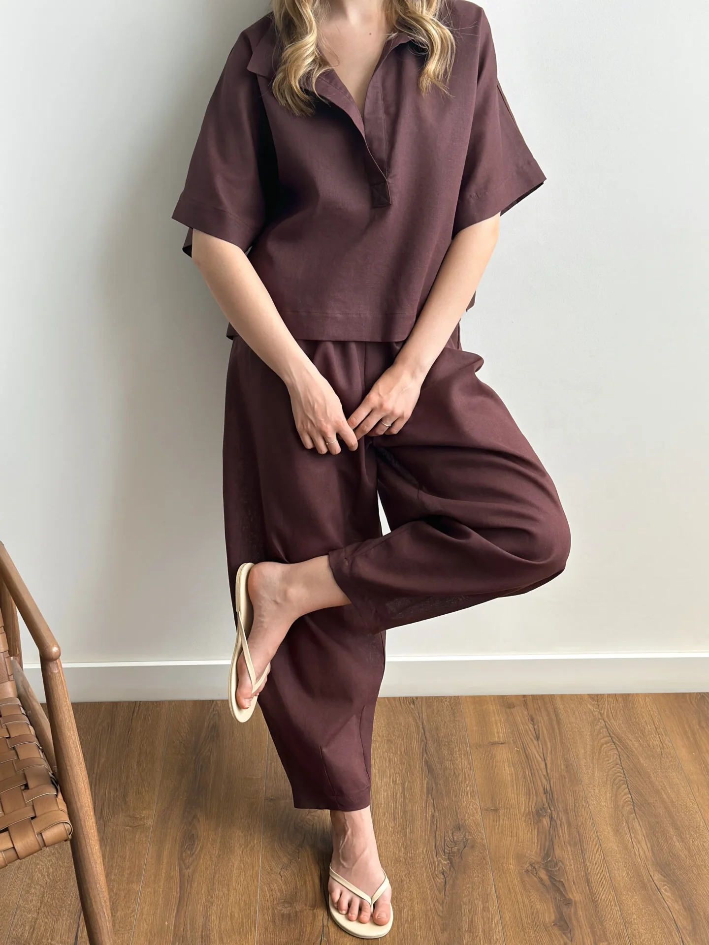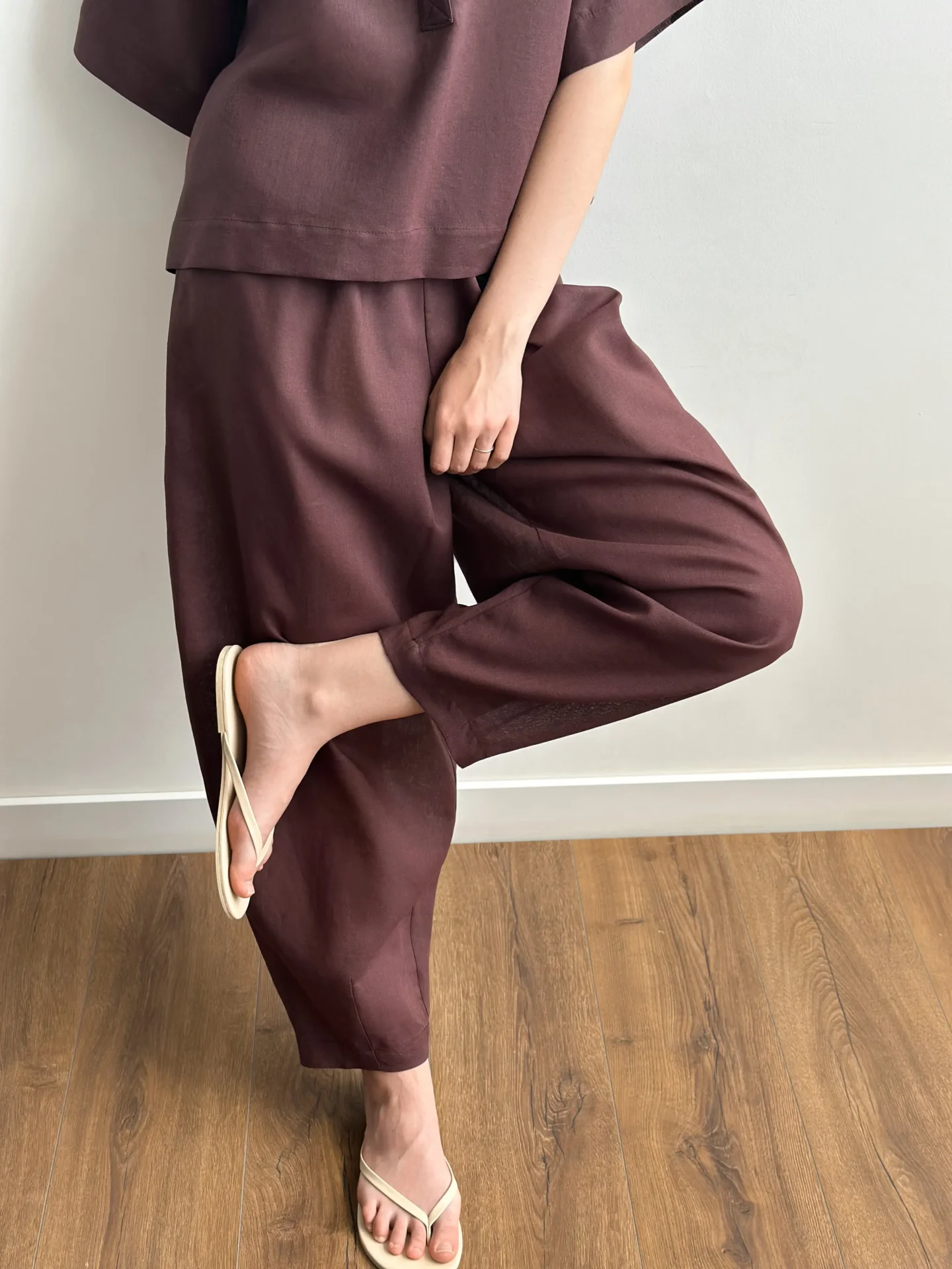 Spodnie Muki z naturalnego lnu mają luźny krój i lekką strukturę, co zapewnia komfort w ciepłe dni. Len jest przyjemny w dotyku, dobrze oddycha i nadaje stylizacji naturalnej prostoty. Dzięki minimalistycznemu designowi spodnie łatwo łączyć z różnymi wariantami góry i są idealne do codziennych stylizacji, spacerów i odpoczynku.