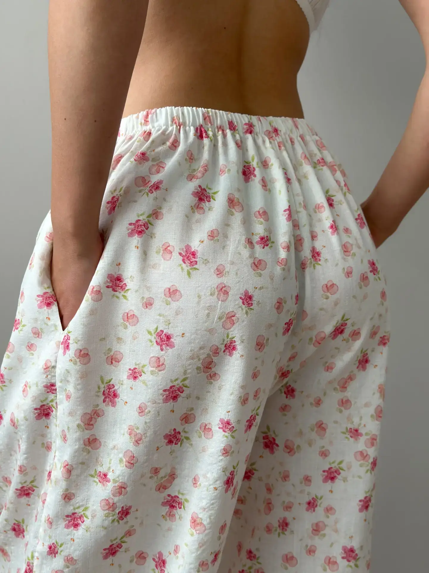 Spodnie szarawary z batystu, białe w akwarelowe wzory