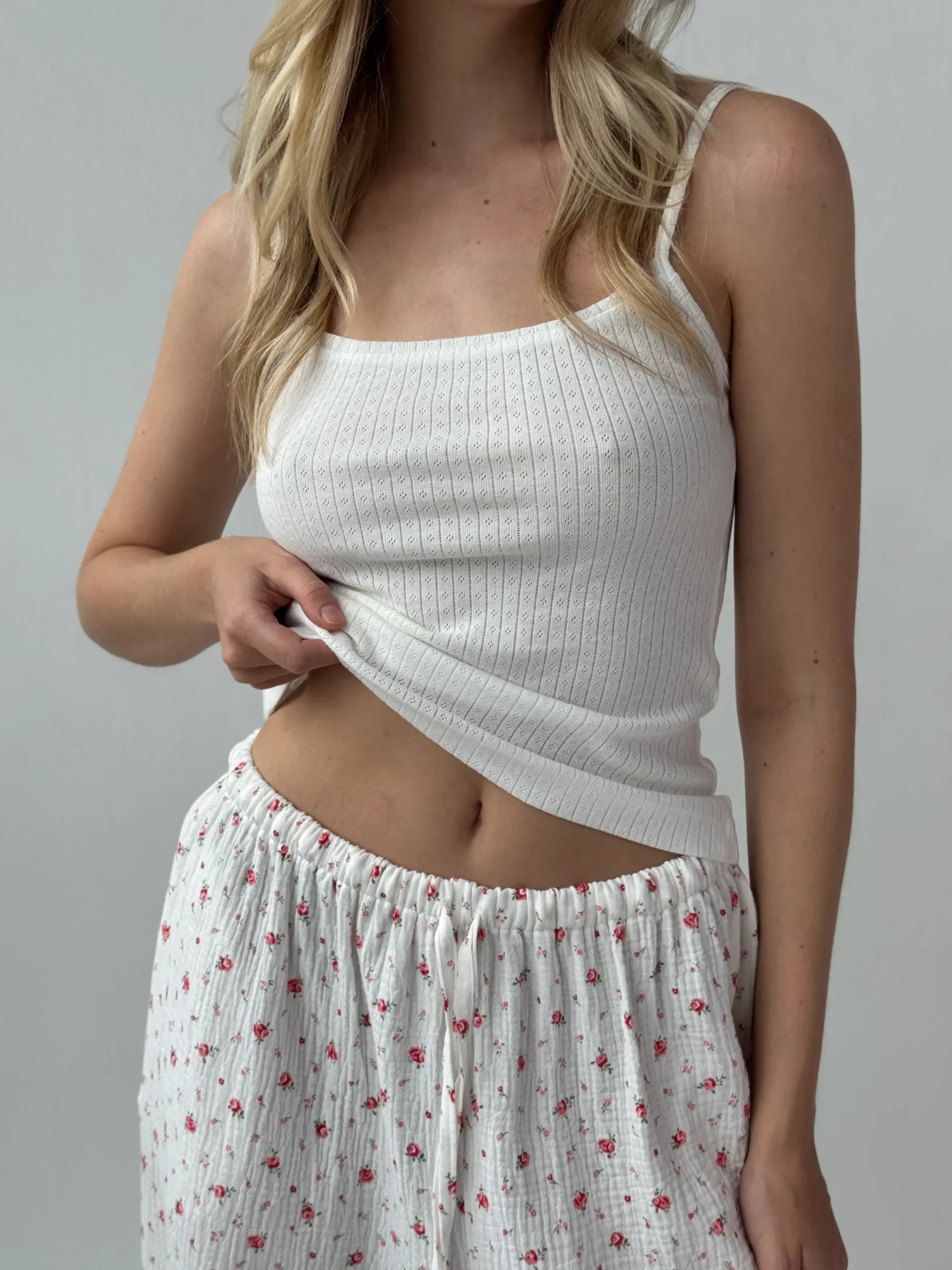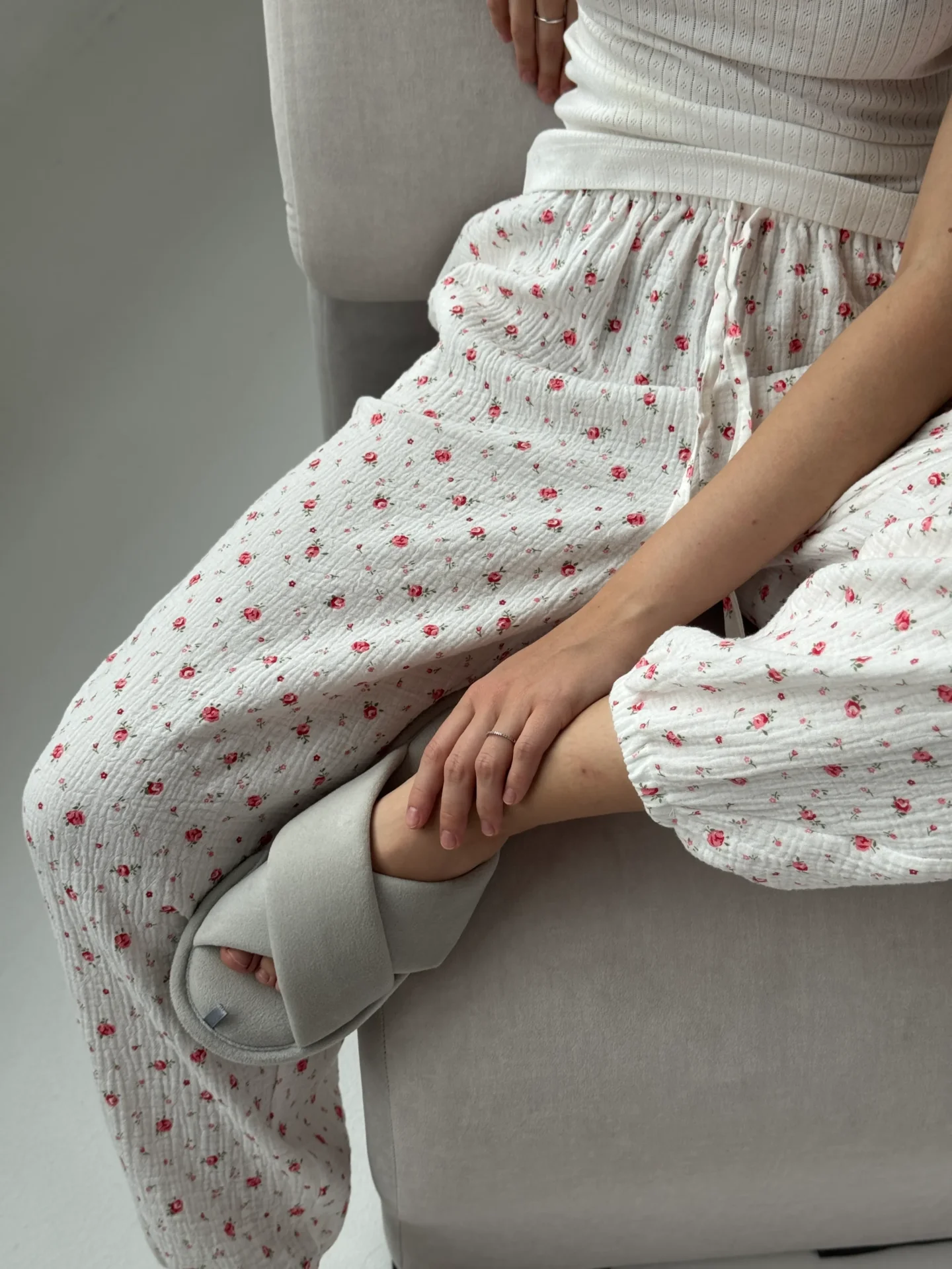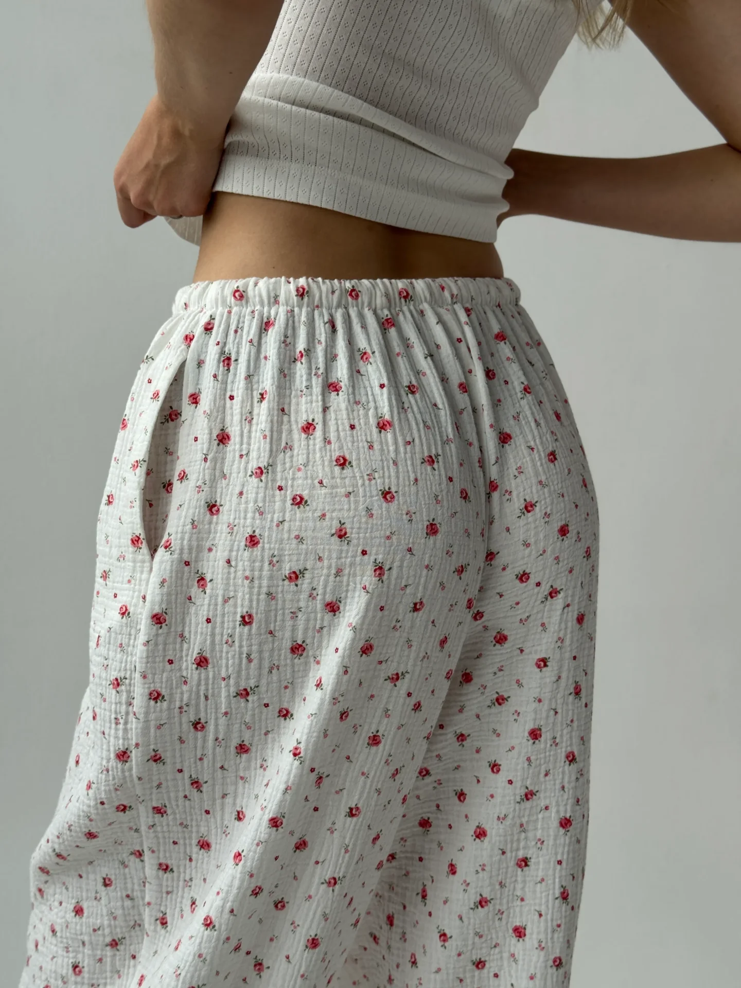 Spodnie szarawary z muślinu dwuwarstwowego, białe w kwiatki