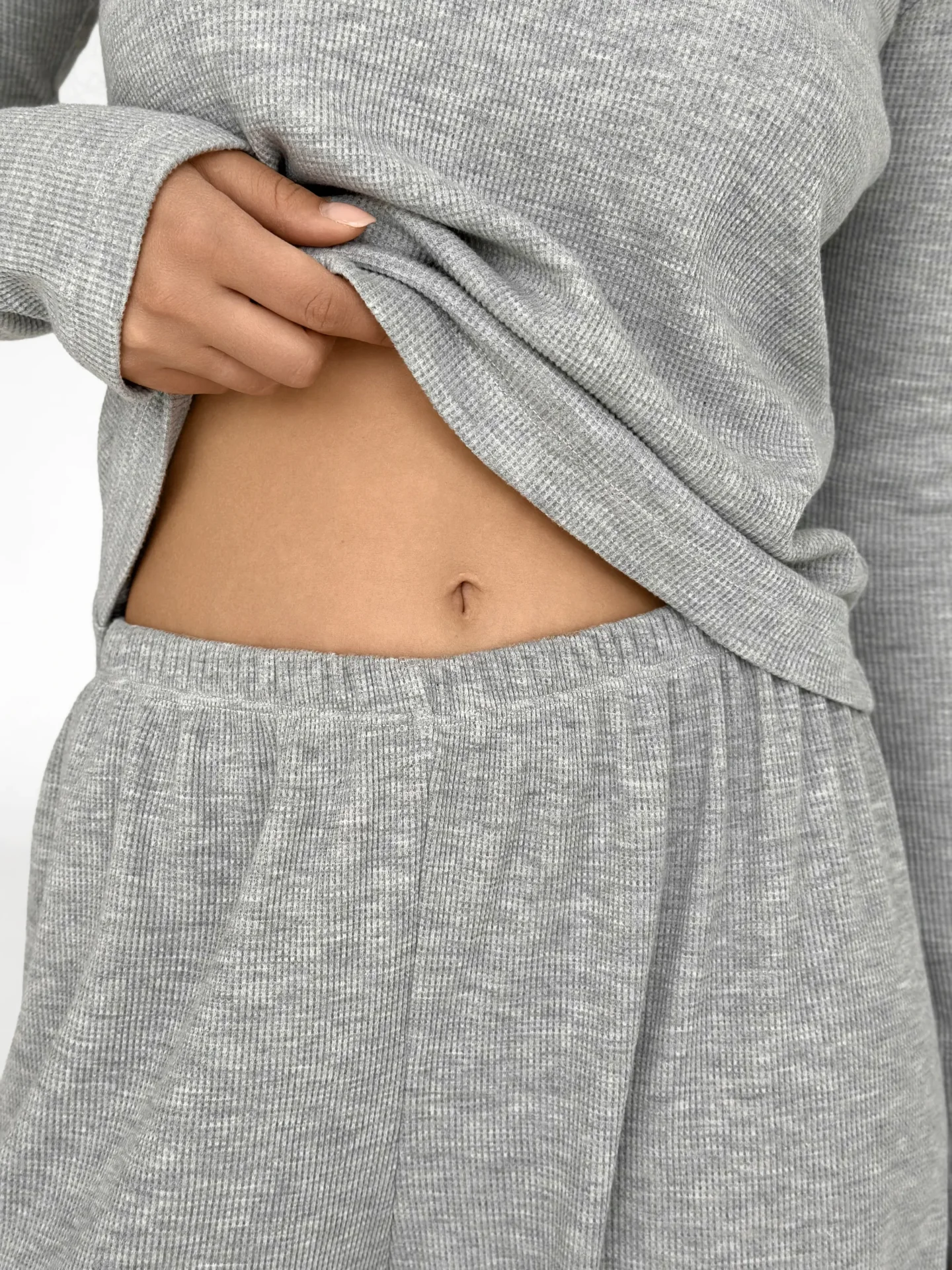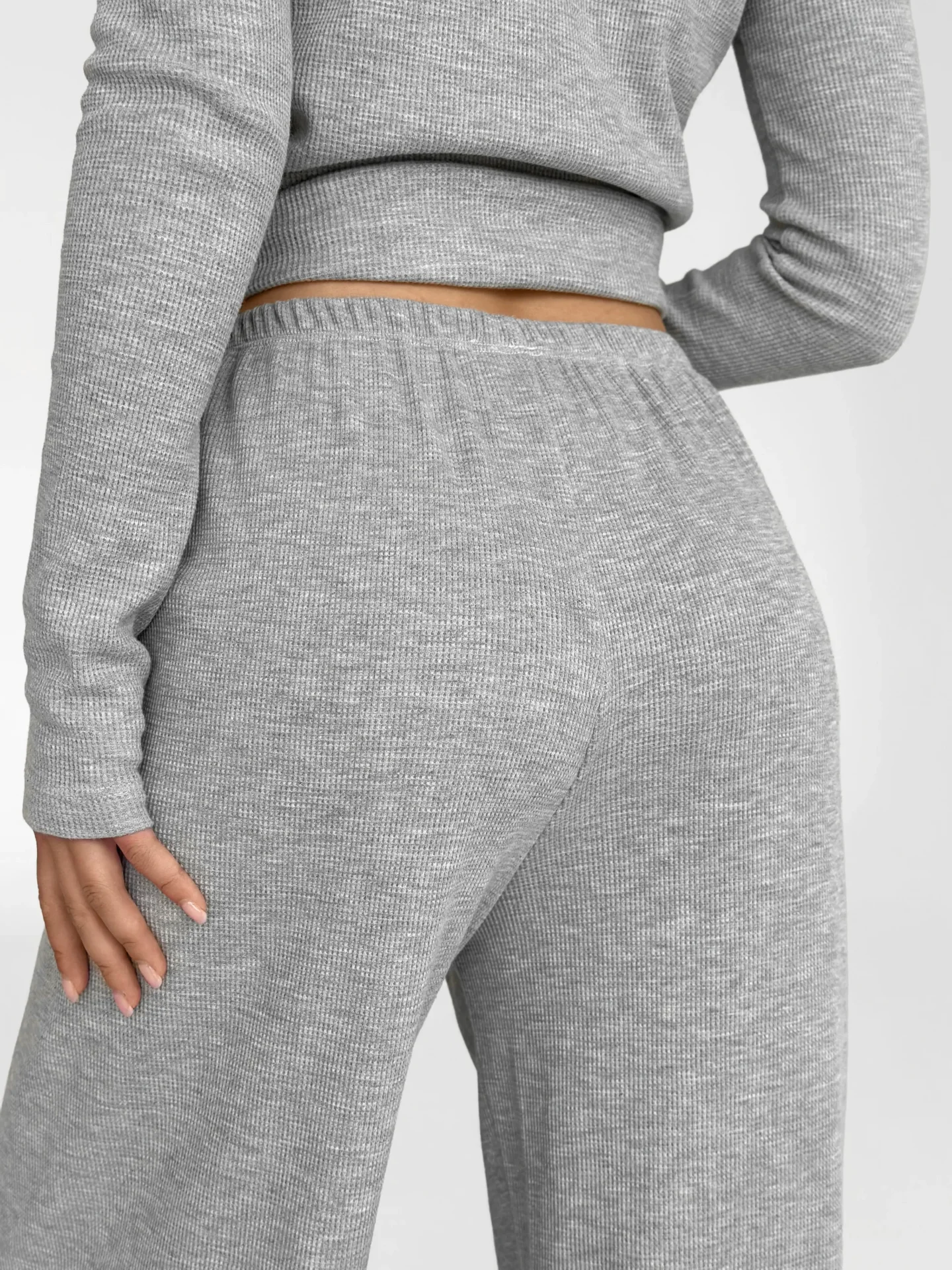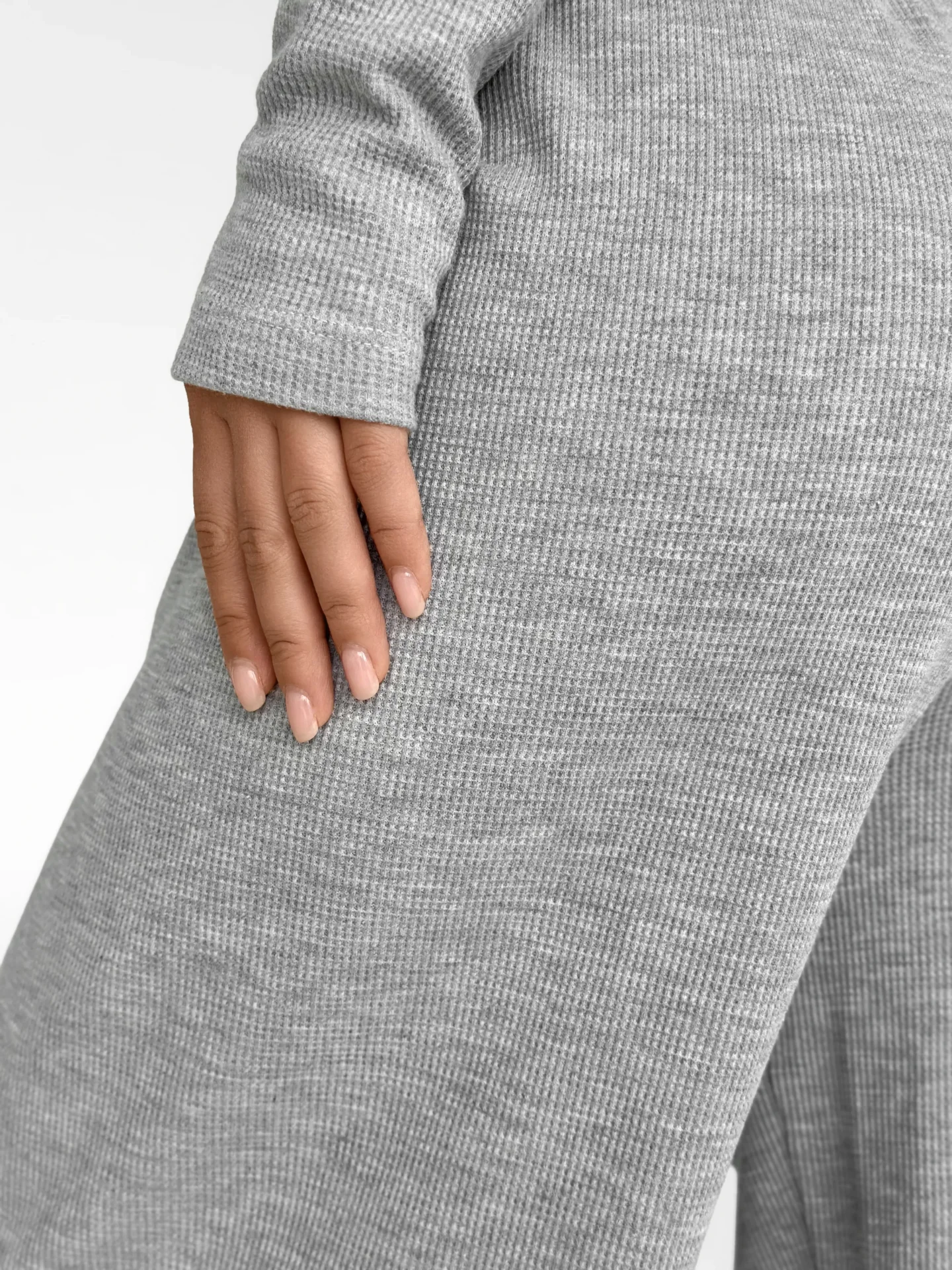 Szerokie spodnie z waflowej dzianiny łączą styl i komfort. Miękki, fakturowany materiał jest przyjemny w dotyku i zapewnia swobodę ruchów. Idealny wybór do przytulnego wypoczynku w domu lub tworzenia luźnych, codziennych stylizacji.