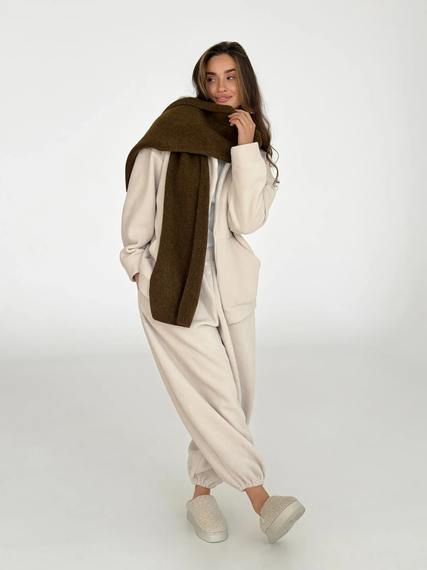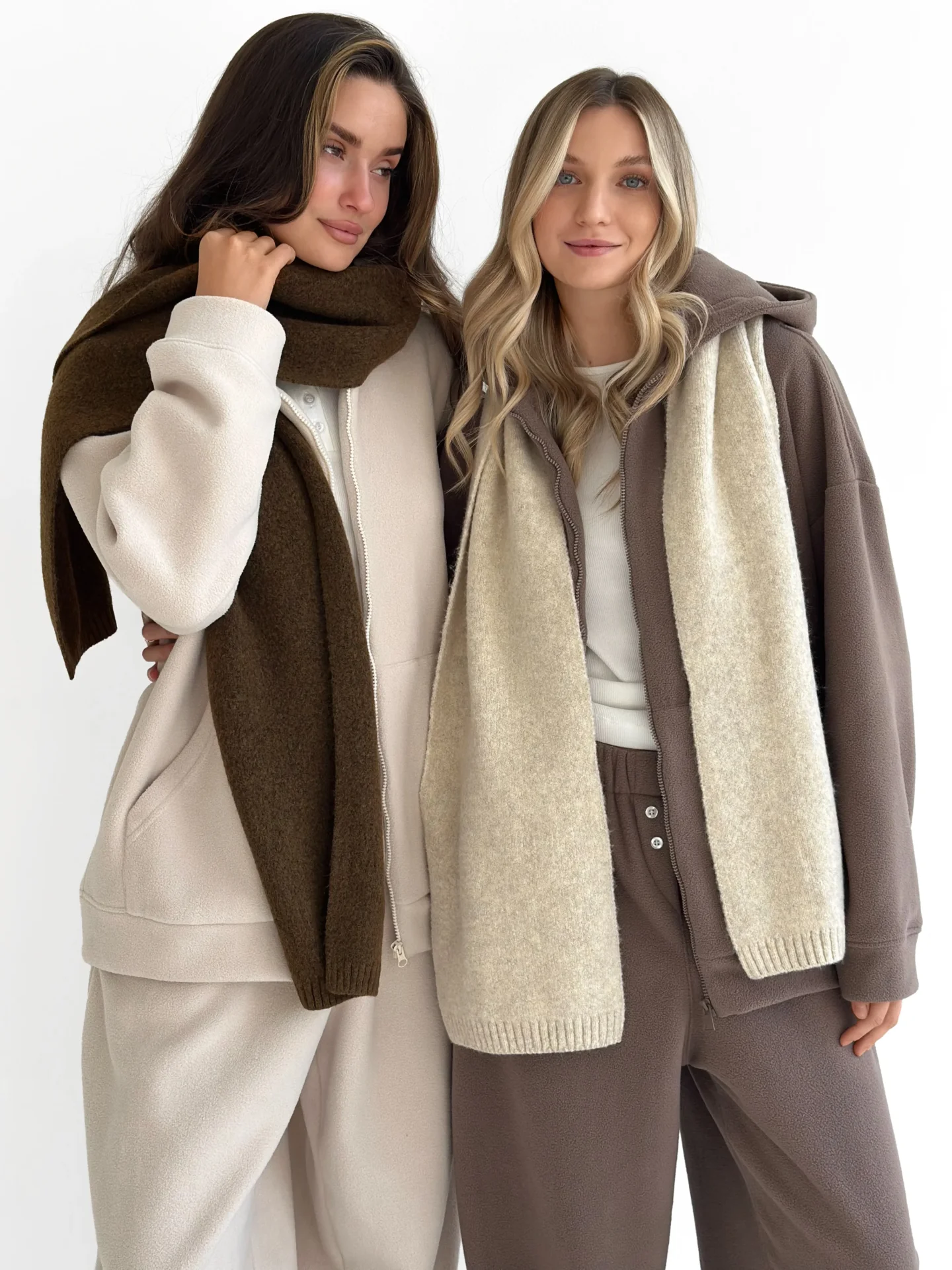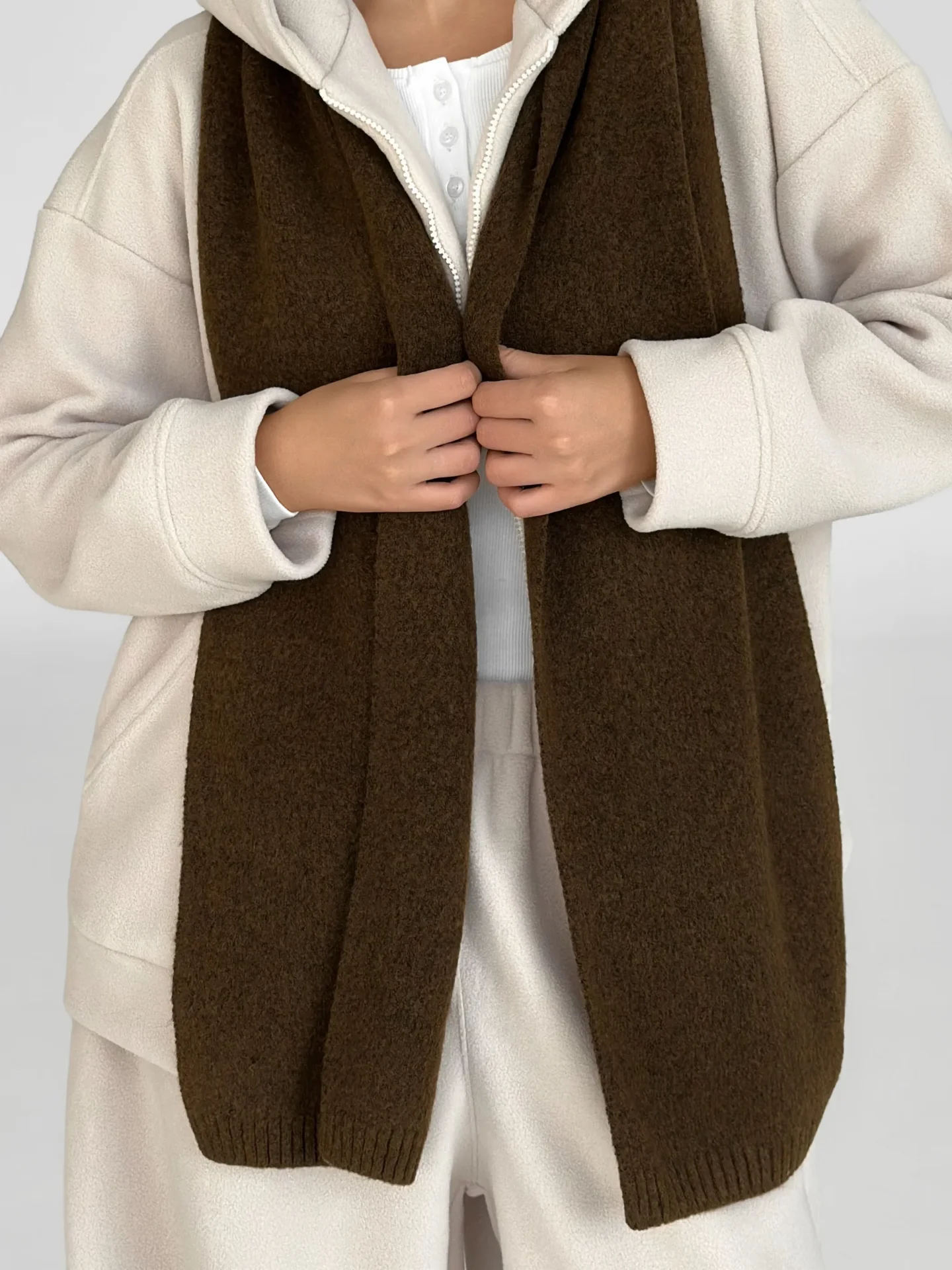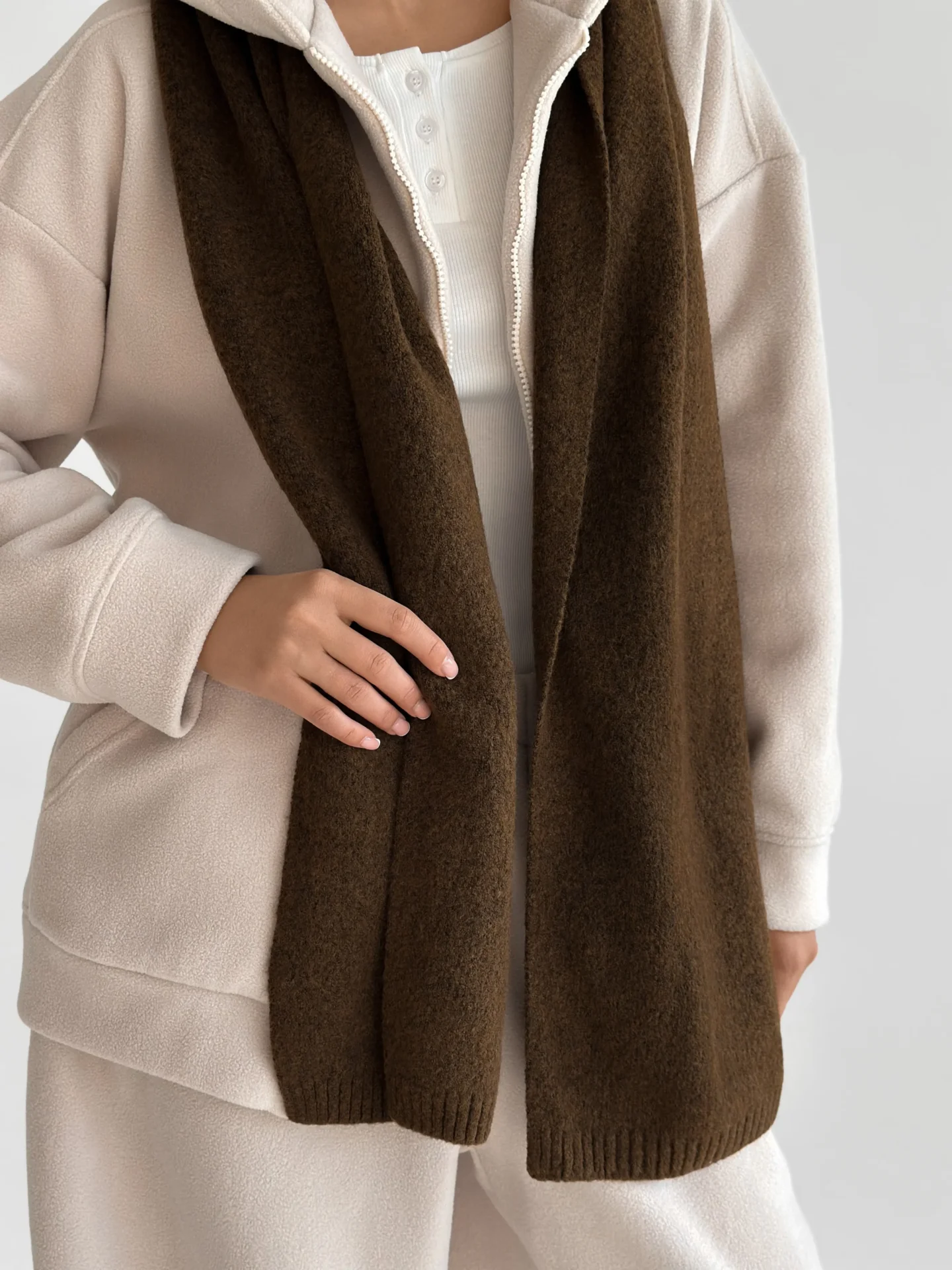 Szal wykonany z miękkiej, puszystej włóczki zapewnia uczucie ciepła i przytulności. Starannie wykonany splot i stonowane odcienie dodają elegancji każdej stylizacji. Idealny dodatek na zimowy sezon — doskonale pasuje do płaszcza, puchowej kurtki czy swetra.